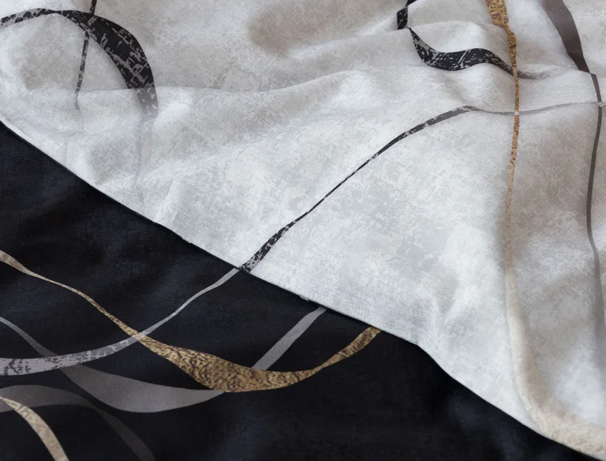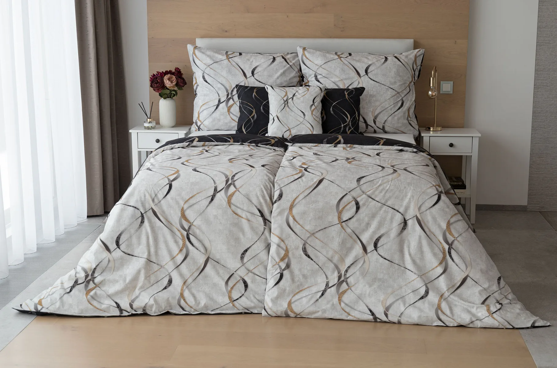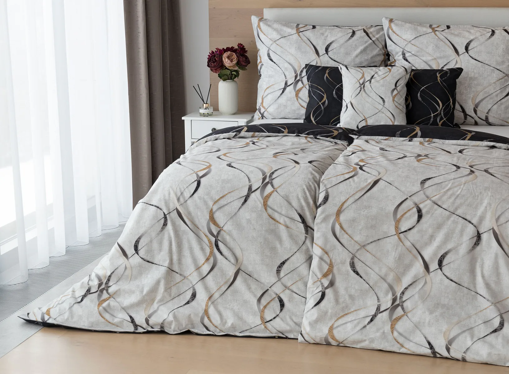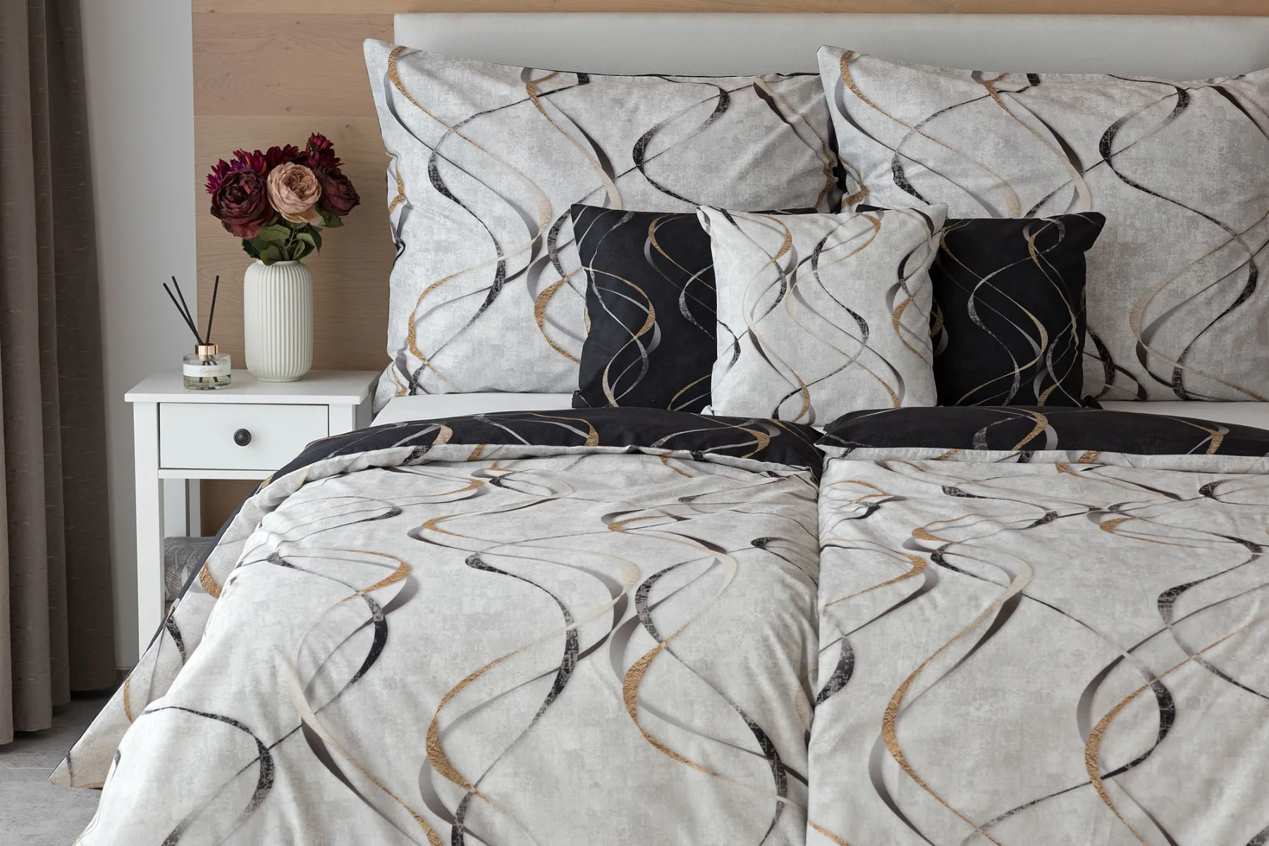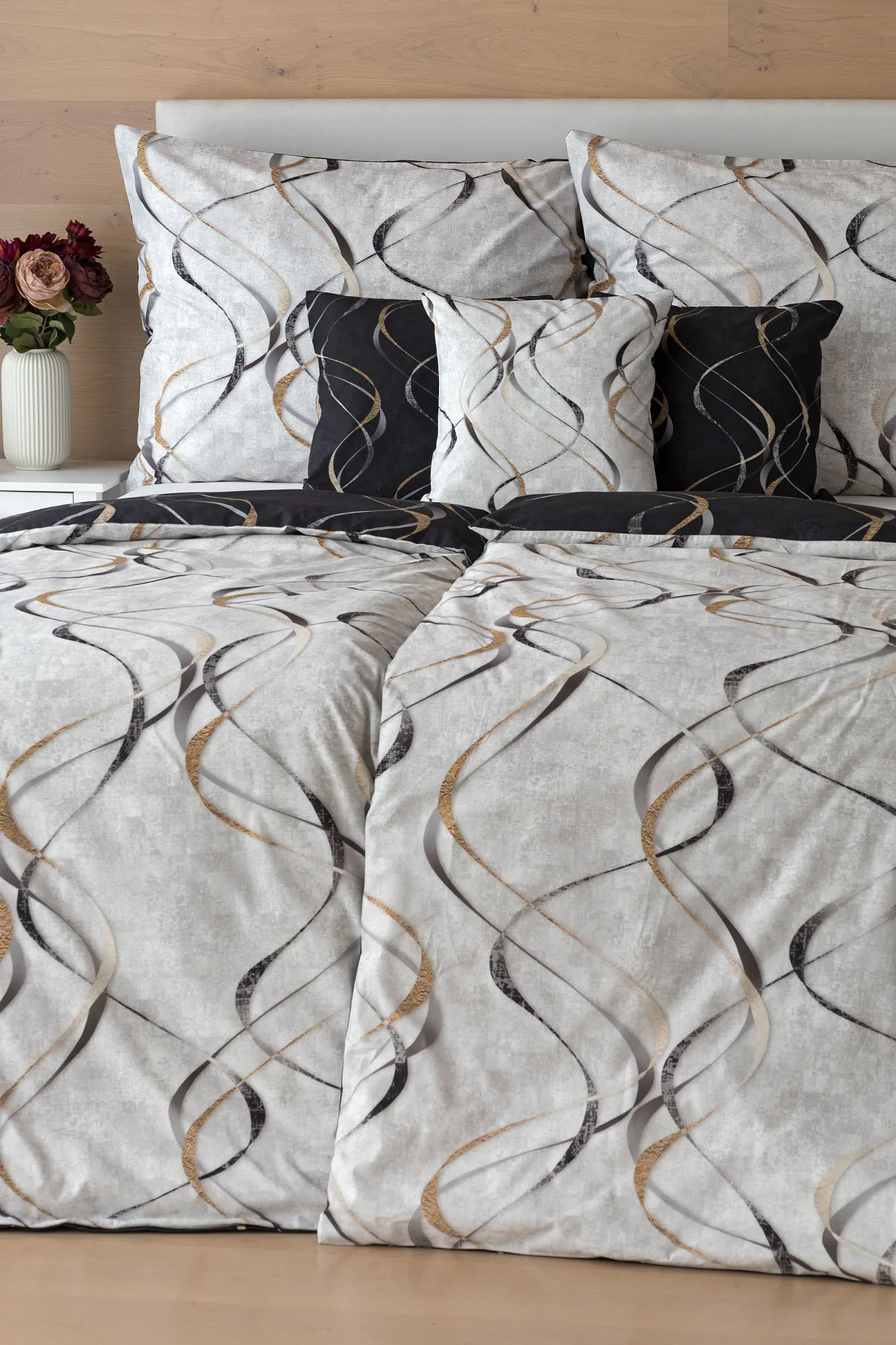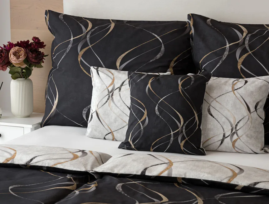 Vylaďte si ložnici podle nálady s elegantním bavlněným povlečením Kingston. Oblíbené oboustranné provedení vám umožní jednoduše změnit vzhled interiéru, aniž byste museli nutně převlékat. Jednoduchý motiv zvlněných šedozlatých linek se prolíná na černém a světle šedém podkladu. Originální vzhled vzoru podtrhuje tzv. Grunge textura, která vyniká díky preciznímu digitálnímu tisku