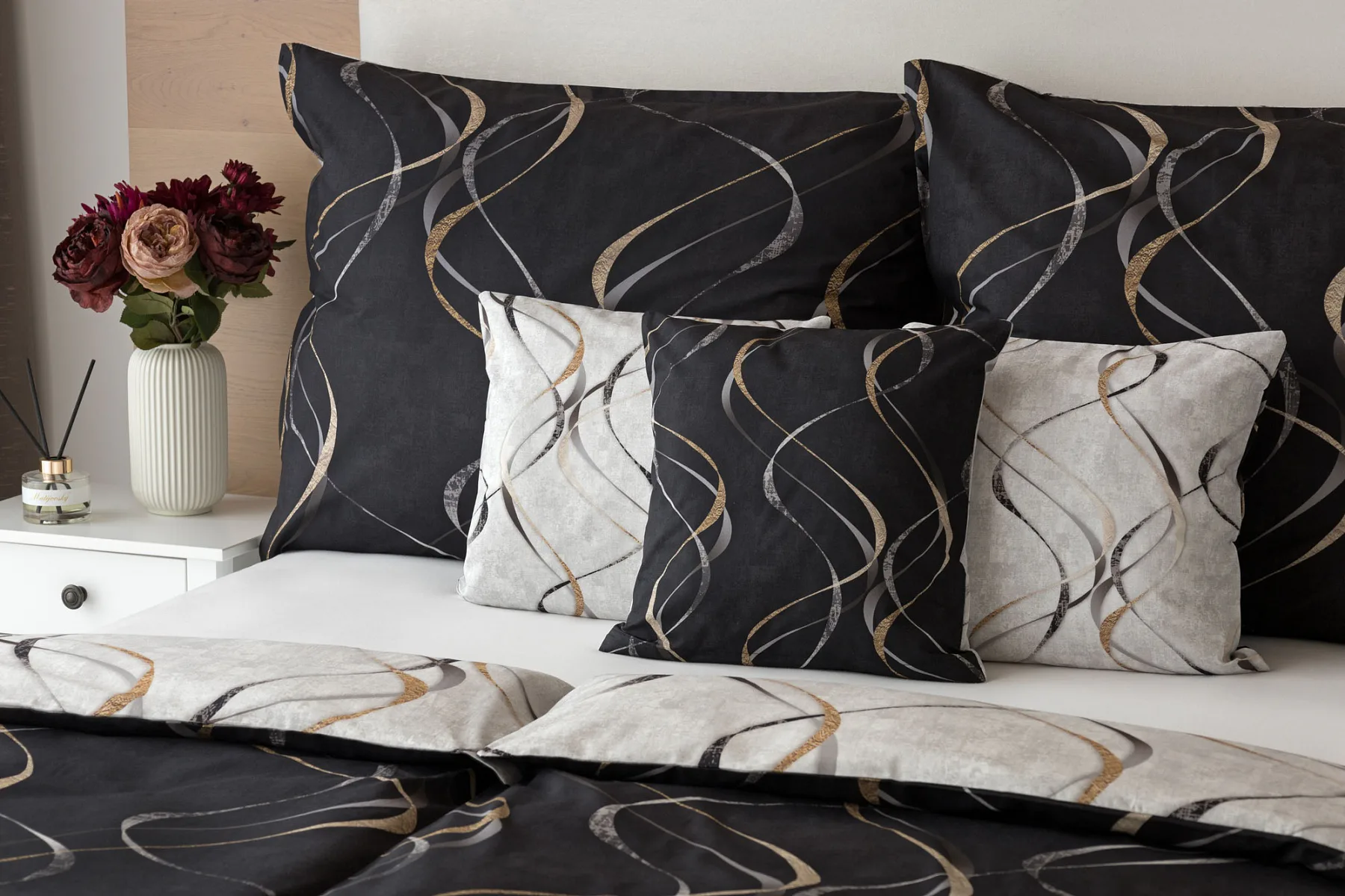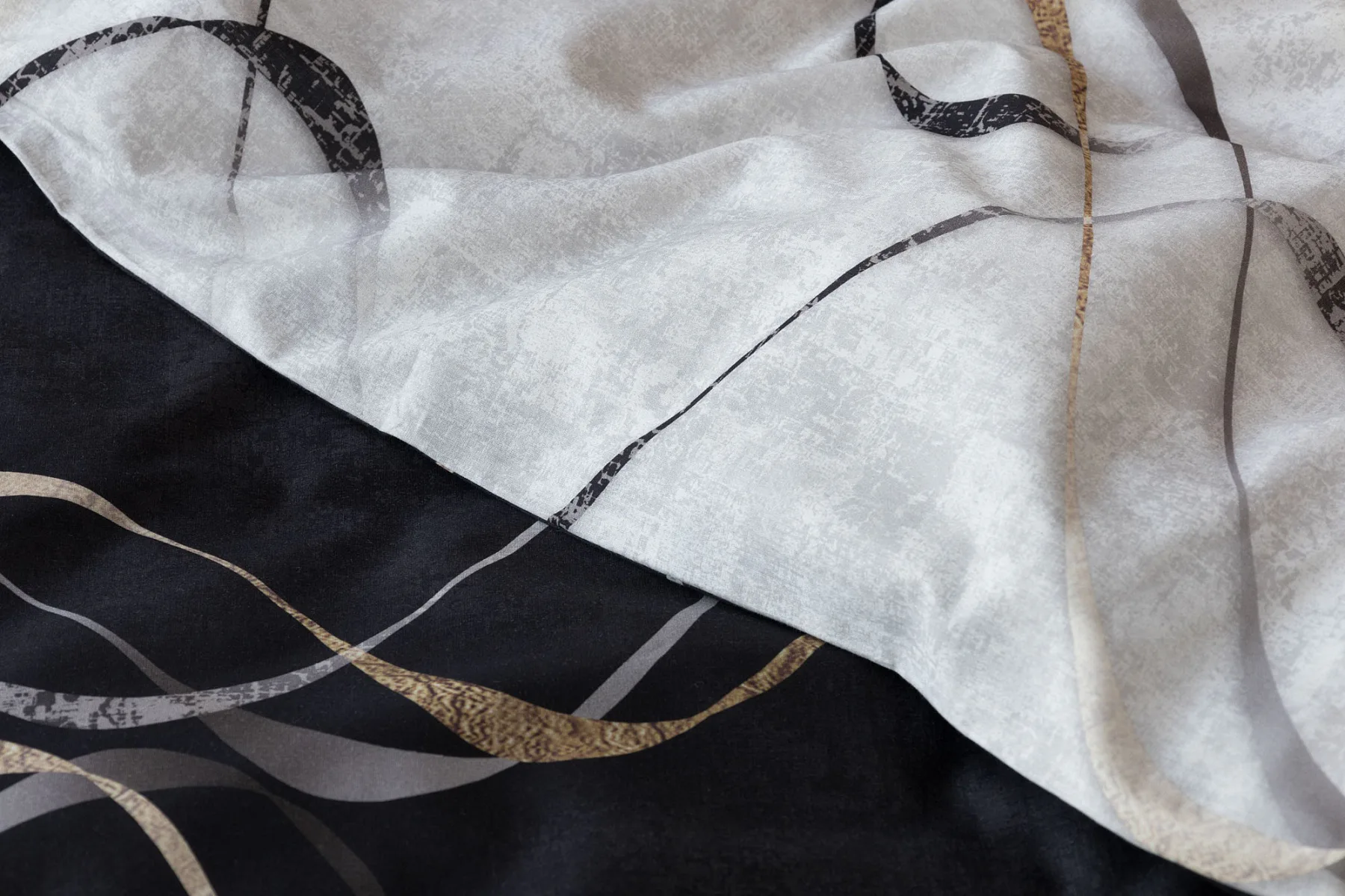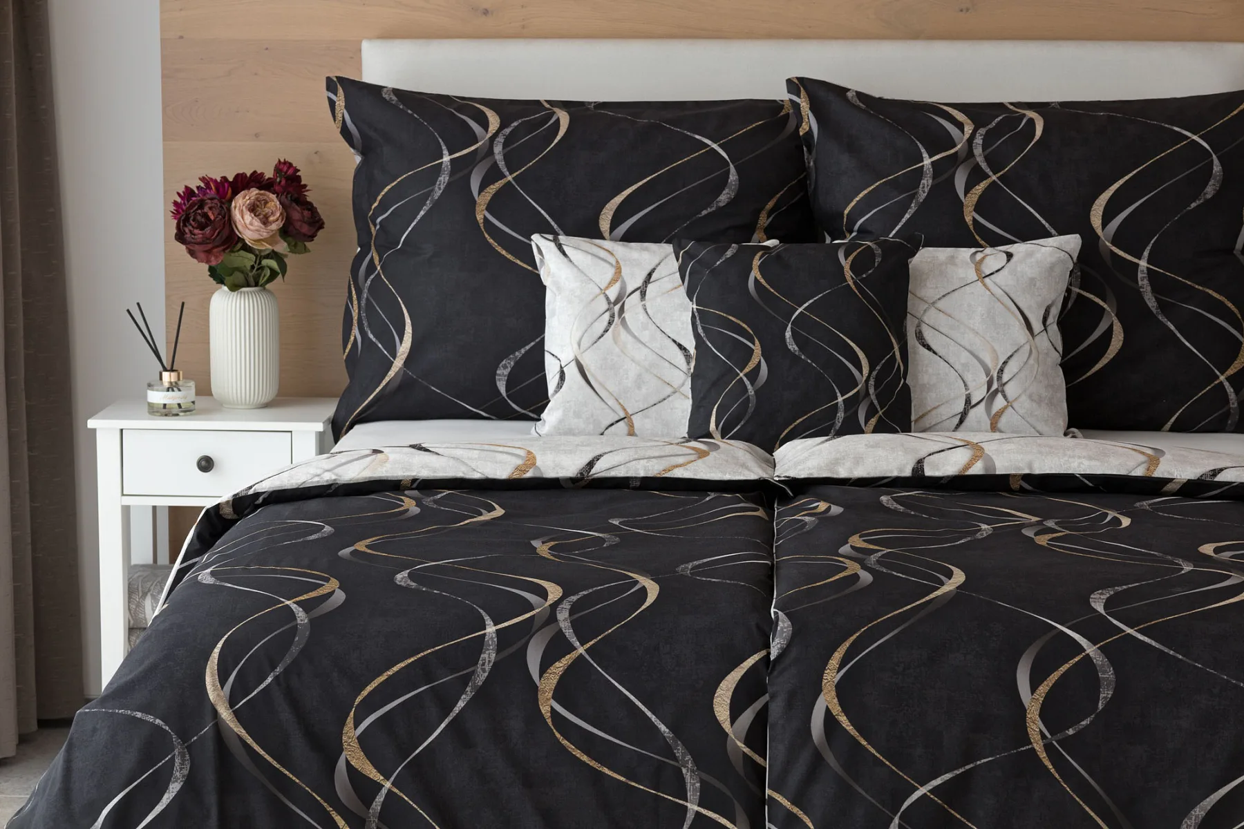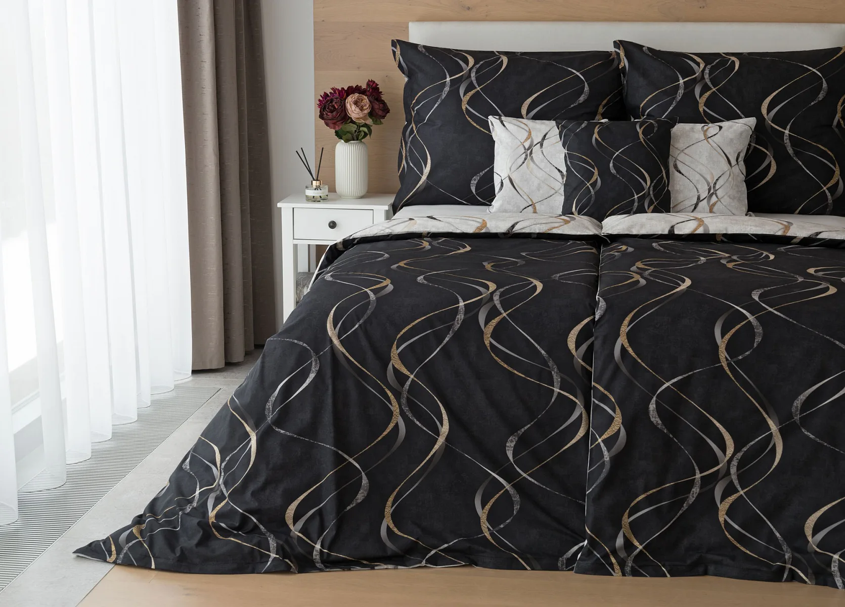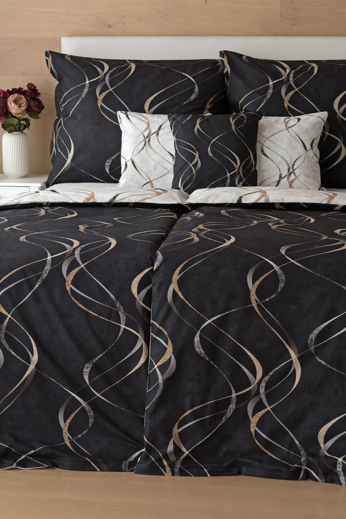 Vylaďte si ložnici podle nálady s elegantním bavlněným povlečením Kingston. Oblíbené oboustranné provedení vám umožní jednoduše změnit vzhled interiéru, aniž byste museli nutně převlékat. Jednoduchý motiv zvlněných šedozlatých linek se prolíná na černém a světle šedém podkladu. Originální vzhled vzoru podtrhuje tzv. Grunge textura, která vyniká díky preciznímu digitálnímu tisku