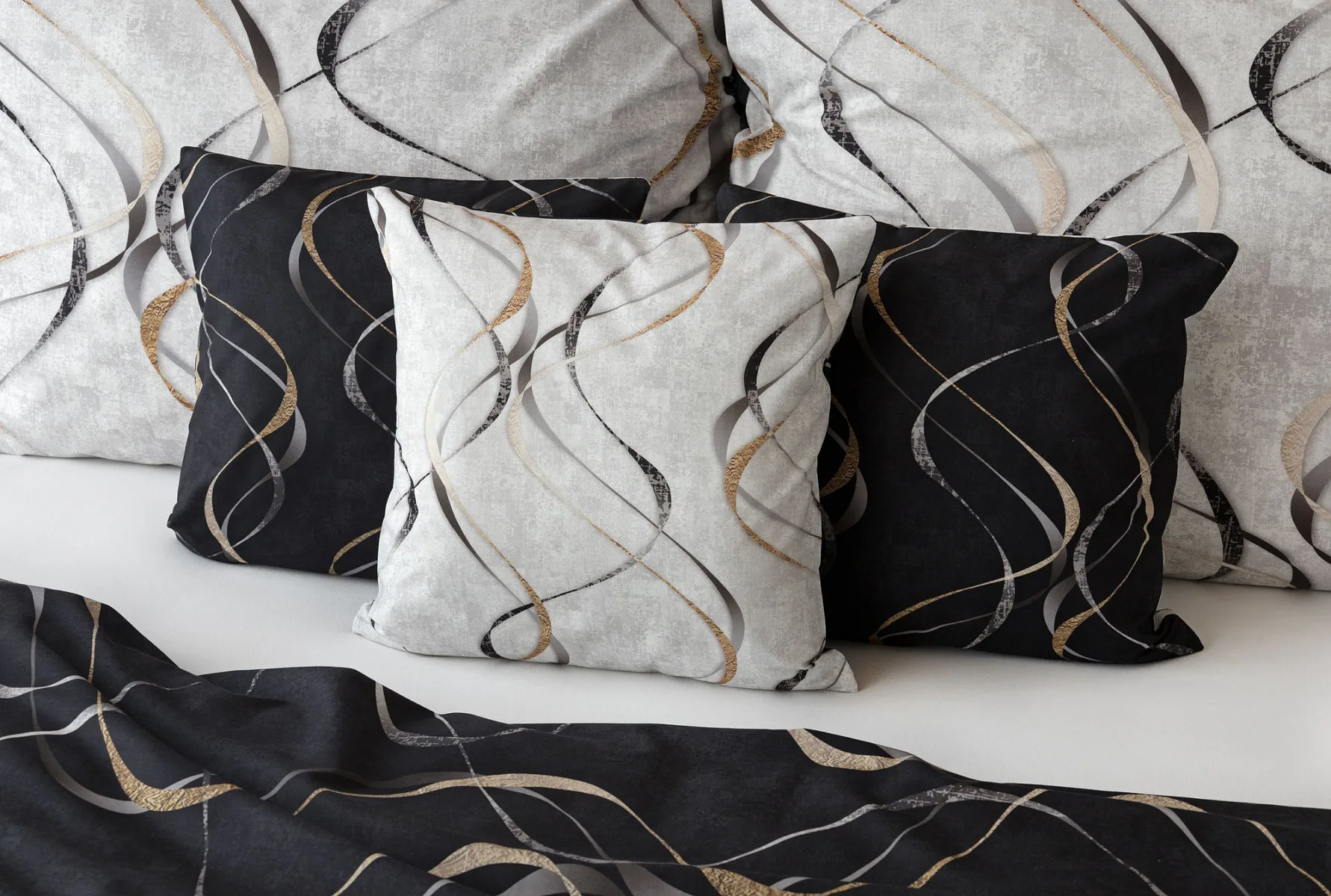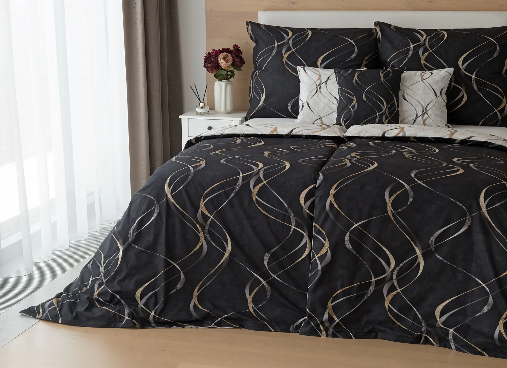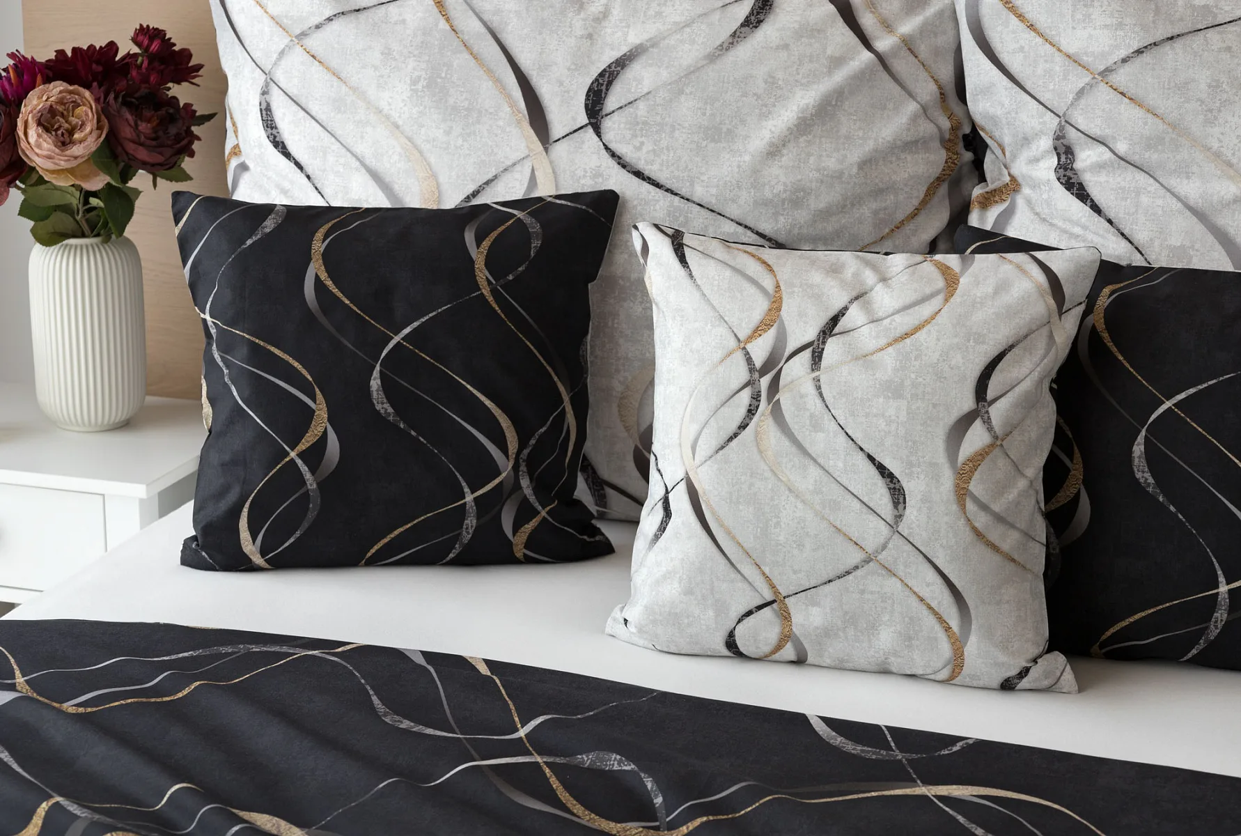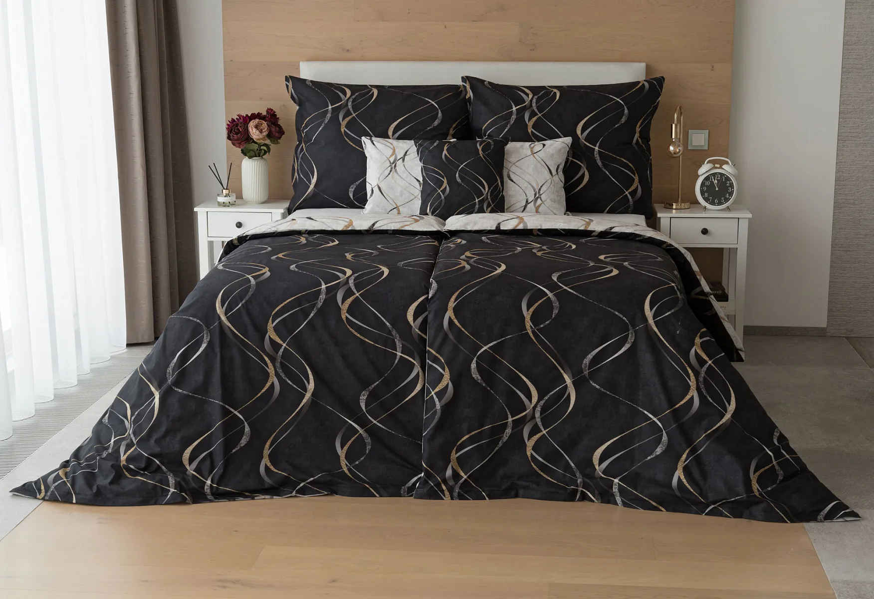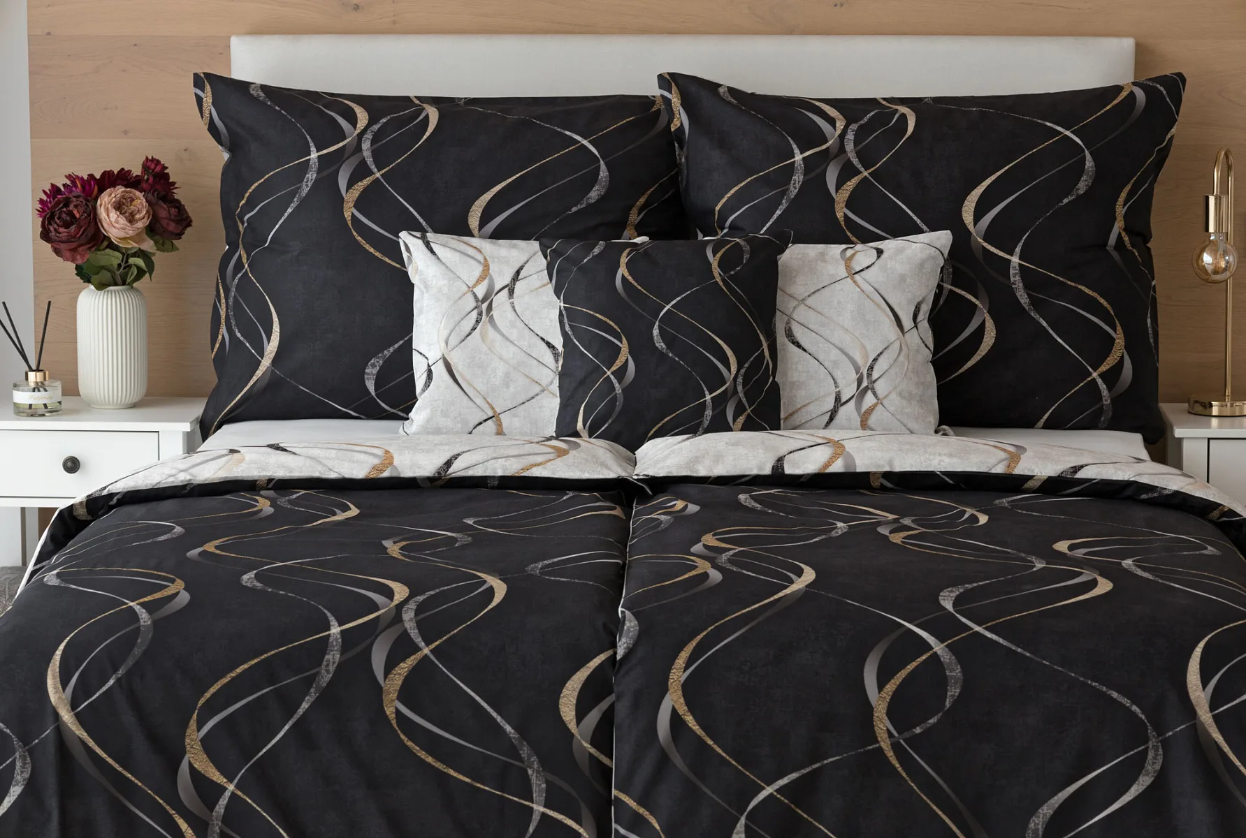Vylaďte si ložnici podle nálady s elegantním bavlněným povlečením Kingston. Oblíbené oboustranné provedení vám umožní jednoduše změnit vzhled interiéru, aniž byste museli nutně převlékat. Jednoduchý motiv zvlněných šedozlatých linek se prolíná na černém a světle šedém podkladu. Originální vzhled vzoru podtrhuje tzv. Grunge textura, která vyniká díky preciznímu digitálnímu tisku