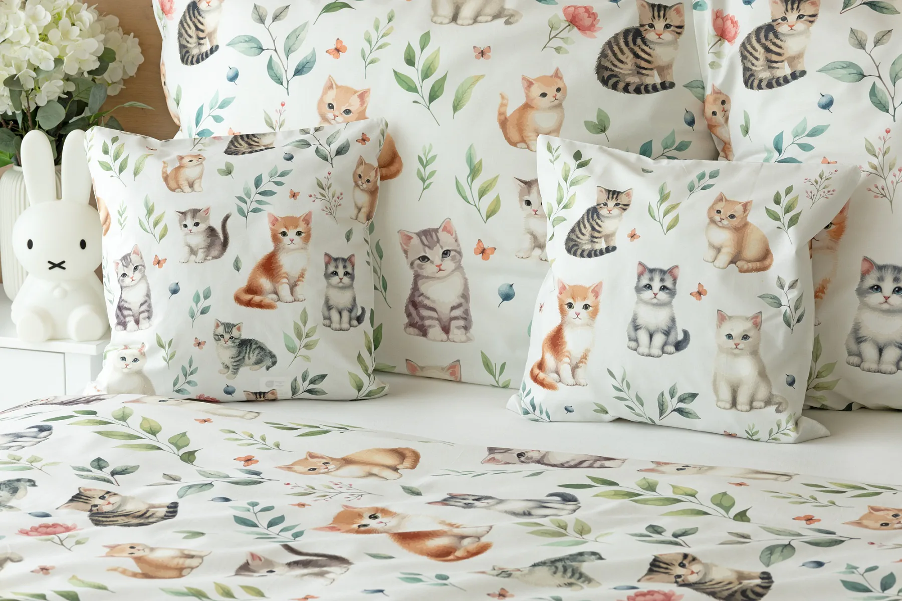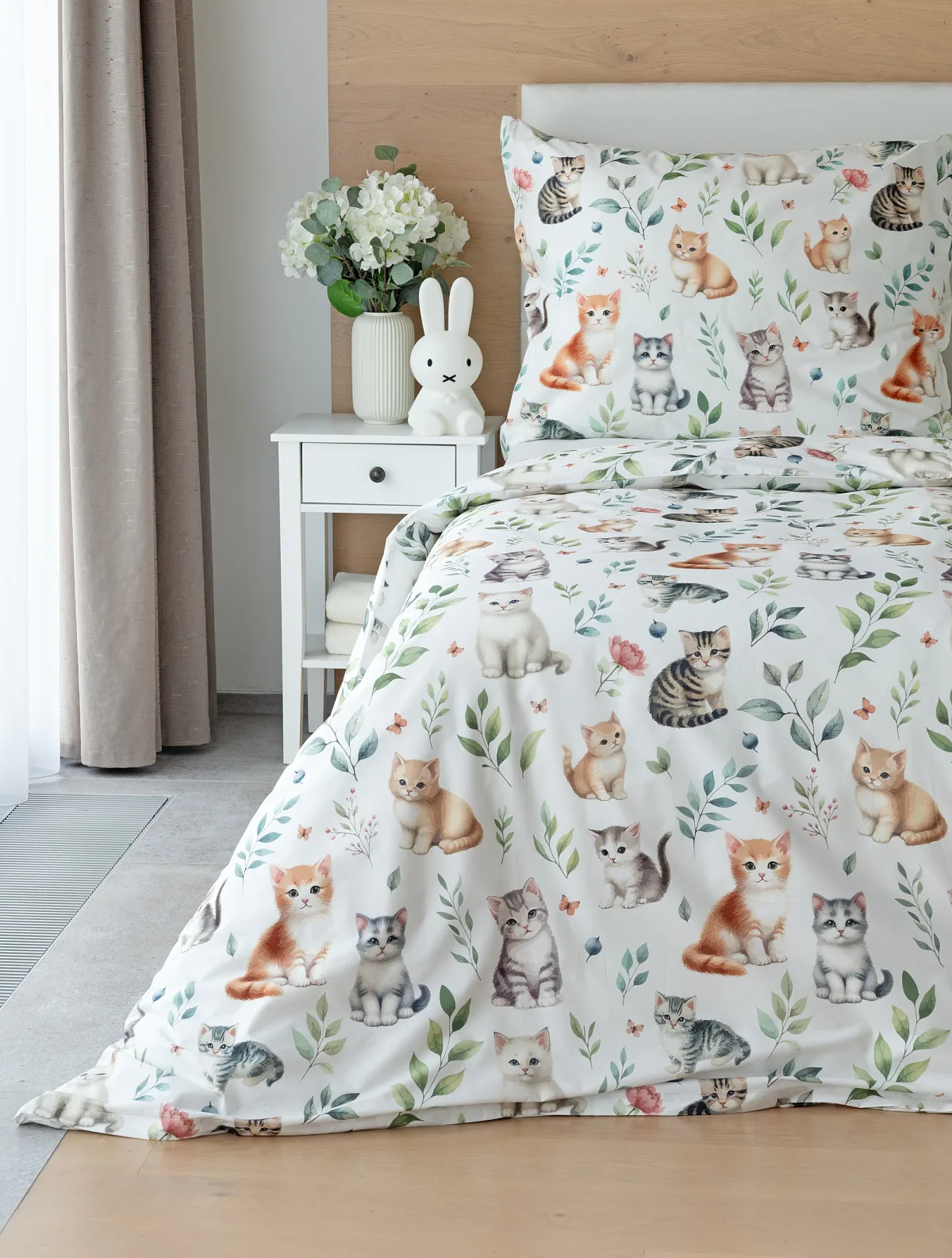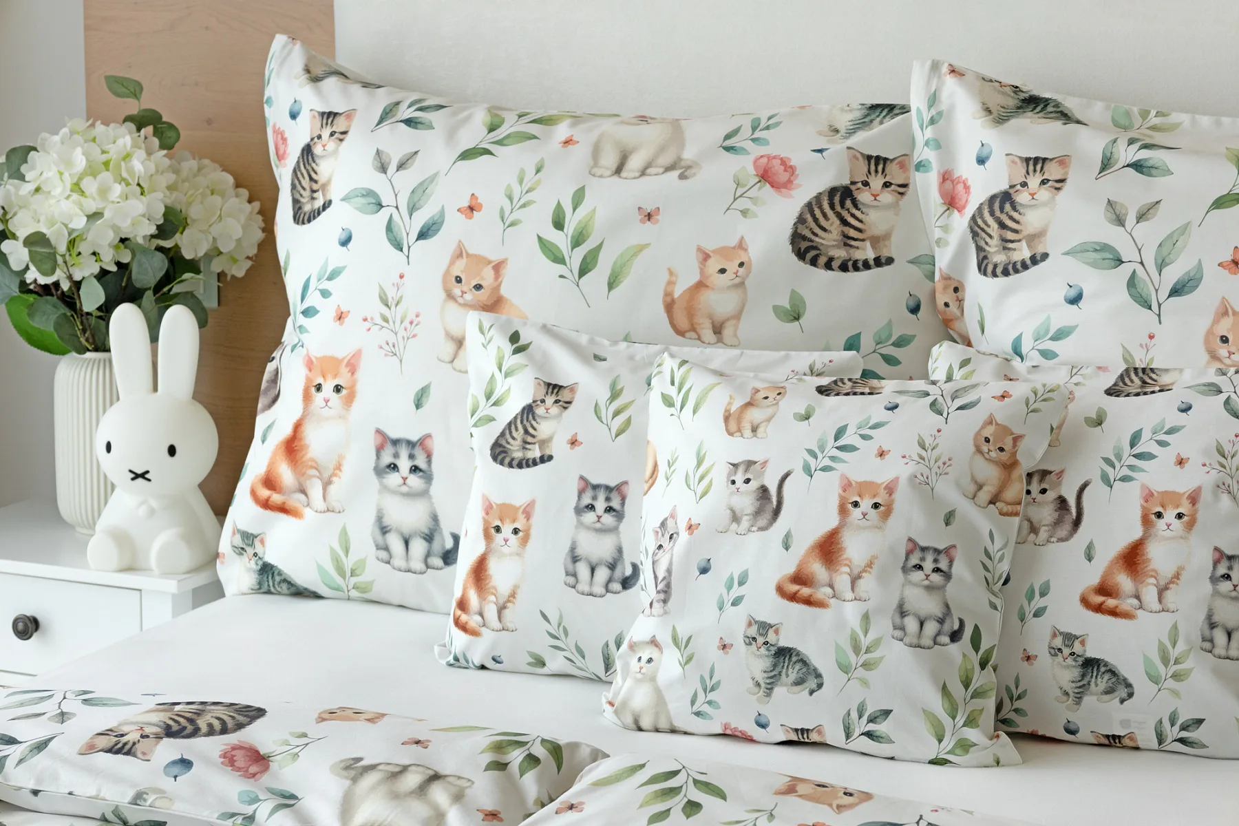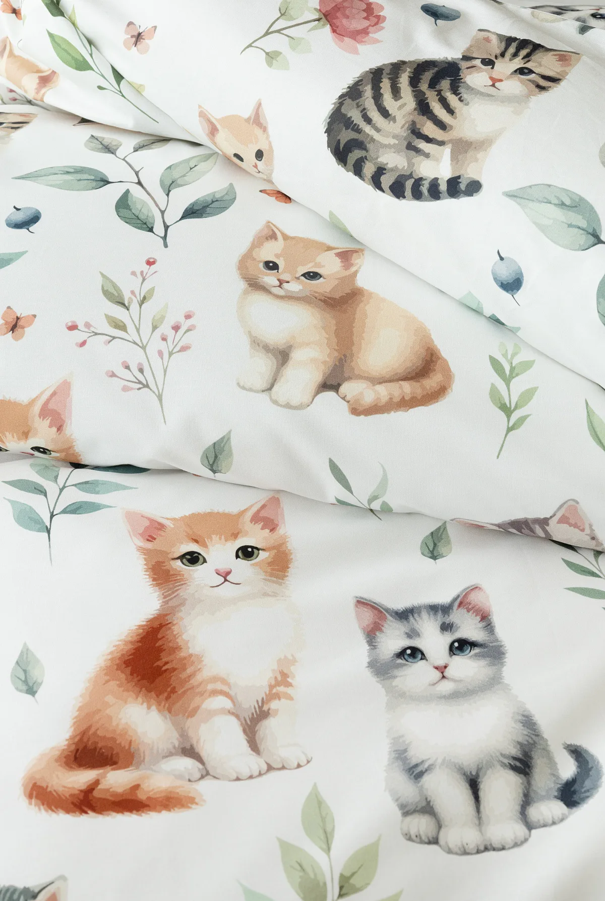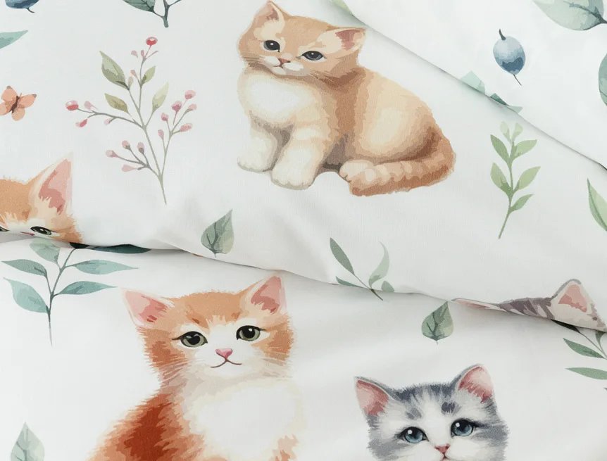 Povlak na polštář i na přikrývku zachycuje z obou stran motiv koťátek. Povlečení je vyrobeno ze 100% bavlny a je opatřeno praktickým zipovým uzávěrem.