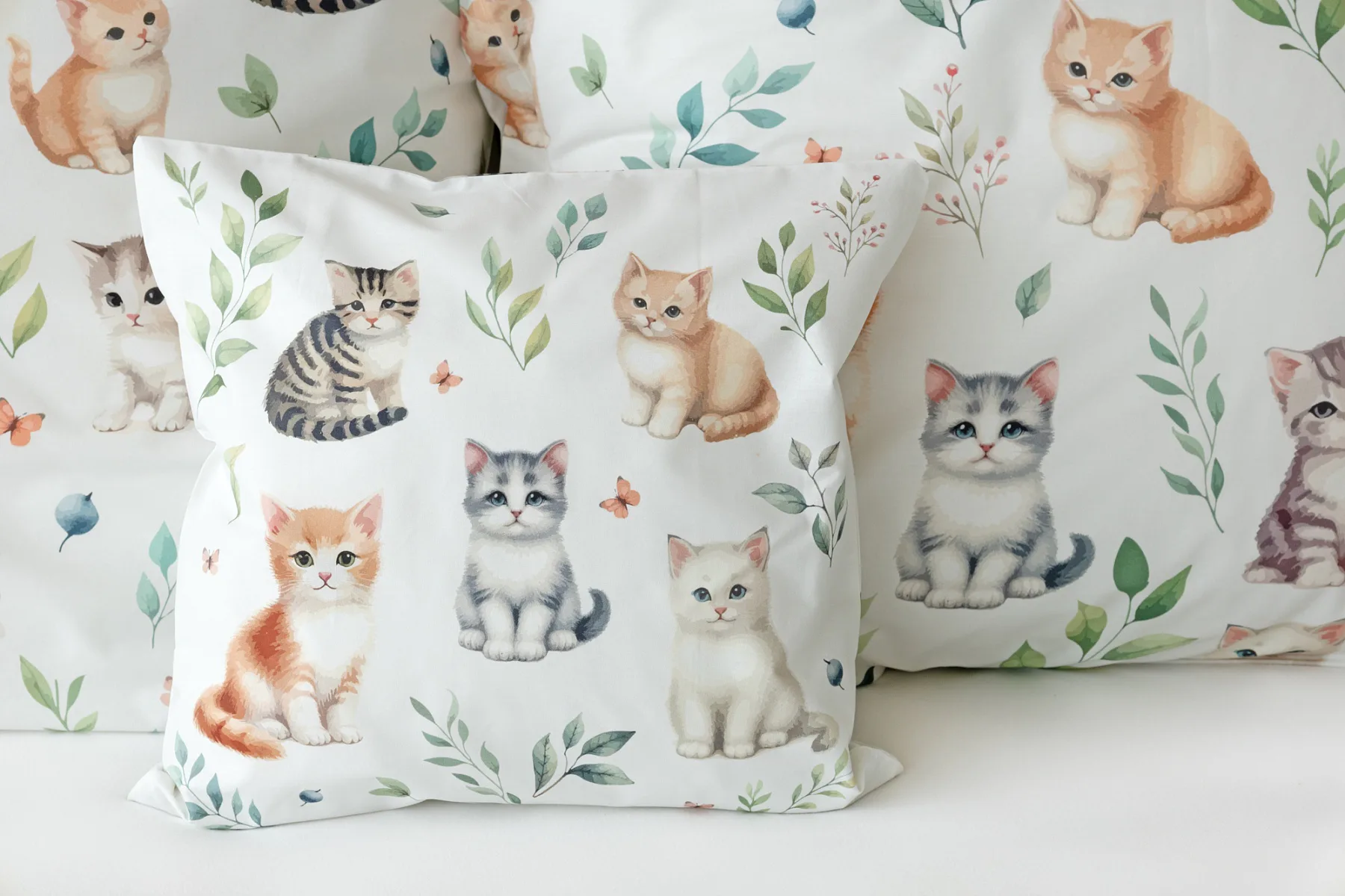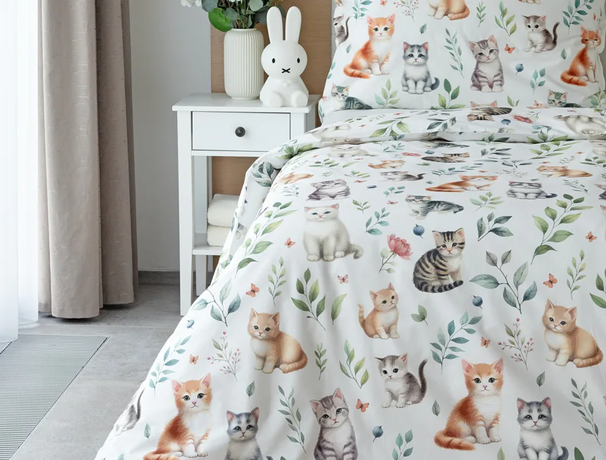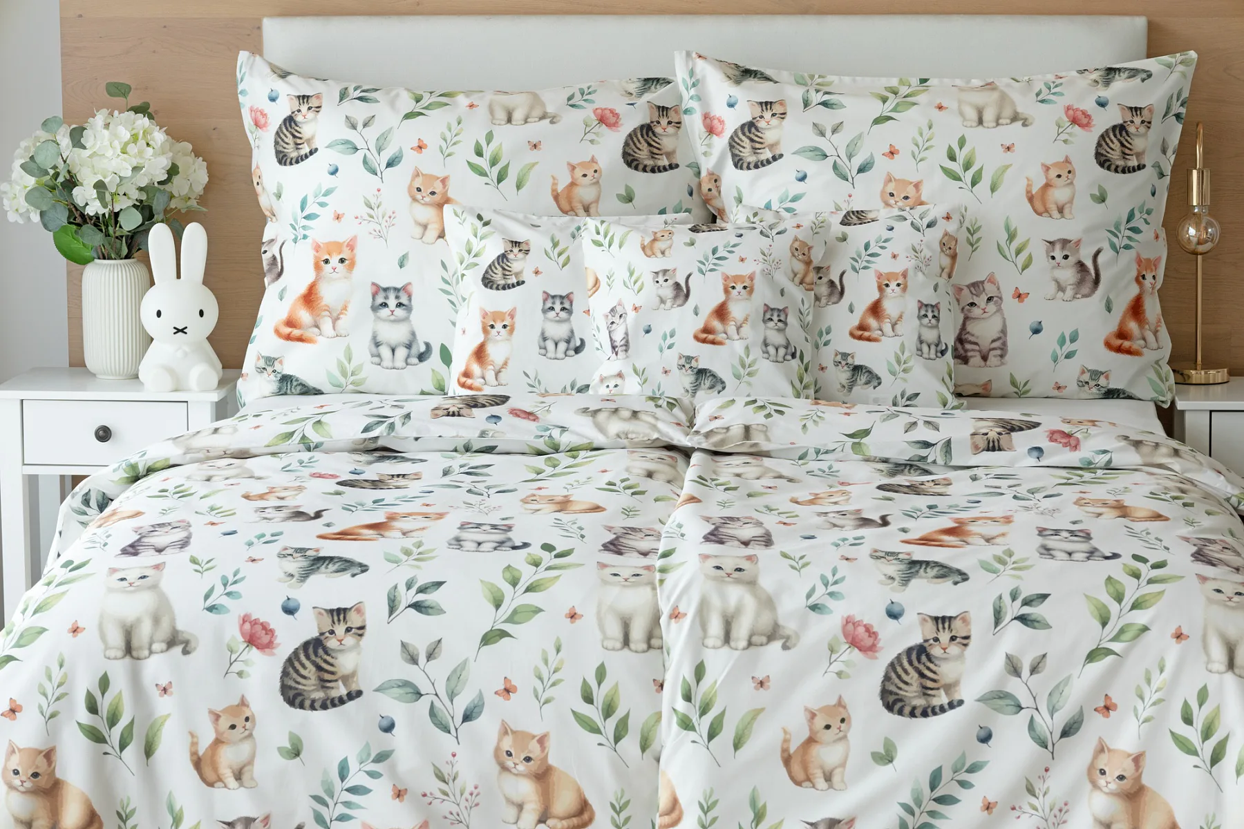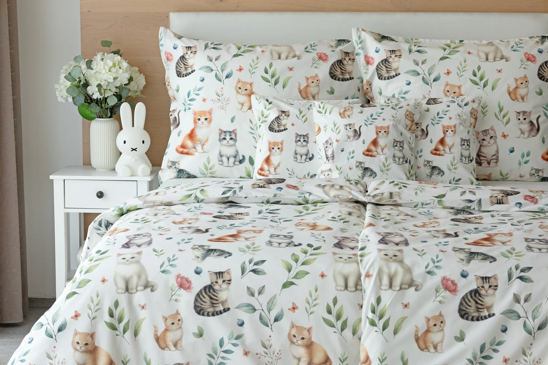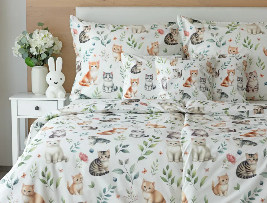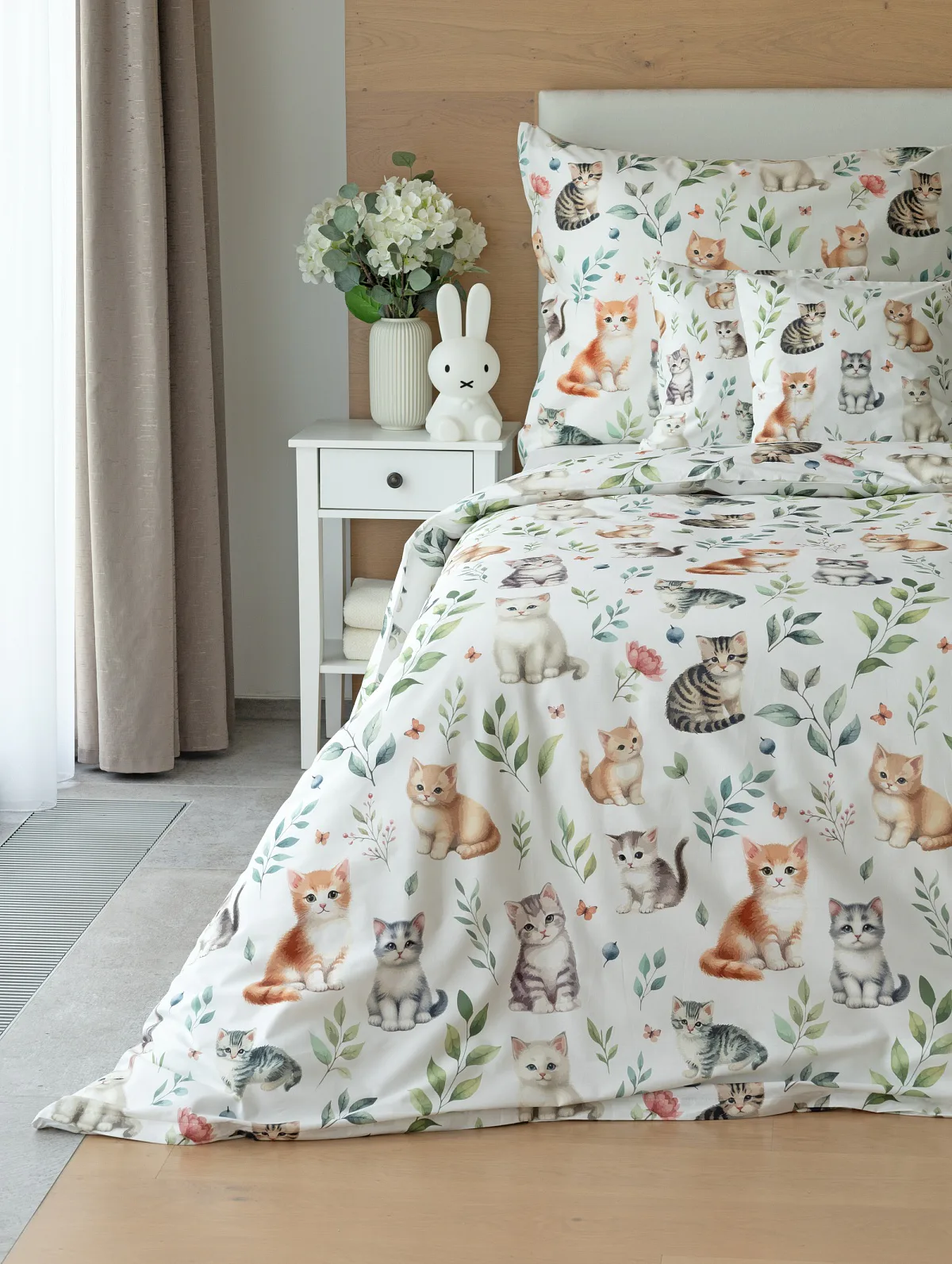 Povlak na polštář i na přikrývku zachycuje z obou stran motiv koťátek. Povlečení je vyrobeno ze 100% bavlny a je opatřeno praktickým zipovým uzávěrem.