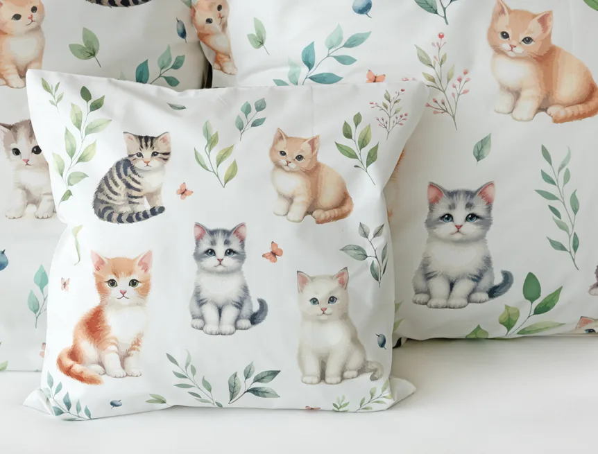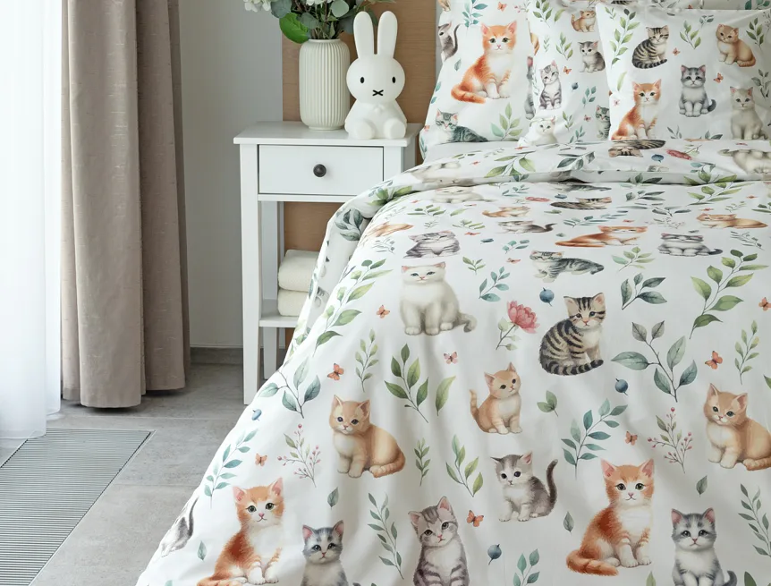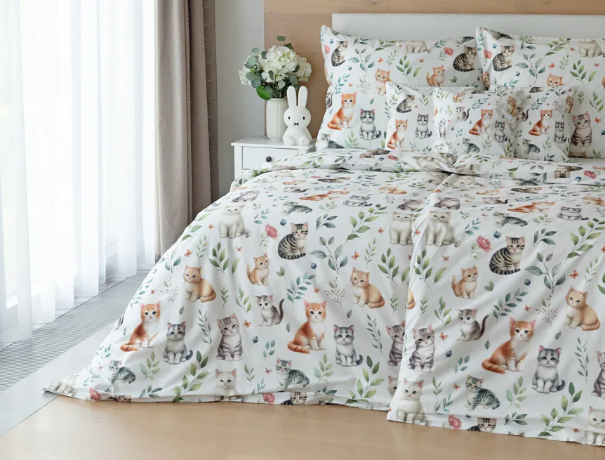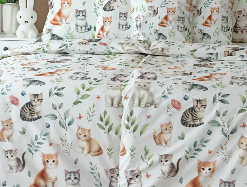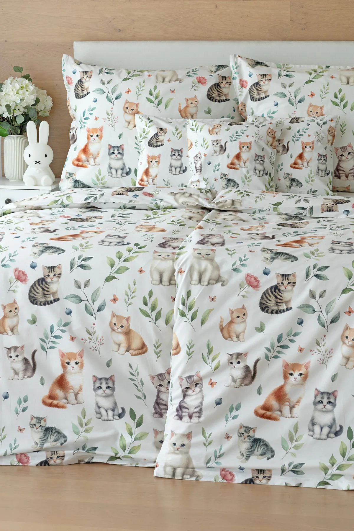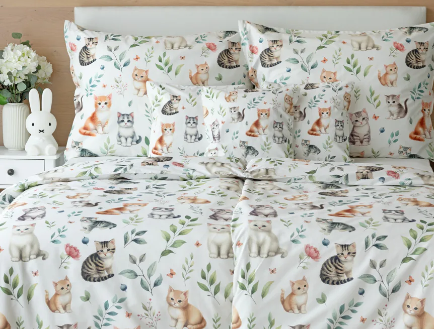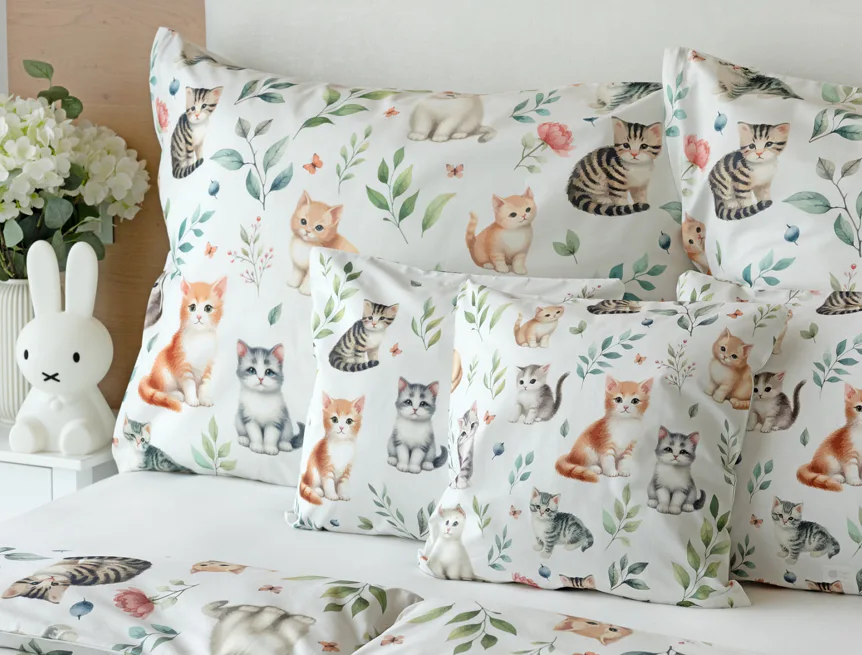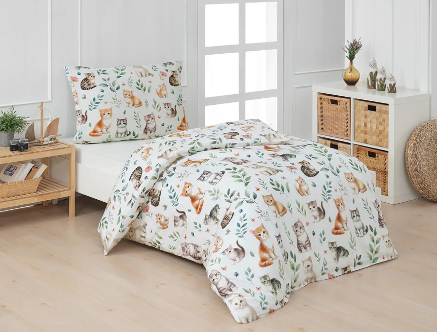 Povlak na polštář i na přikrývku zachycuje z obou stran motiv koťátek. Povlečení je vyrobeno ze 100% bavlny a je opatřeno praktickým zipovým uzávěrem.