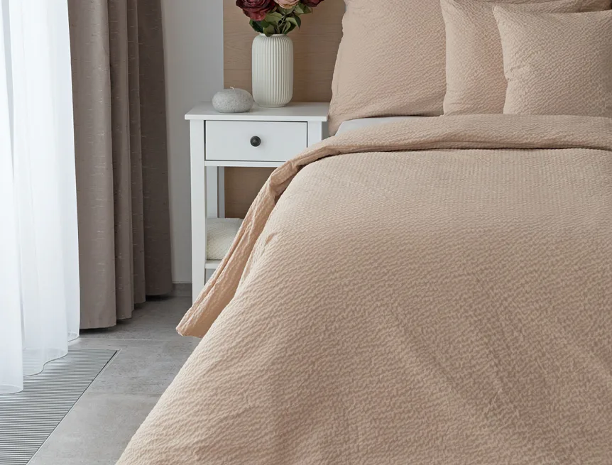 Krep je velmi oblíbený materiál především díky tomu, že nevyžaduje žehlení. Po vyprání si zachovává svůj charakteristický povrch a žehlením by mohlo dojít k narušení jeho typické krepové struktury, proto žehlení krepového povlečení nedoporučujeme.