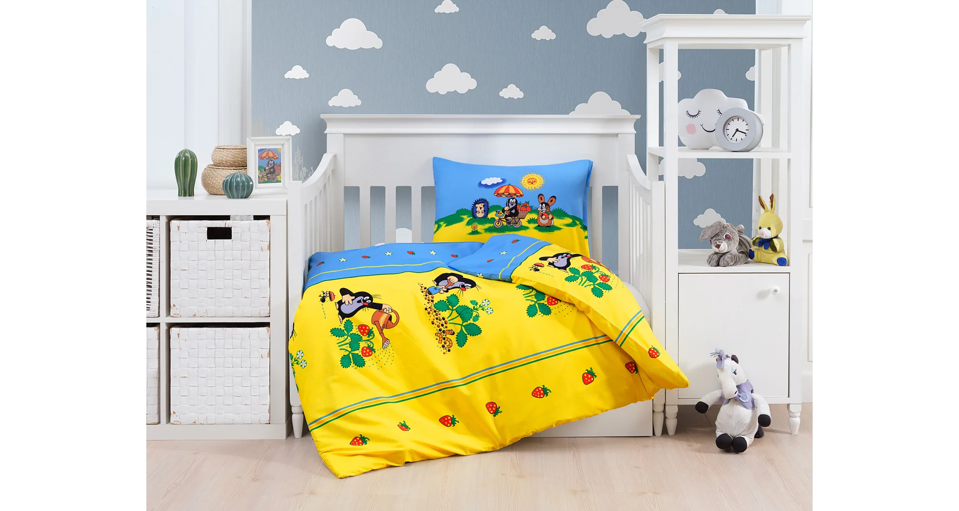 Dětské povlečení Krtek a jahůdky s veselými postavičkami Krtka a jeho kamarádů rozveselí dětskou postýlku a dětem se v něm bude krásně usínat.