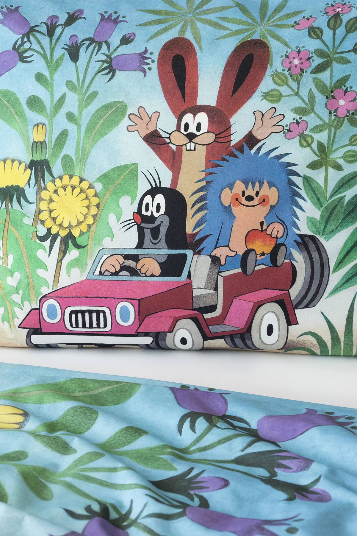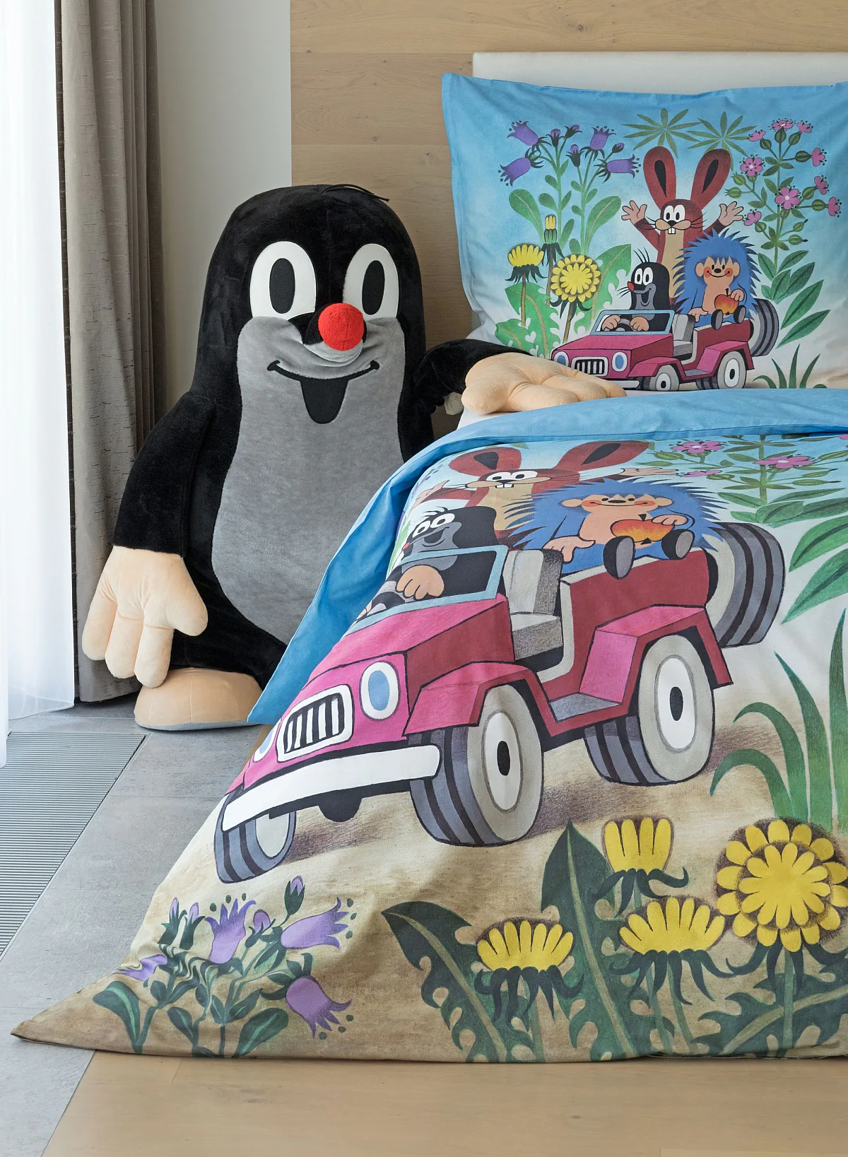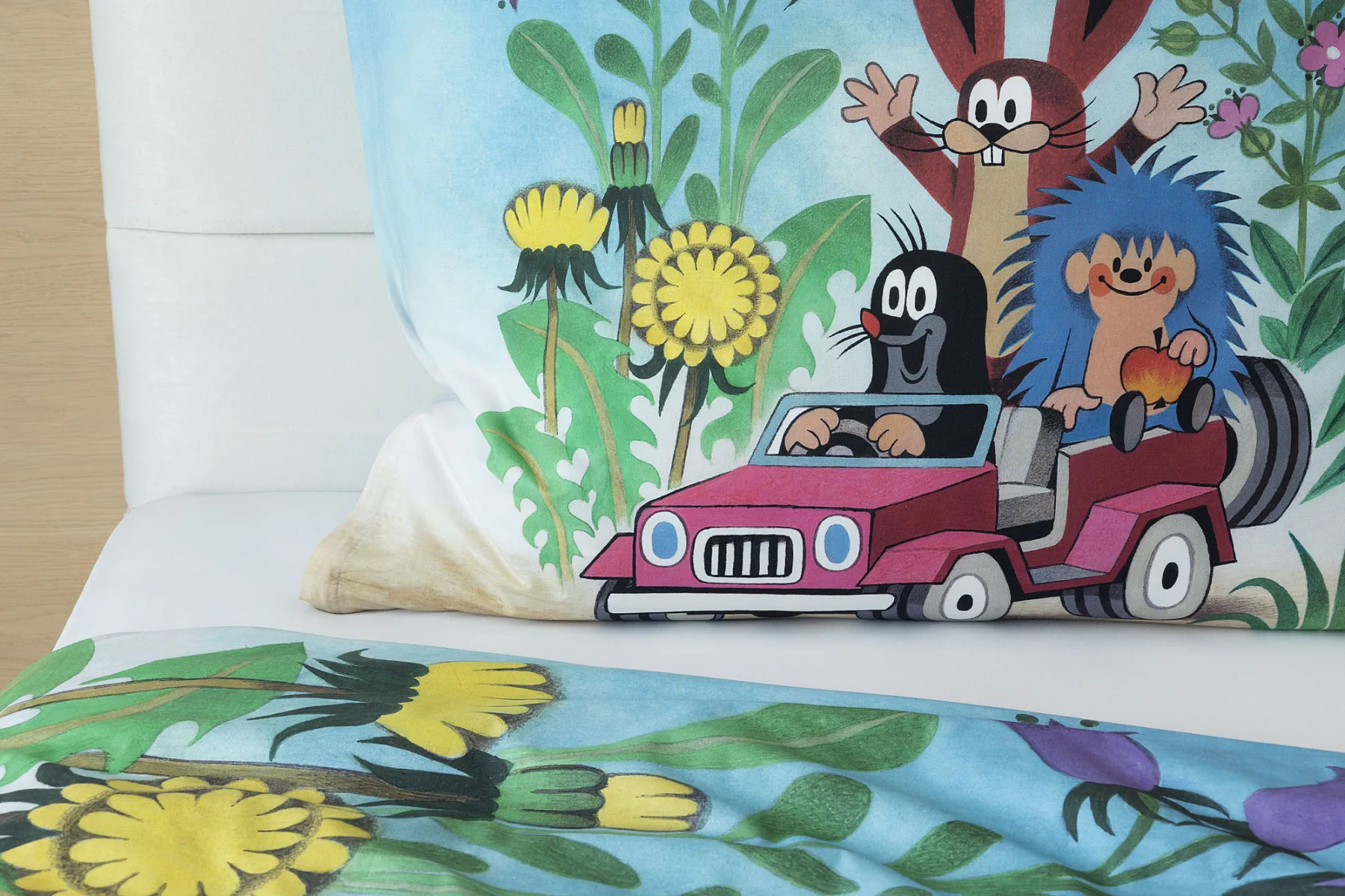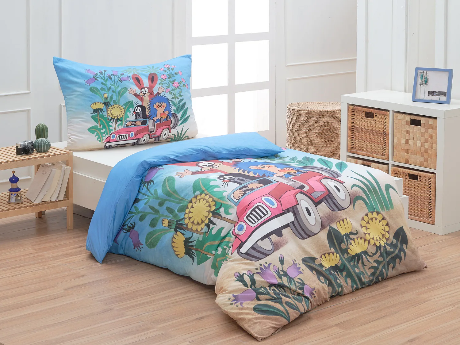 Dětské povlečení Krtek v autě s veselými postavičkami Krtka a jeho kamarádů rozveselí dětskou postýlku a dětem se v něm bude krásně usínat.