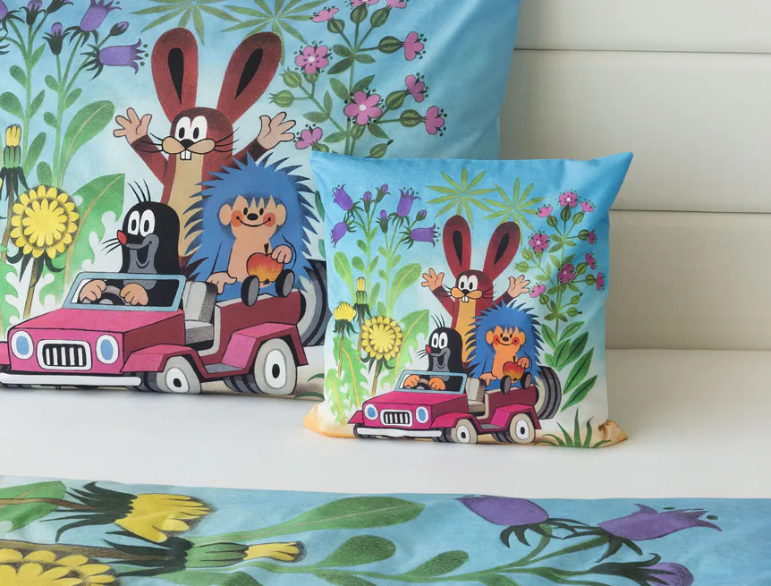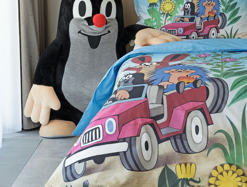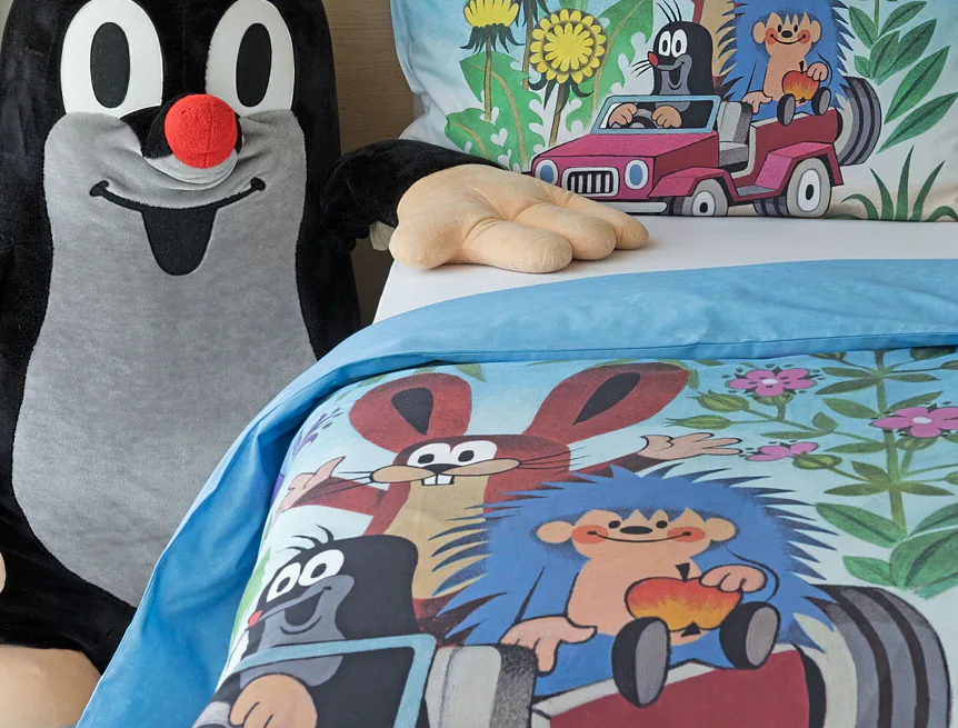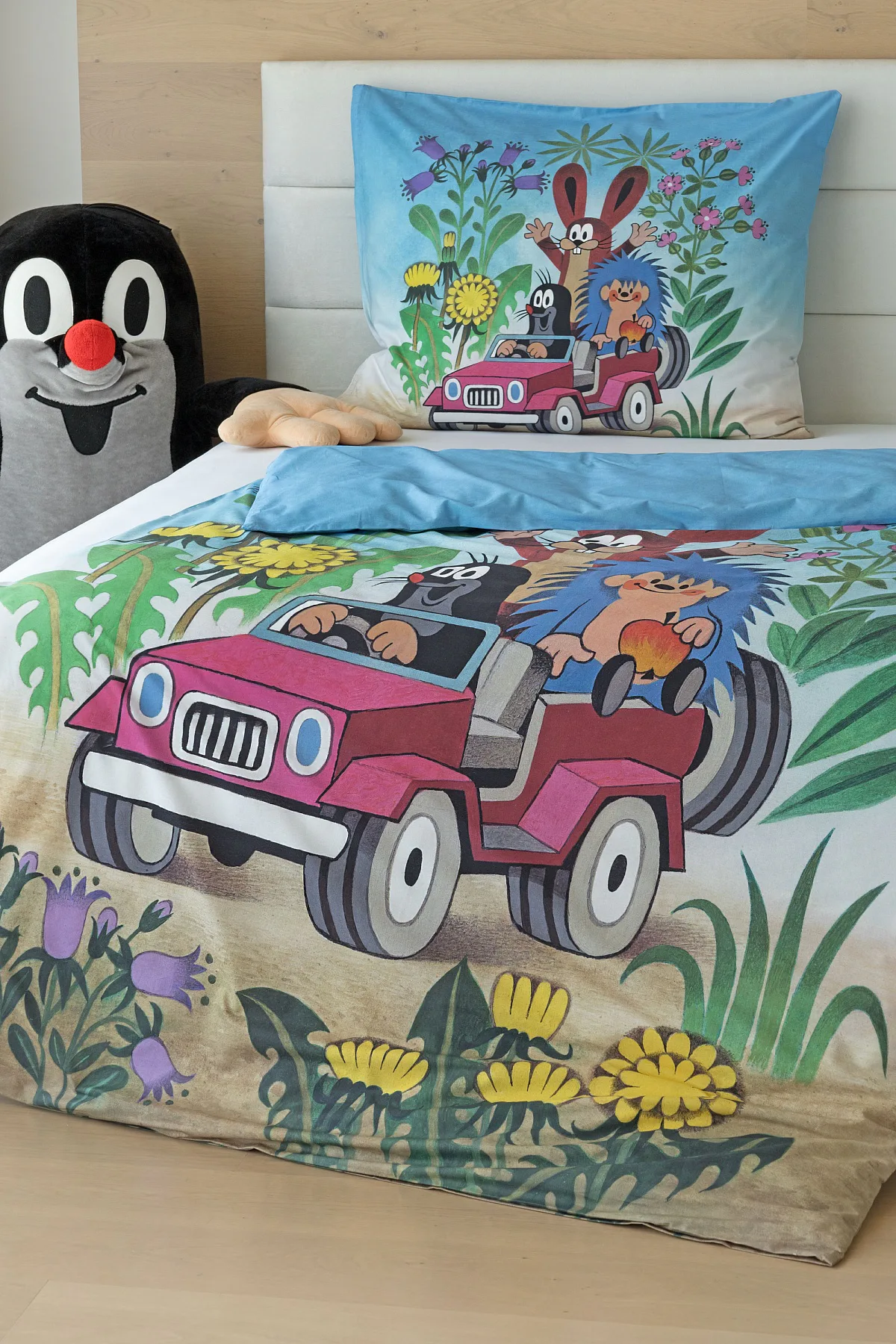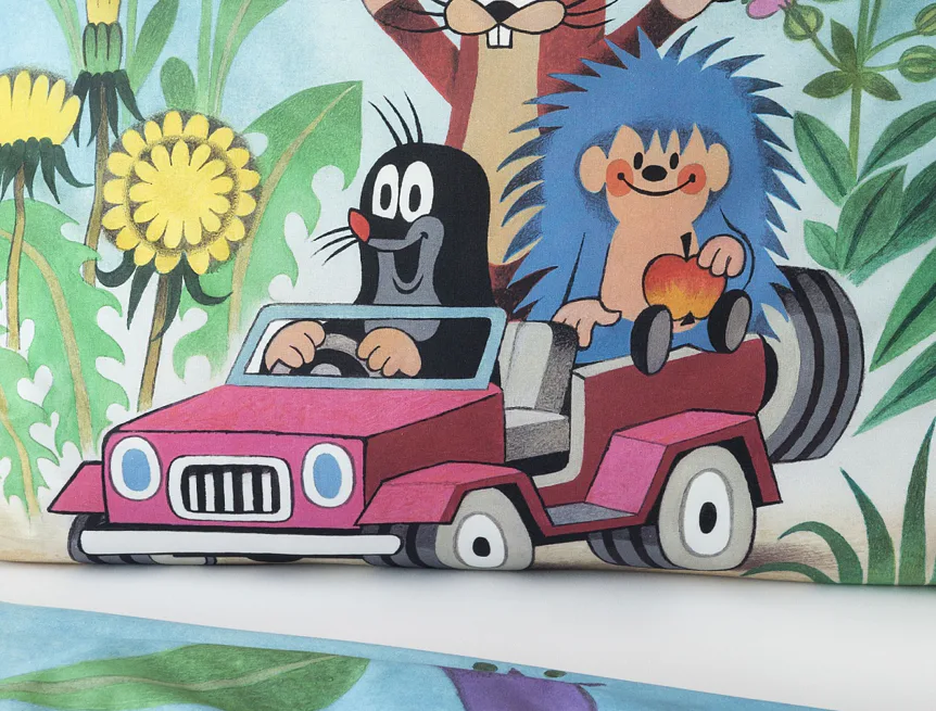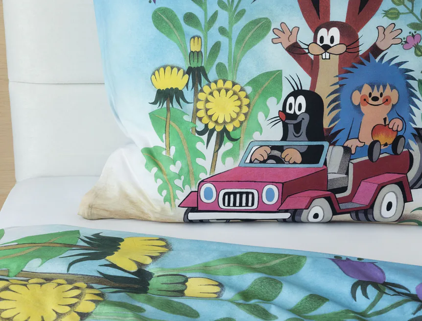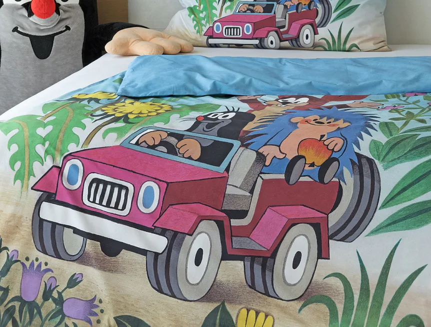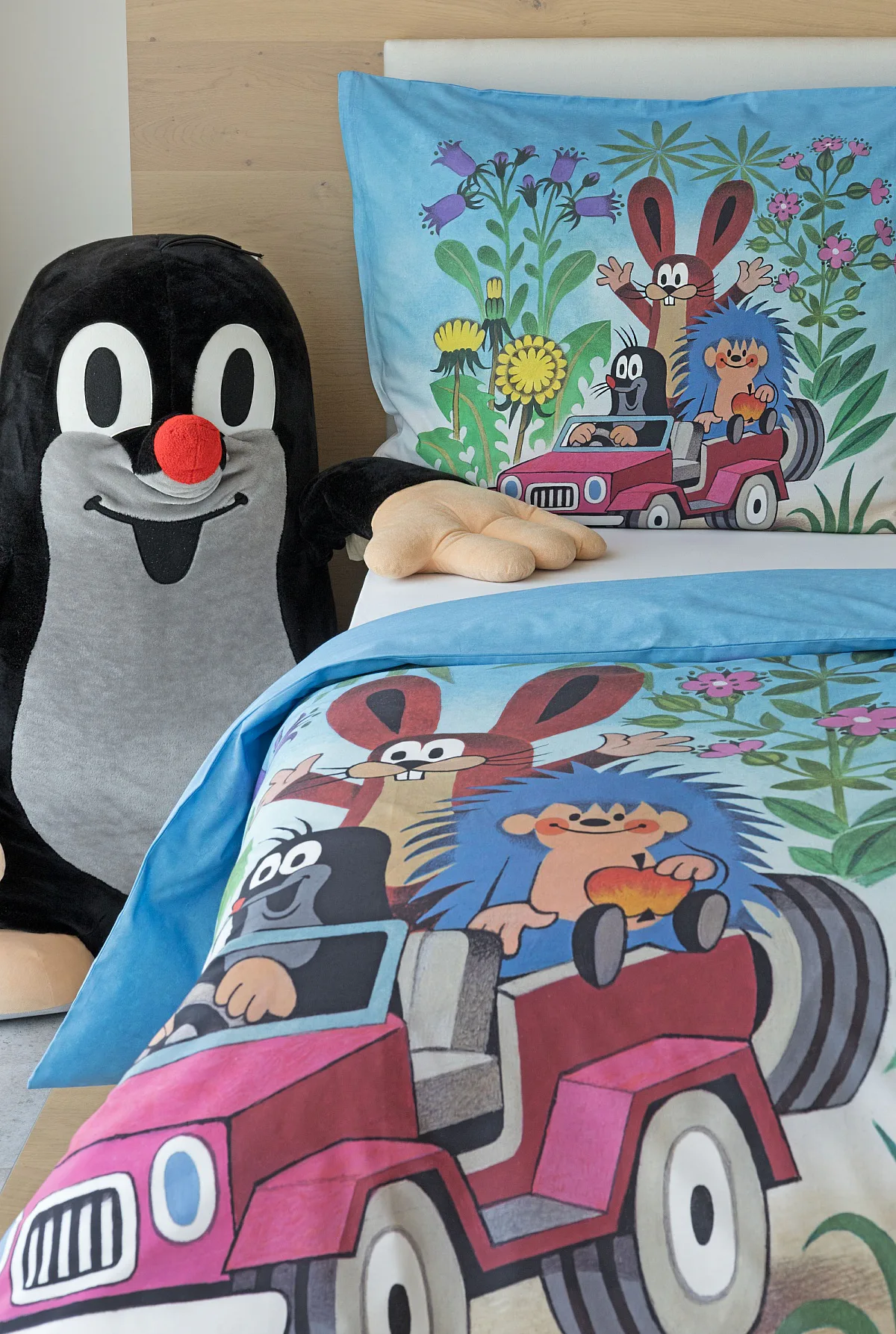 Dětské povlečení Krtek v autě s veselými postavičkami Krtka a jeho kamarádů rozveselí dětskou postýlku a dětem se v něm bude krásně usínat.