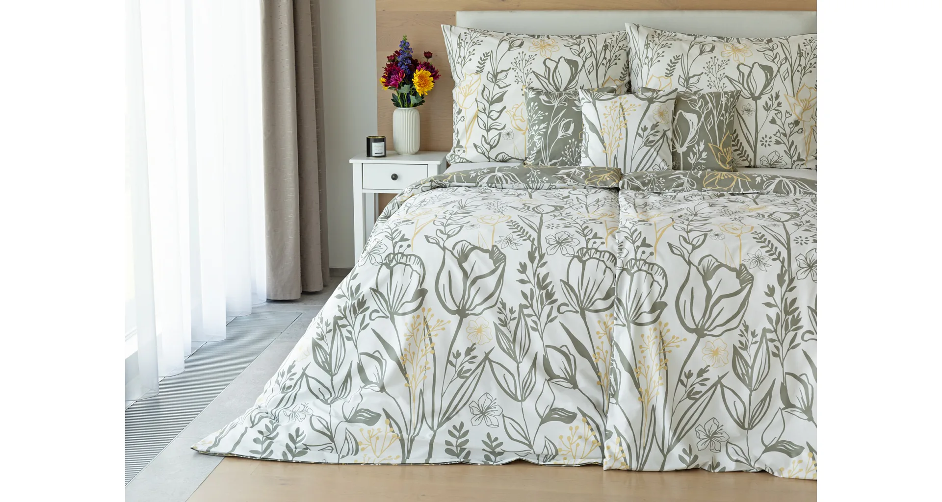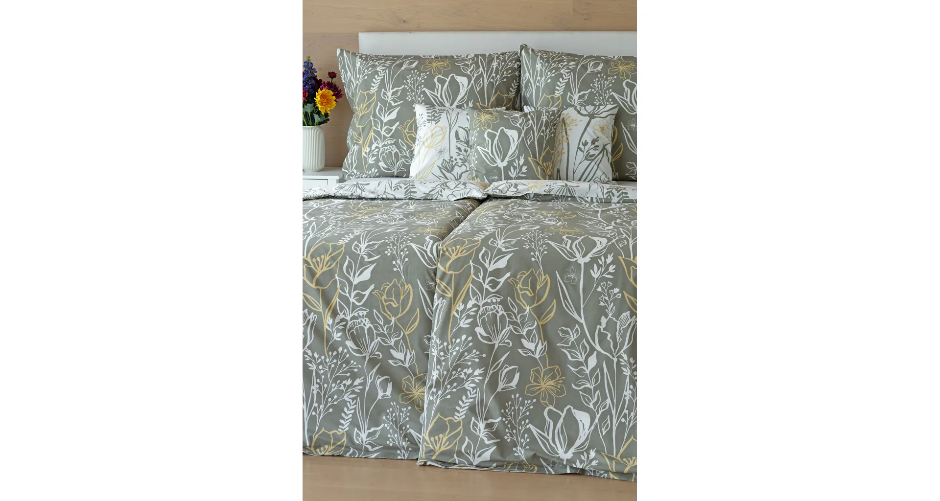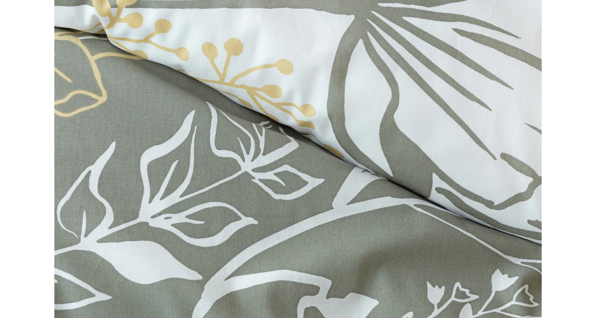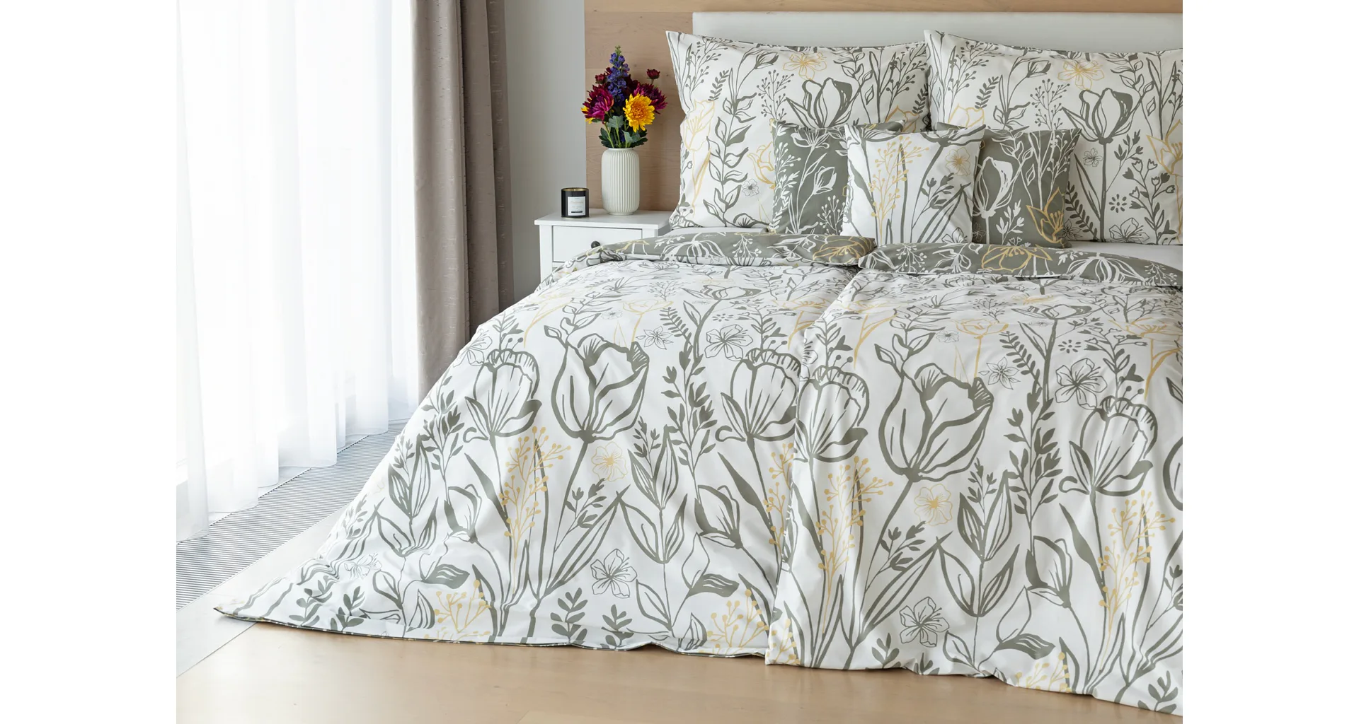 Elegantní květinové povlečení Larissa vnese svěžest a noblesu do vaší ložnice. Jemný florální motiv v kombinaci bílá, zeleno-šedá a béžová vyniká z každé strany povlečení na jiném podkladu. Díky tomuto oblíbenému oboustrannému provedení můžete při stlaní hravě experimentovat!