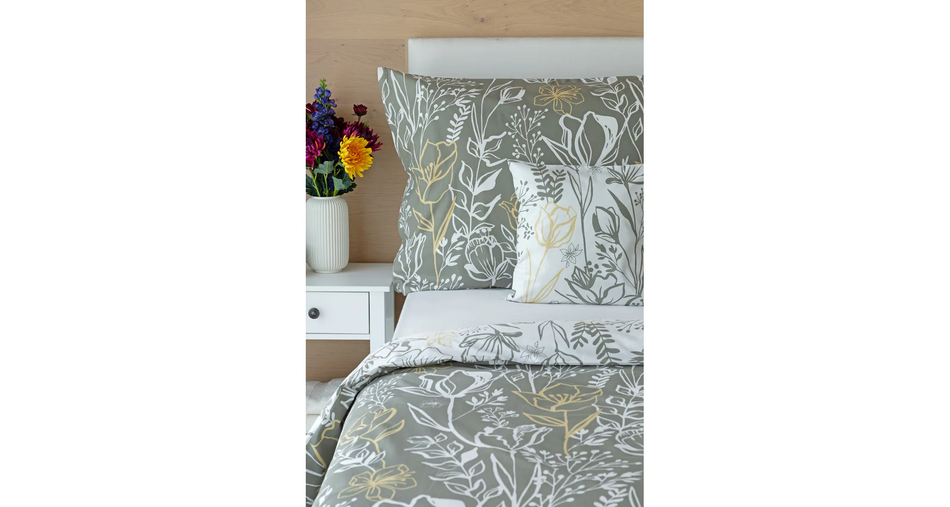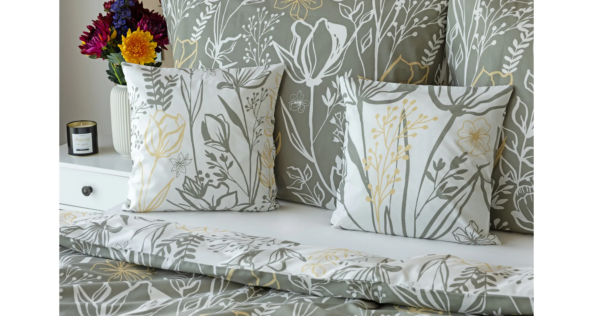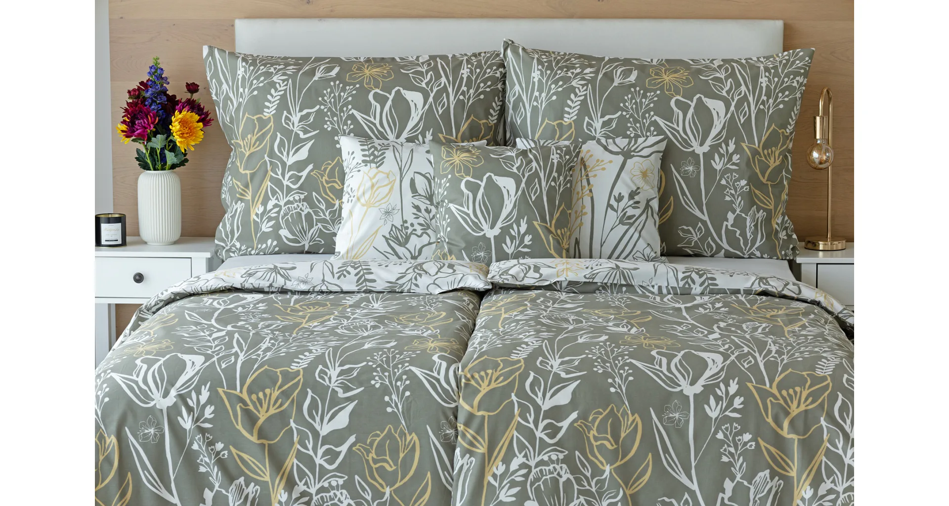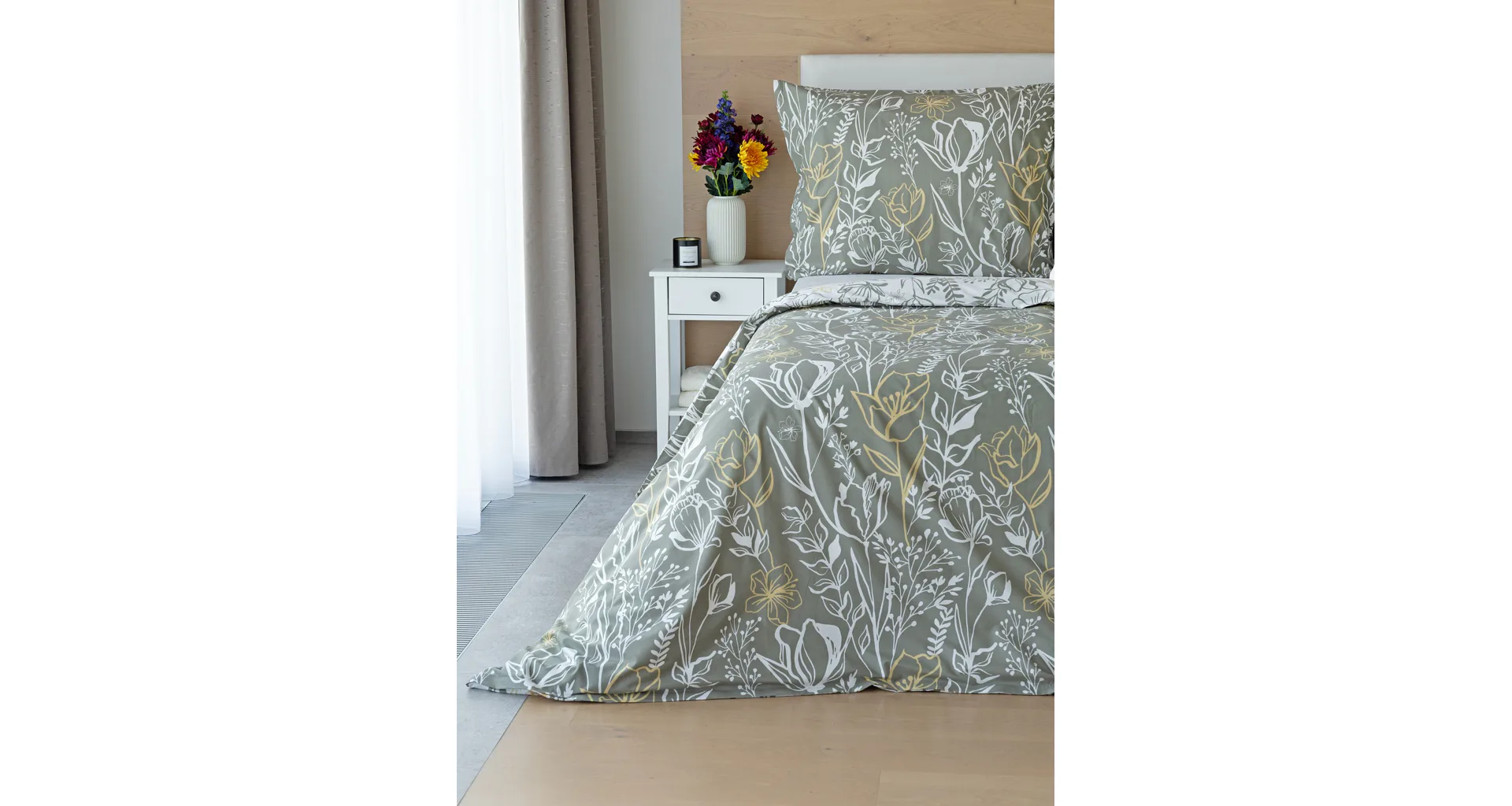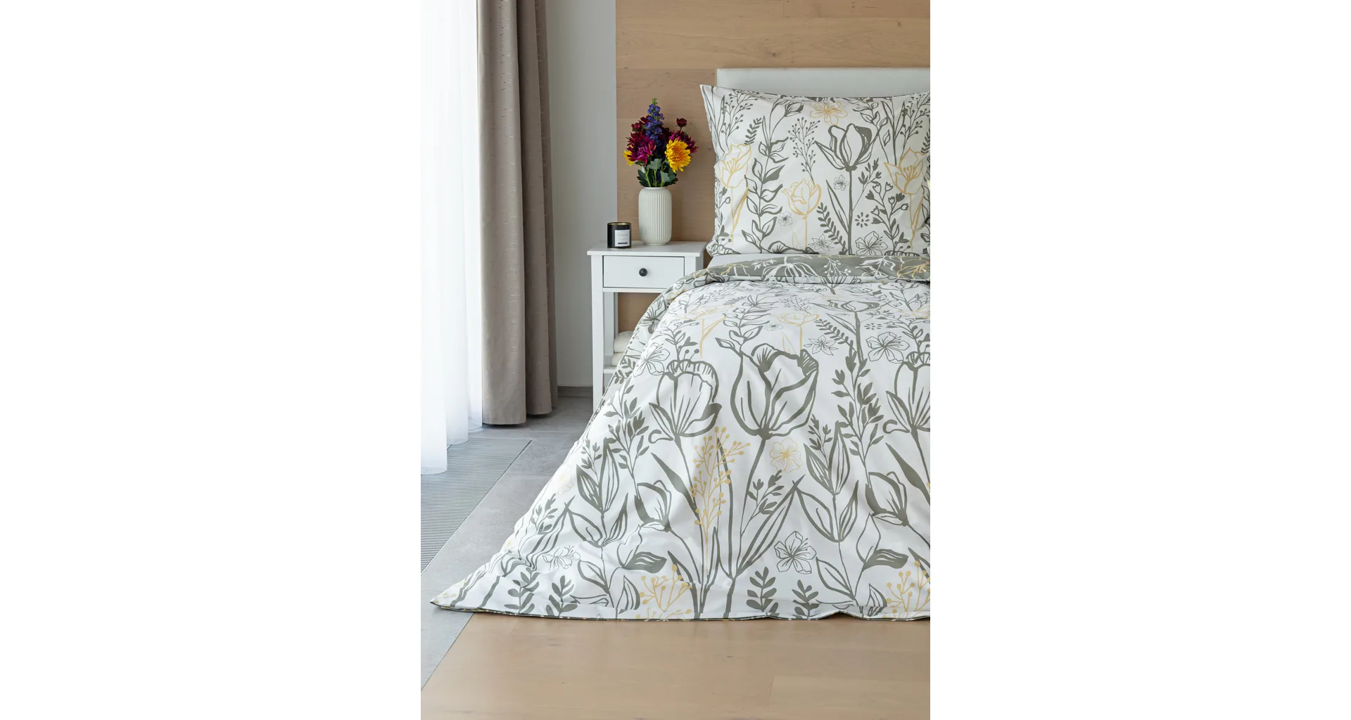 Elegantní květinové povlečení Larissa vnese svěžest a noblesu do vaší ložnice. Jemný florální motiv v kombinaci bílá, zeleno-šedá a béžová vyniká z každé strany povlečení na jiném podkladu. Díky tomuto oblíbenému oboustrannému provedení můžete při stlaní hravě experimentovat!