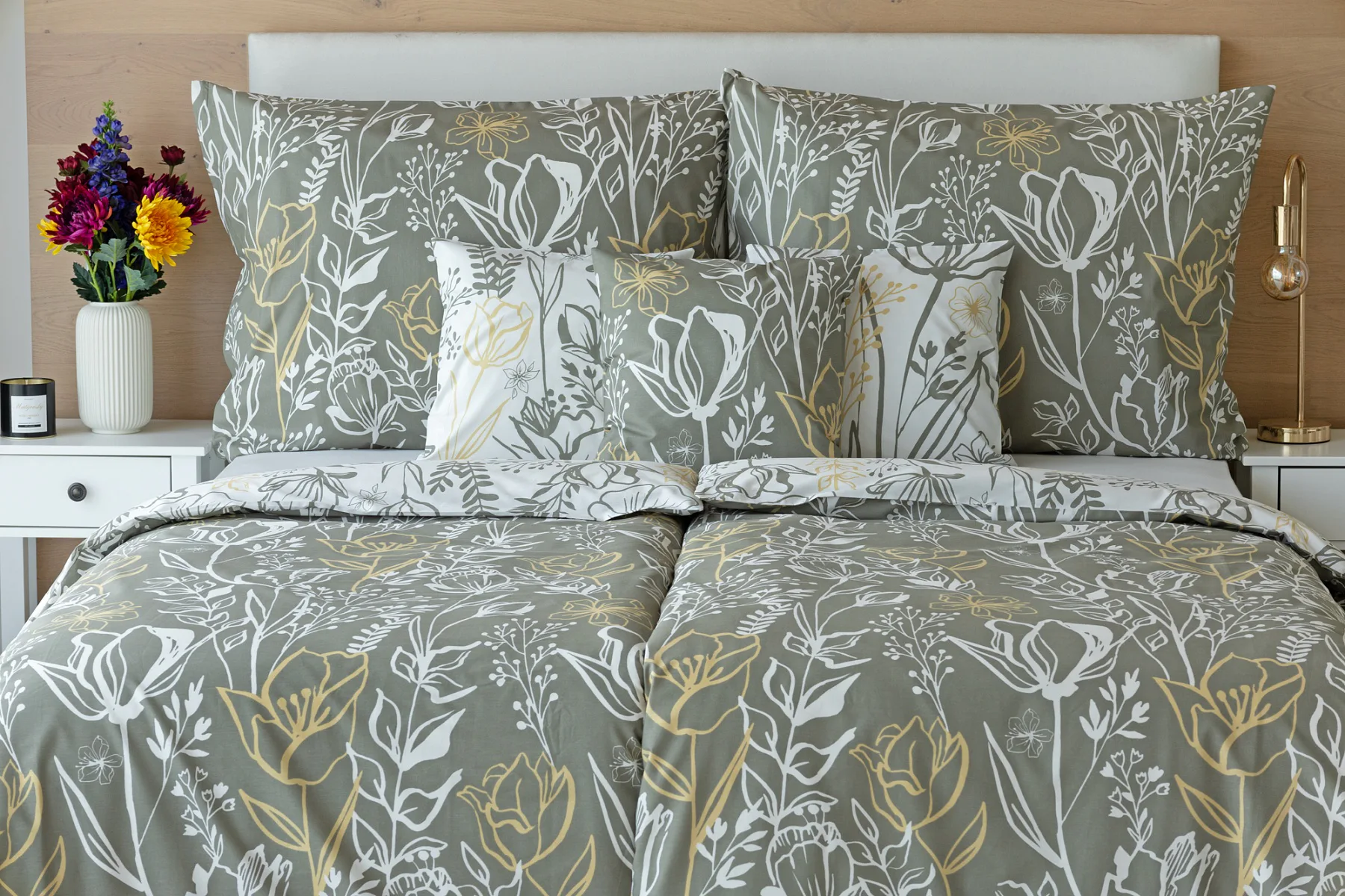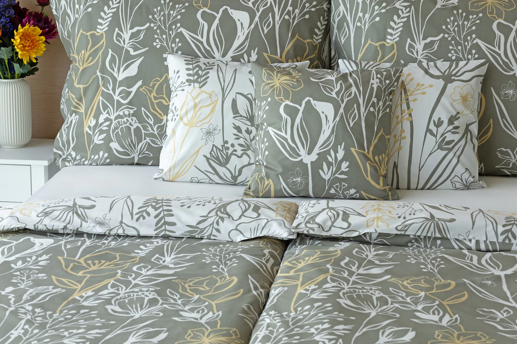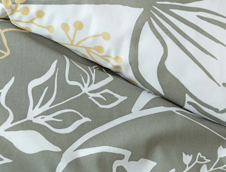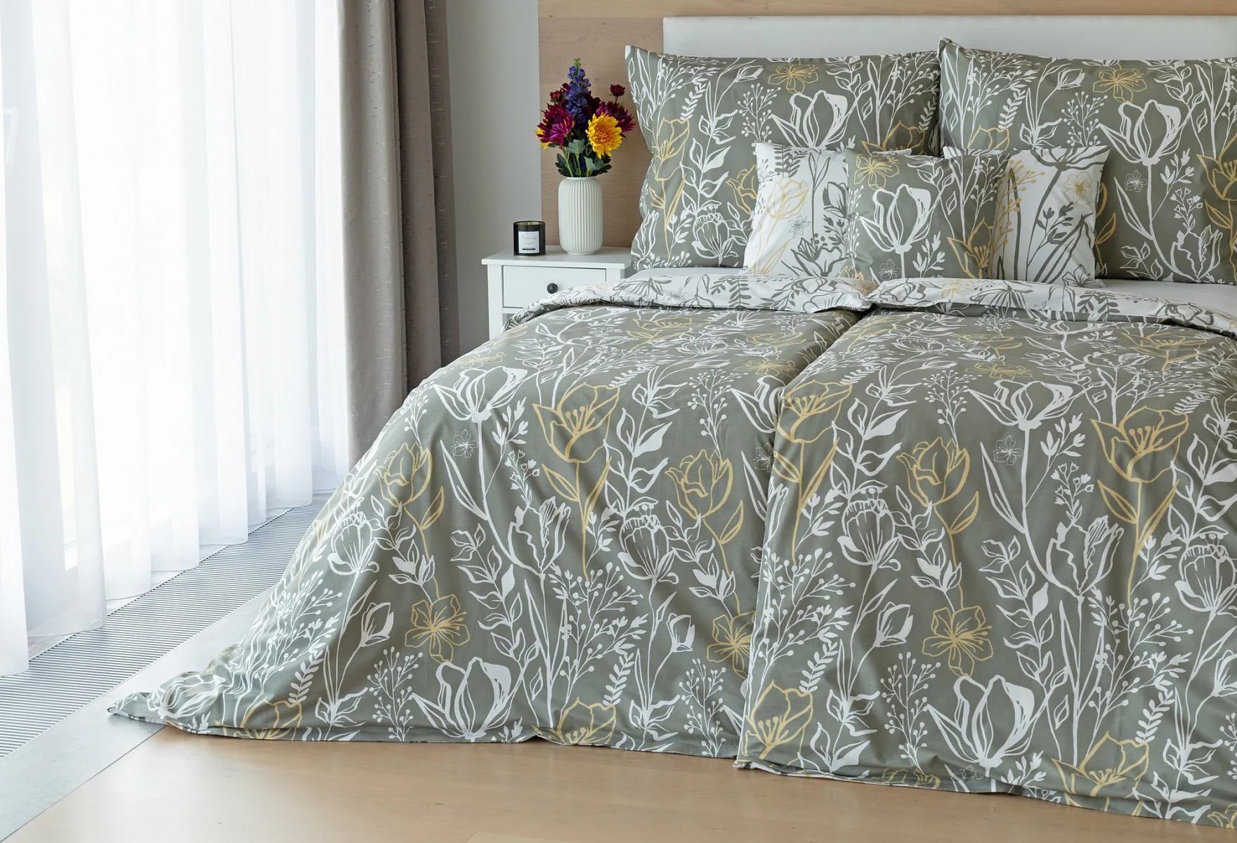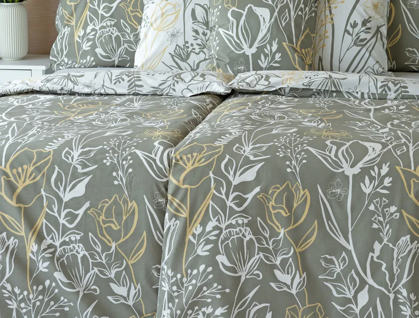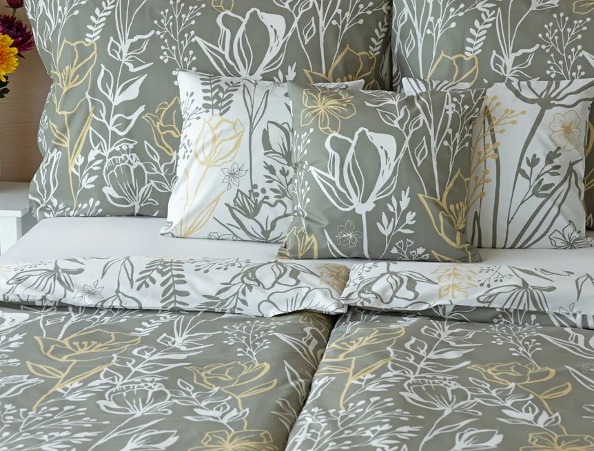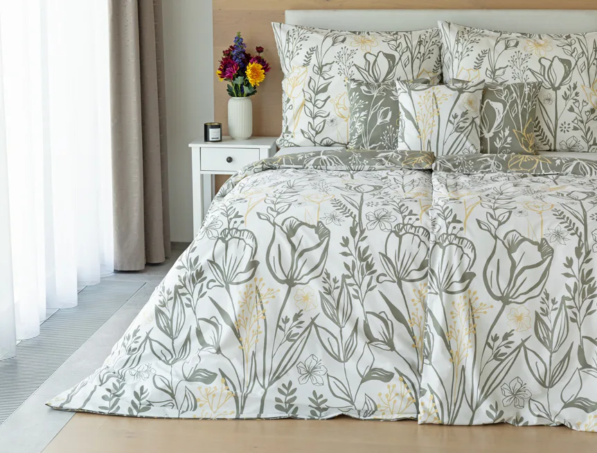 Elegantní květinové povlečení Larissa vnese svěžest a noblesu do vaší ložnice. Jemný florální motiv v kombinaci bílá, zeleno-šedá a béžová vyniká z každé strany povlečení na jiném podkladu. Díky tomuto oblíbenému oboustrannému provedení můžete při stlaní hravě experimentovat!