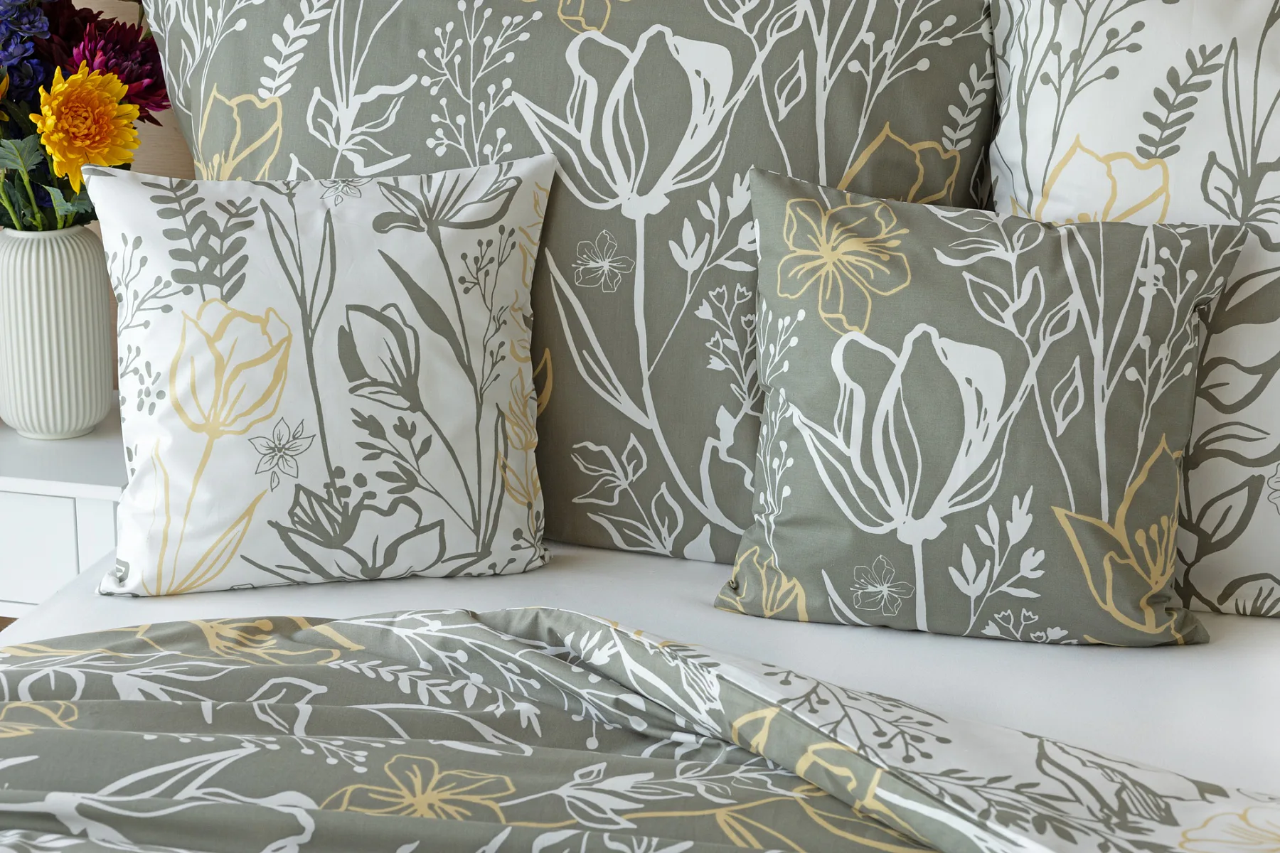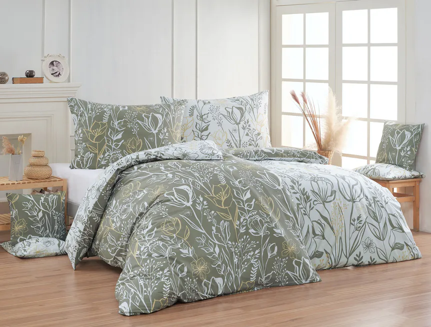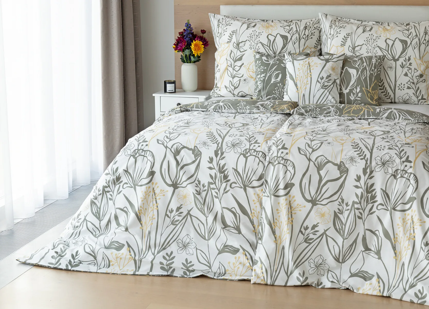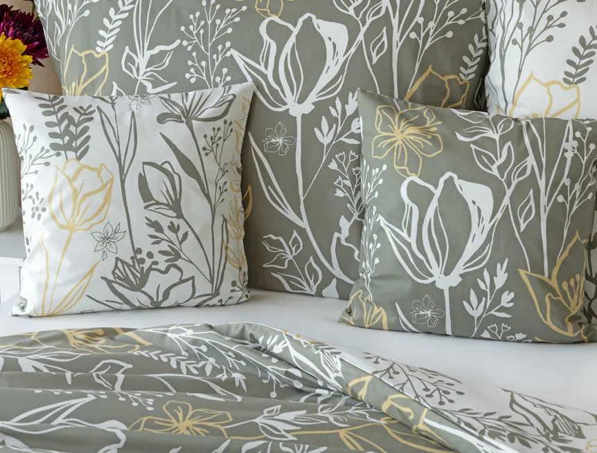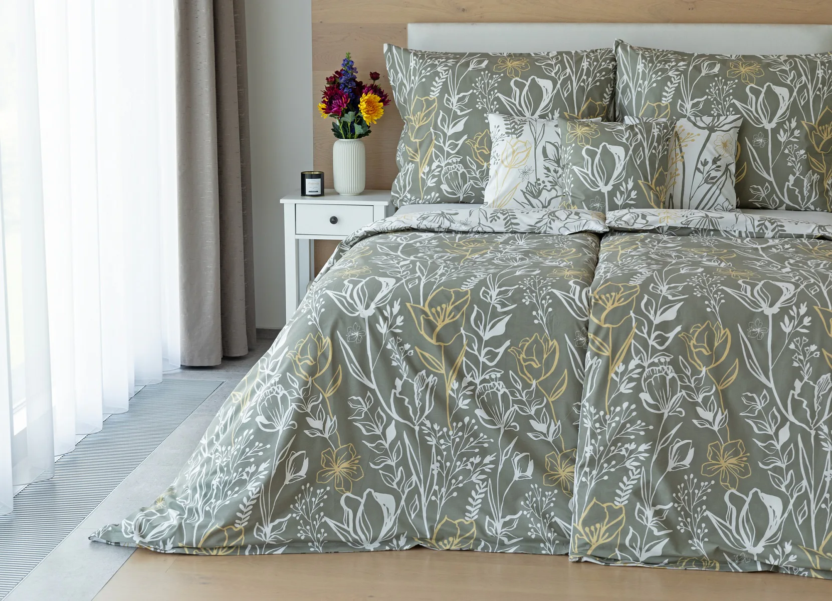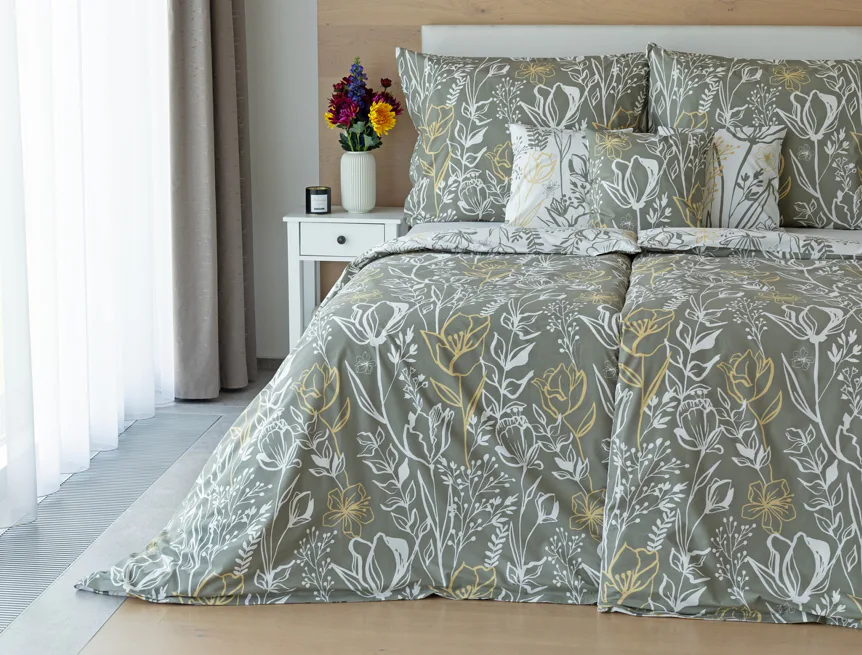 Elegantní květinové povlečení Larissa vnese svěžest a noblesu do vaší ložnice. Jemný florální motiv v kombinaci bílá, zeleno-šedá a béžová vyniká z každé strany povlečení na jiném podkladu. Díky tomuto oblíbenému oboustrannému provedení můžete při stlaní hravě experimentovat!