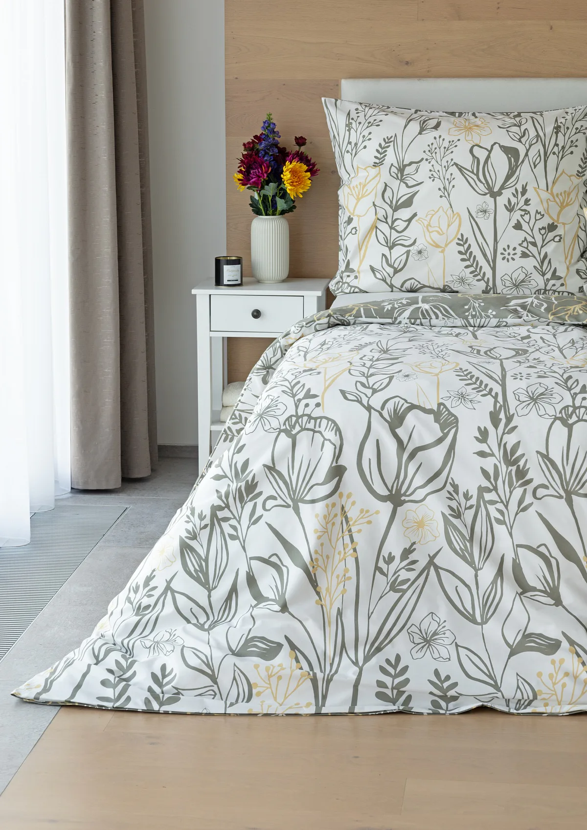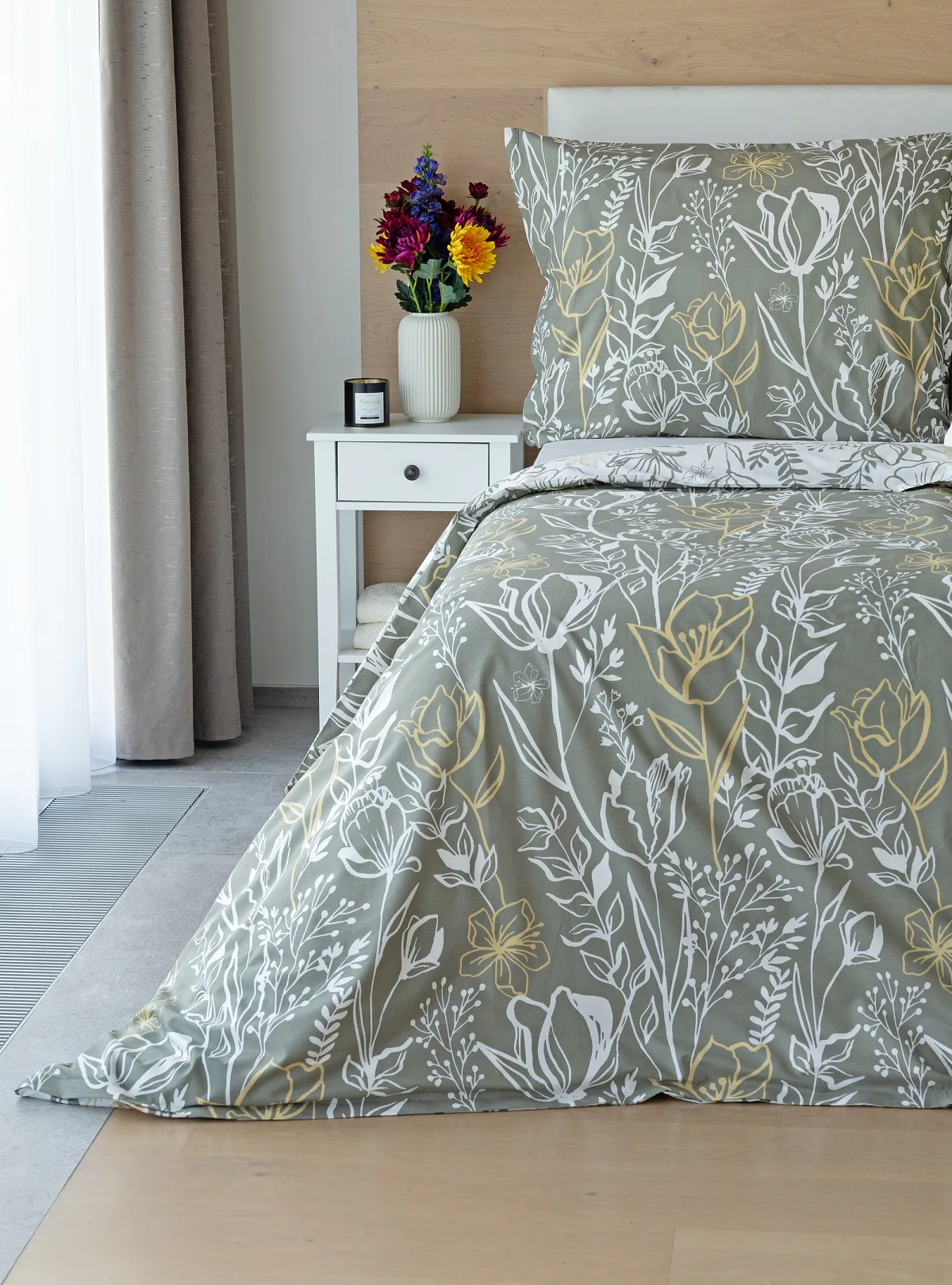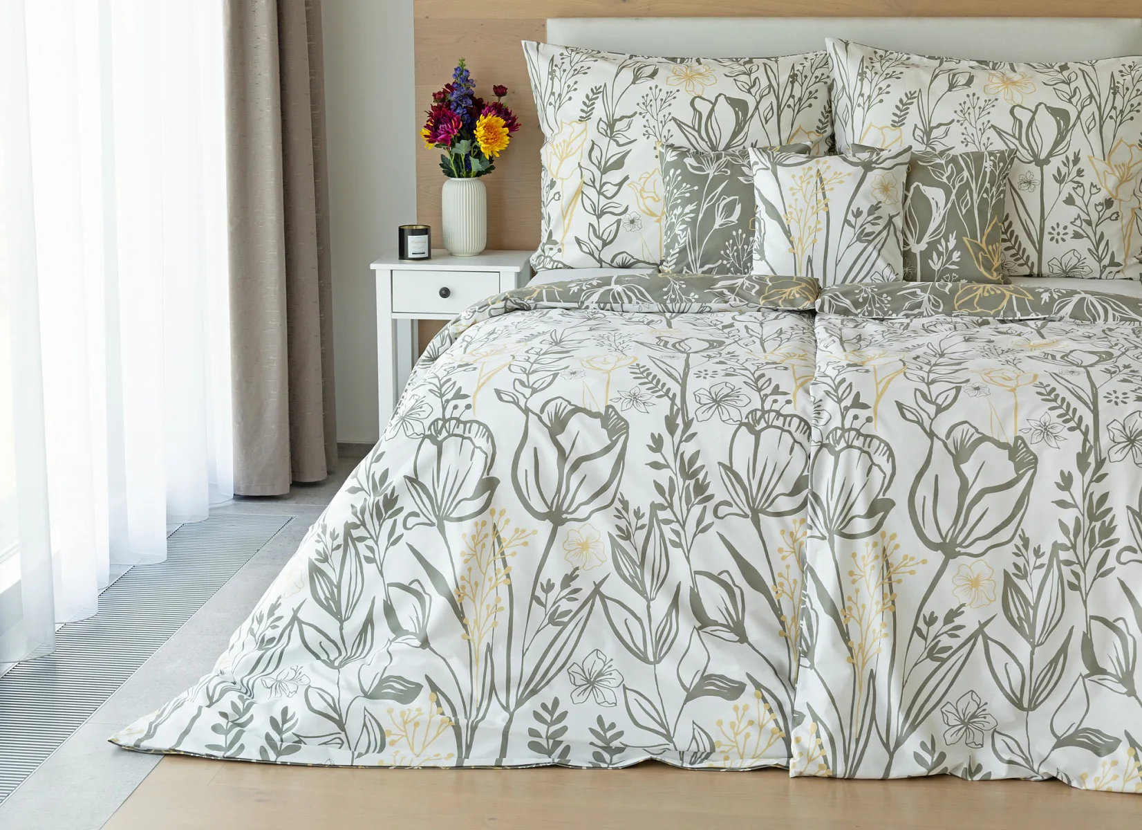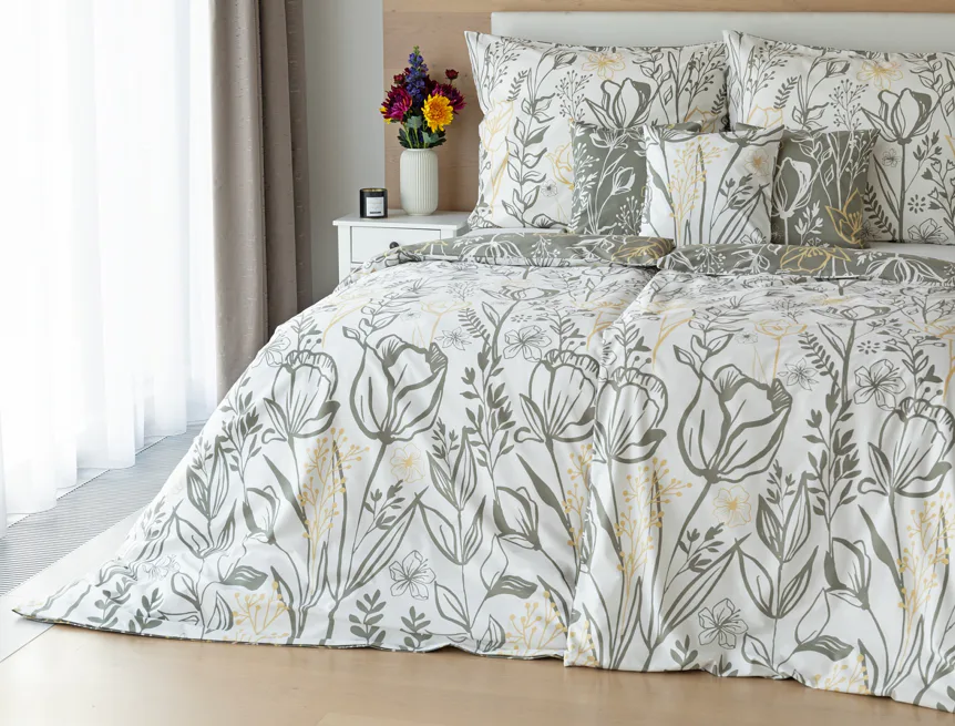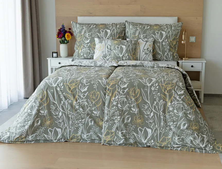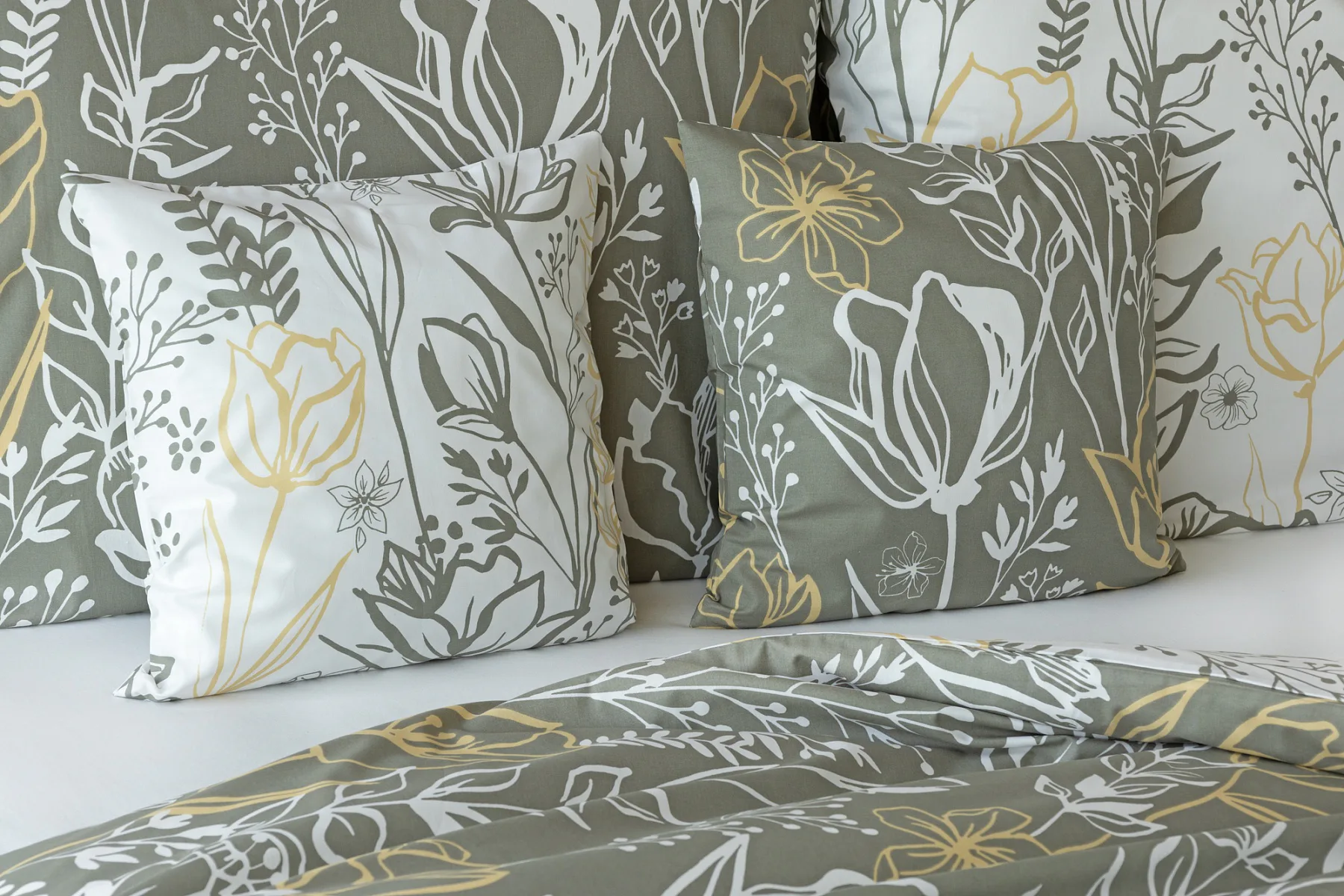 Elegantní květinové povlečení Larissa vnese svěžest a noblesu do vaší ložnice. Jemný florální motiv v kombinaci bílá, zeleno-šedá a béžová vyniká z každé strany povlečení na jiném podkladu. Díky tomuto oblíbenému oboustrannému provedení můžete při stlaní hravě experimentovat!