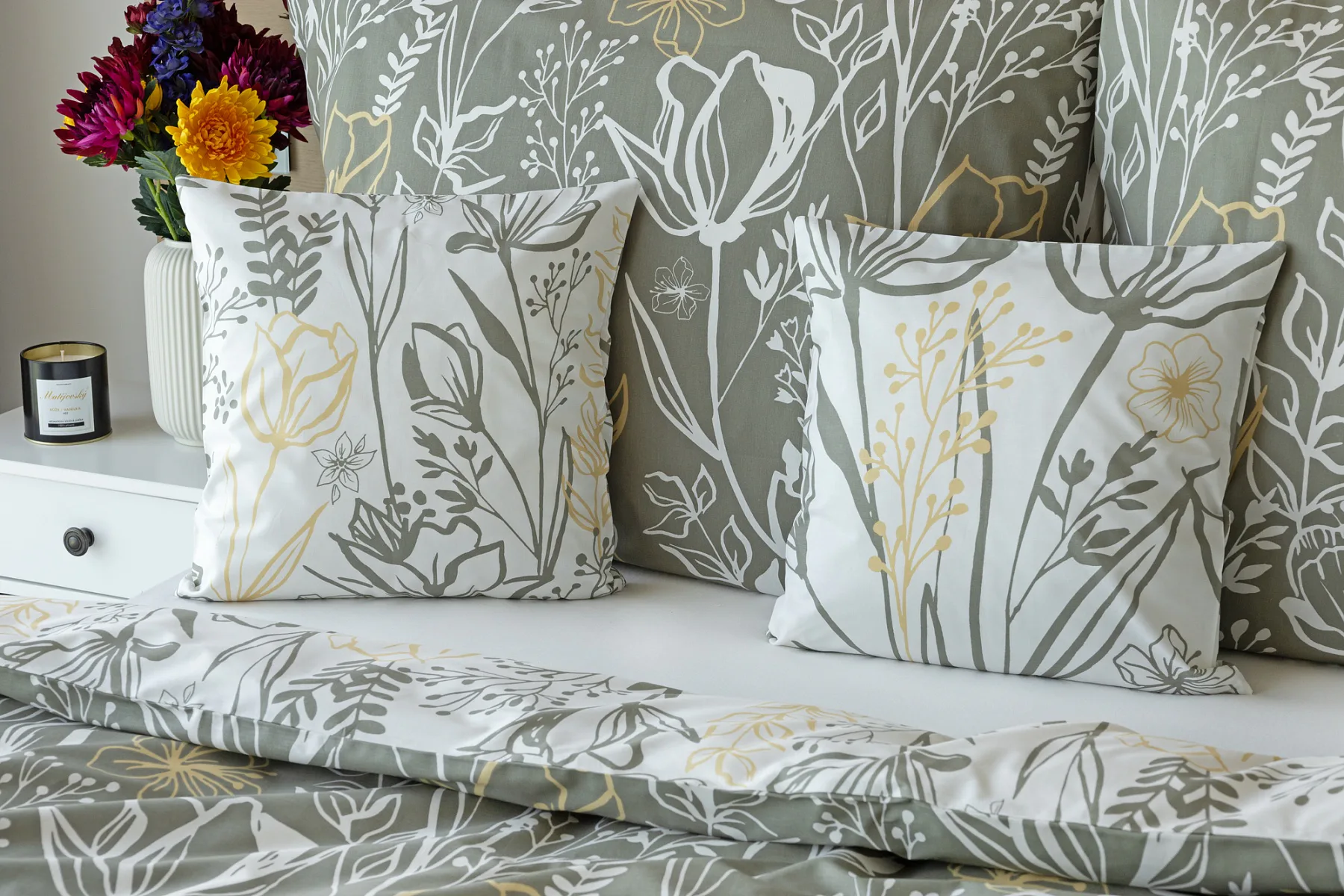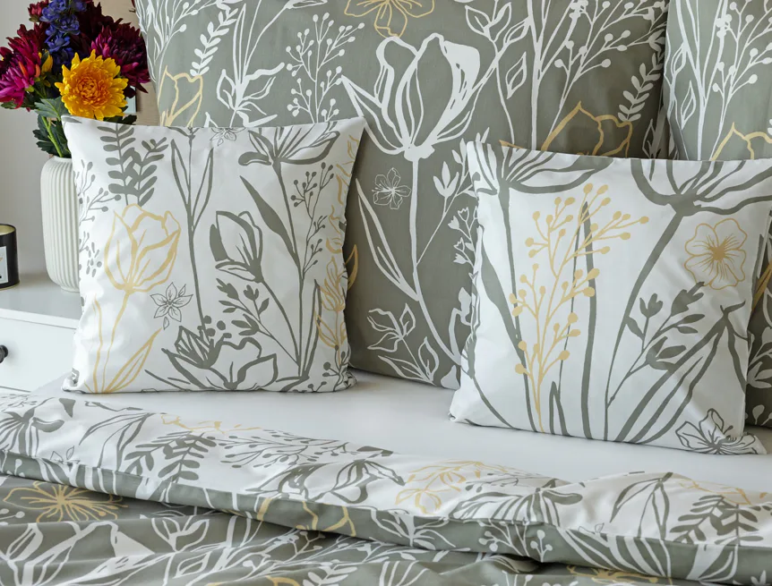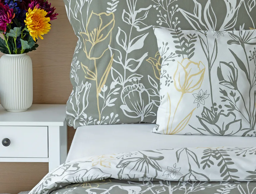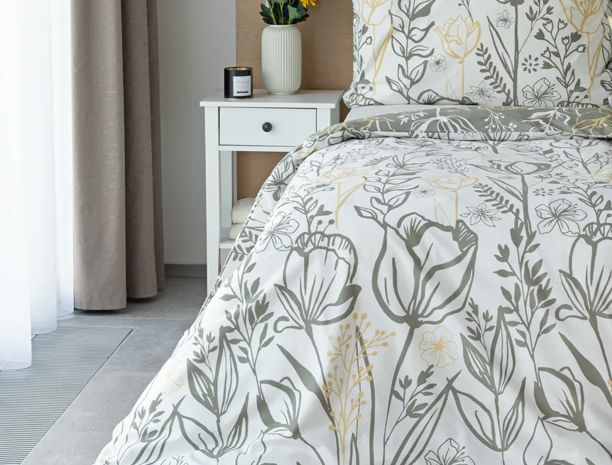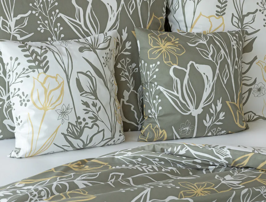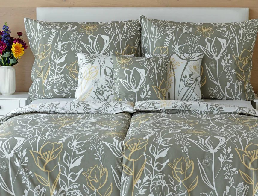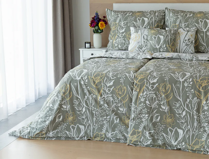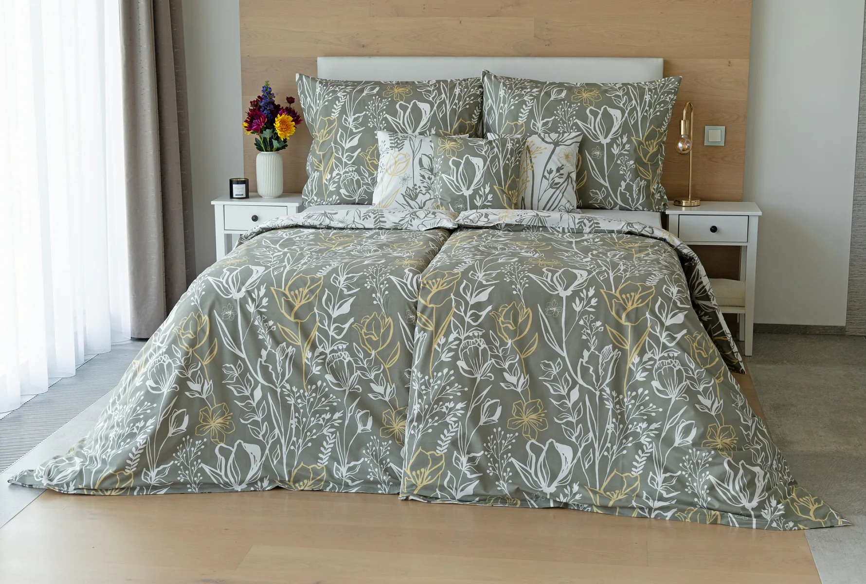 Elegantní květinové povlečení Larissa vnese svěžest a noblesu do vaší ložnice. Jemný florální motiv v kombinaci bílá, zeleno-šedá a béžová vyniká z každé strany povlečení na jiném podkladu. Díky tomuto oblíbenému oboustrannému provedení můžete při stlaní hravě experimentovat!