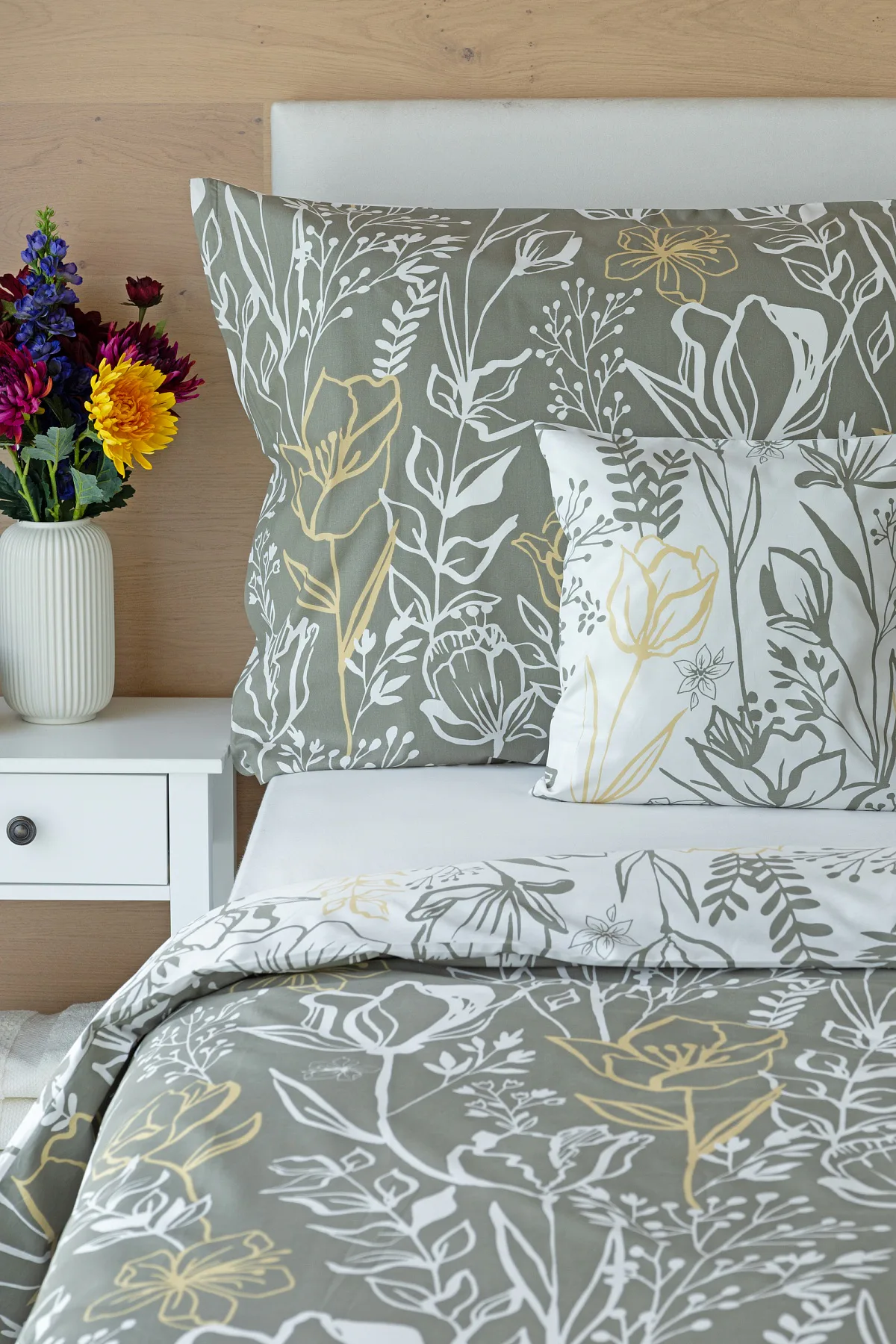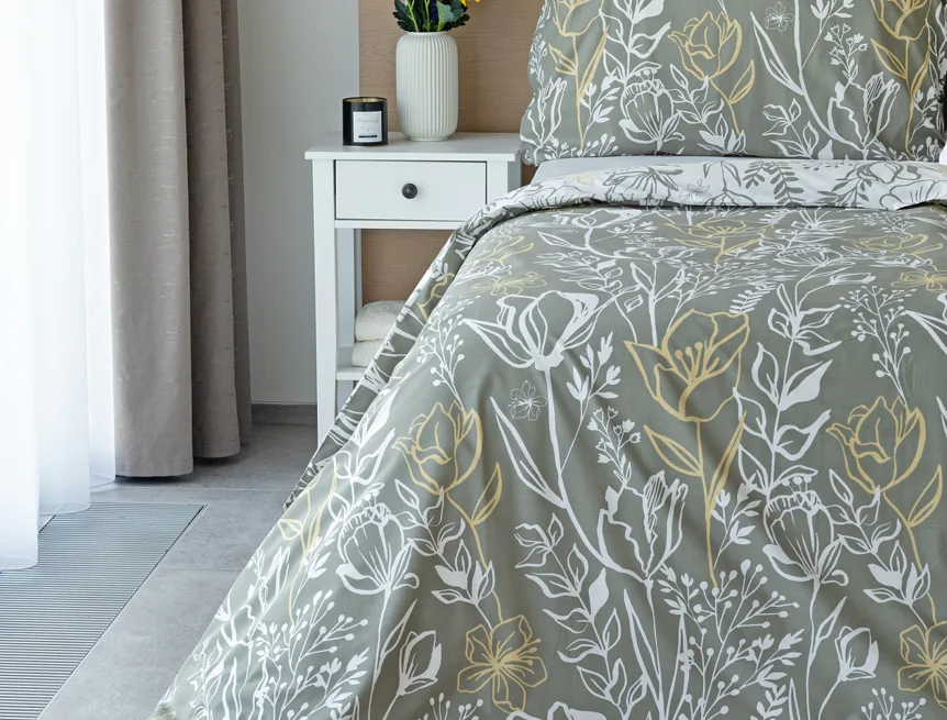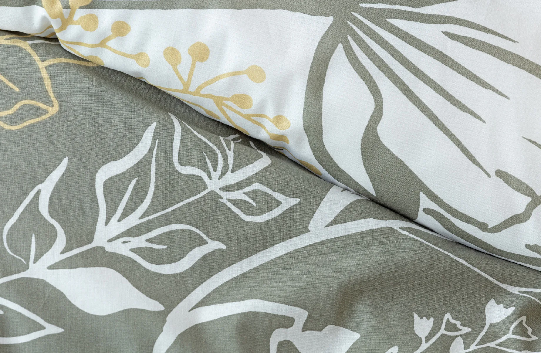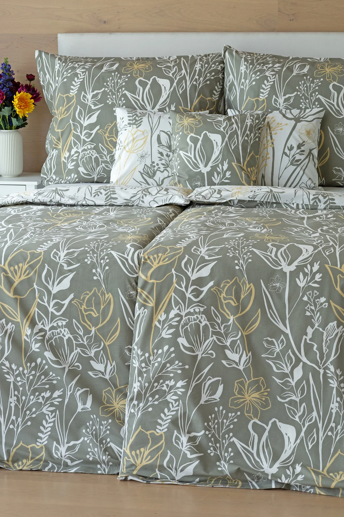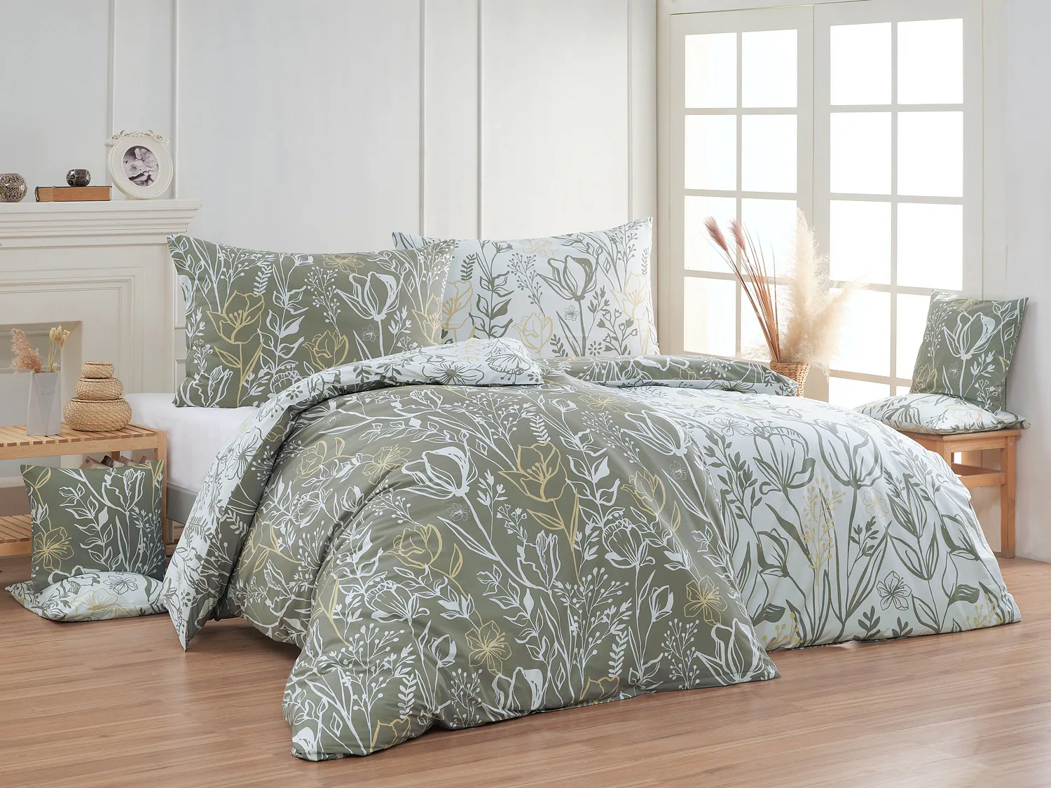 Elegantní květinové povlečení Larissa vnese svěžest a noblesu do vaší ložnice. Jemný florální motiv v kombinaci bílá, zeleno-šedá a béžová vyniká z každé strany povlečení na jiném podkladu. Díky tomuto oblíbenému oboustrannému provedení můžete při stlaní hravě experimentovat!
