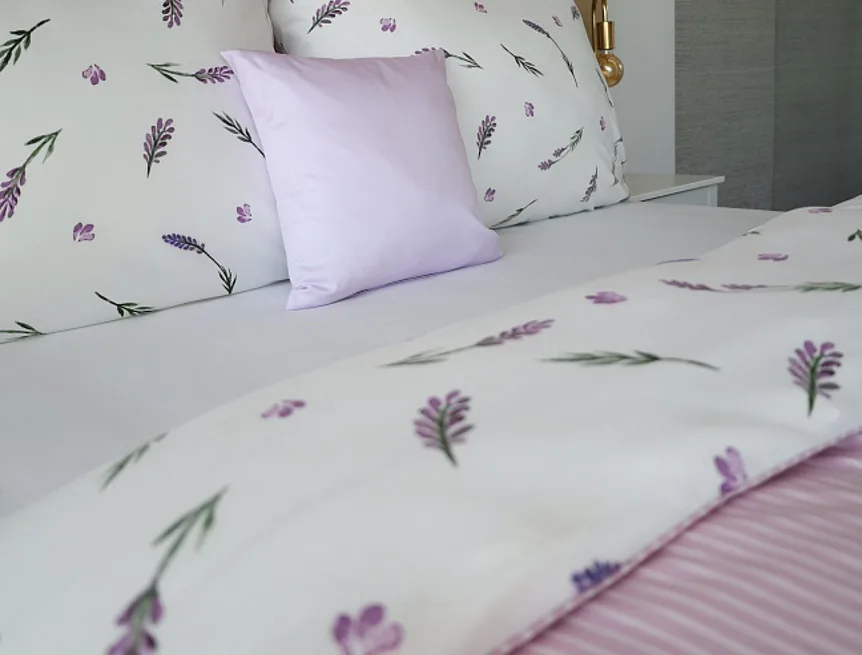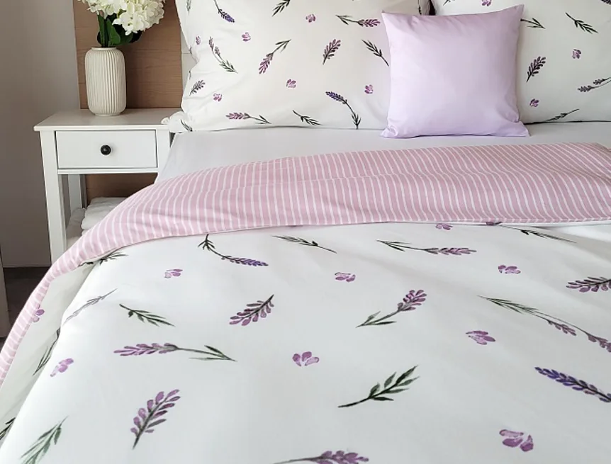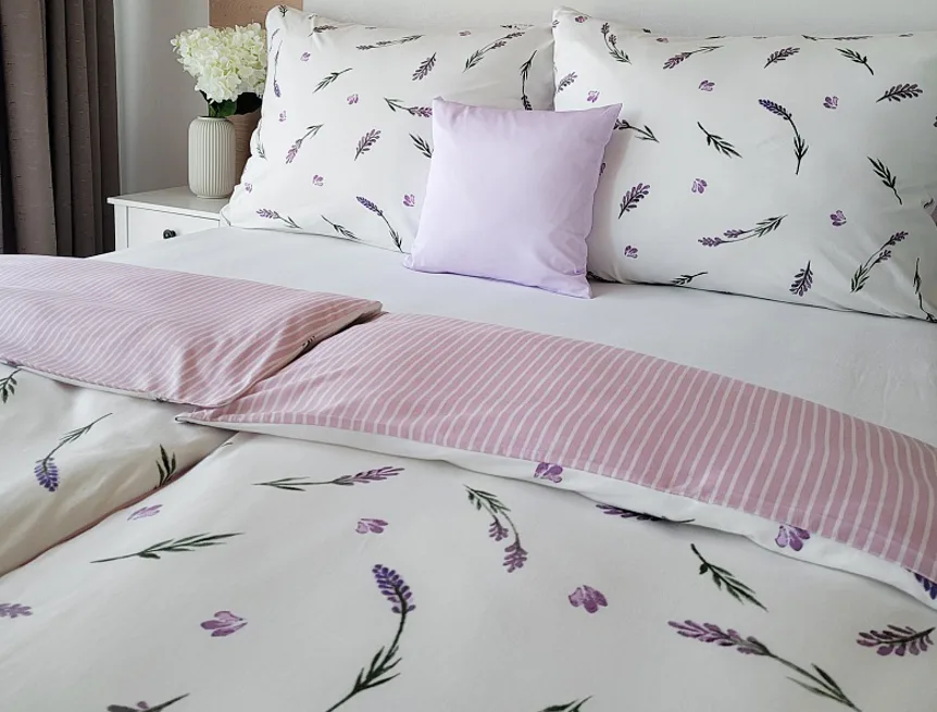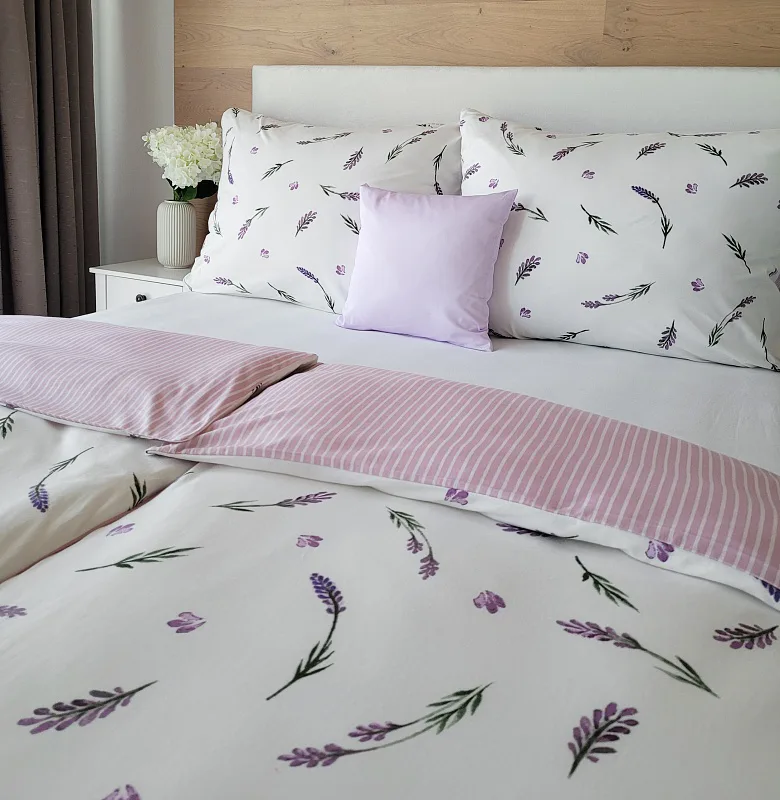 Oblíbený motiv levandule ve spojení s elegantním proužkem přináší ložní povlečení Lavender. Vrchní stranu povlečení zdobí levandulové snítky na bílém podkladu, spodní stranu tvoří pastelově růžový podklad protnutý jemnými bílými proužky.