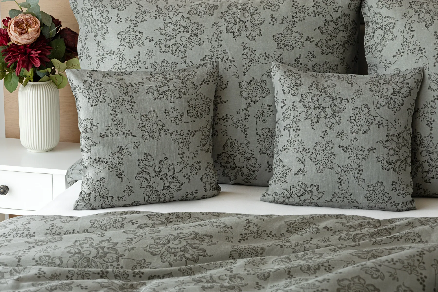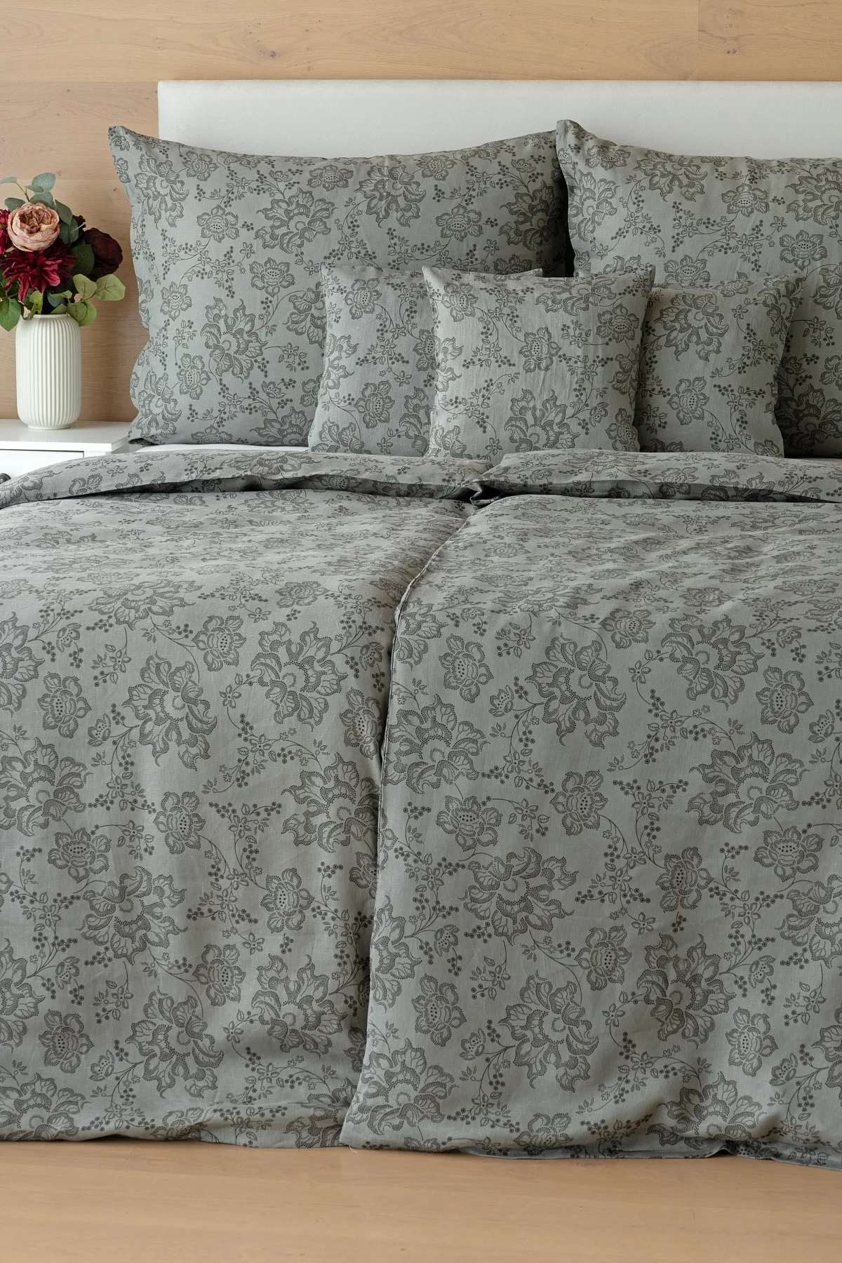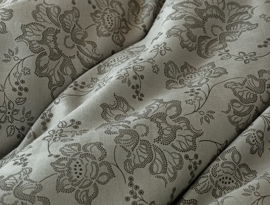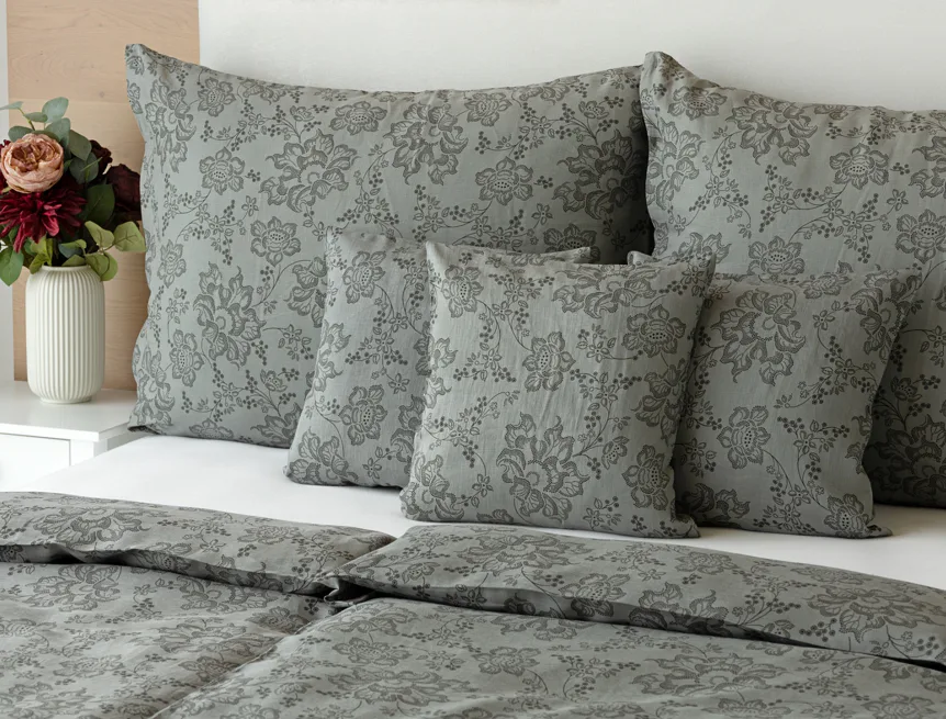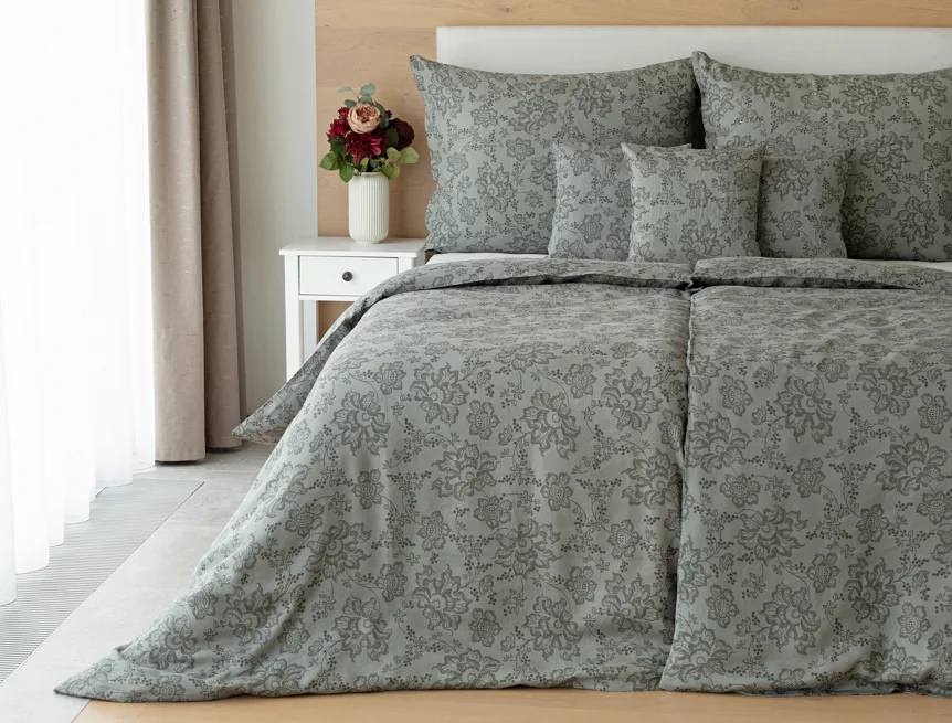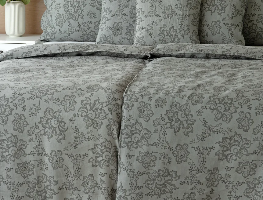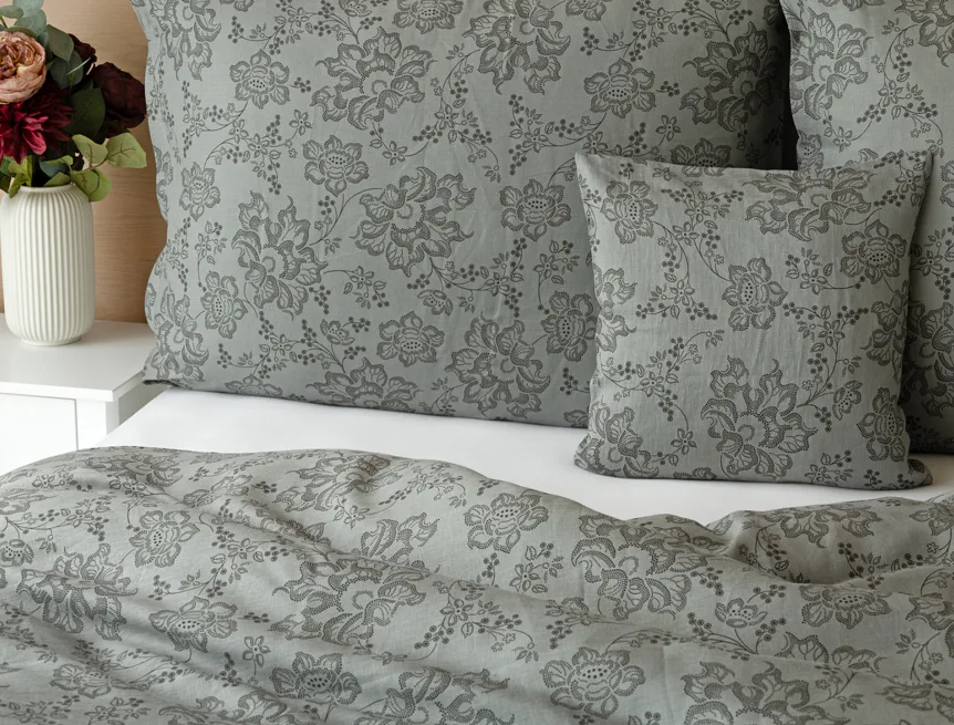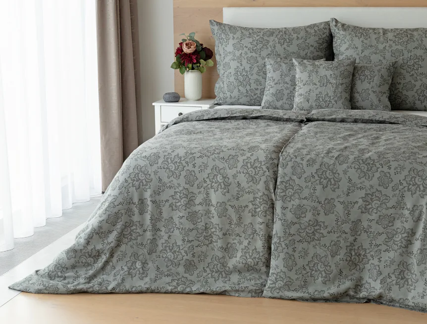 Objevte benefity jedinečného přírodního materiálu a dopřejte si nezaměnitelný komfort s naším lněným povlečením Leilani. Originální florální motiv v antracitové barvě vyniká na šédém podkladu ložního povlečení. Elegntní vzor v kombinaci s tímto ekologicky šetrným materiálem doladí k dokonalosti každý interiér s rustikálním nádechem, ale může být noblesní ozdobou i v moderně zařízené ložnici.