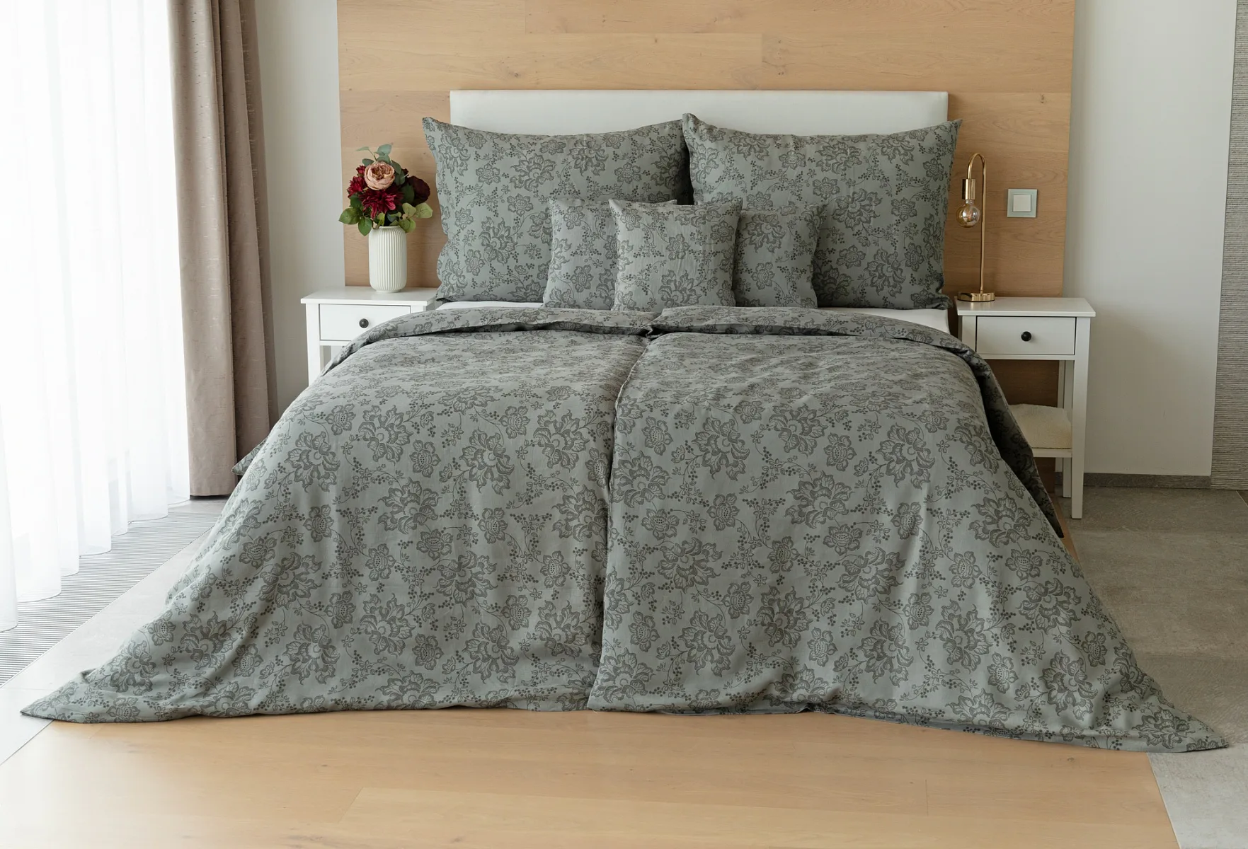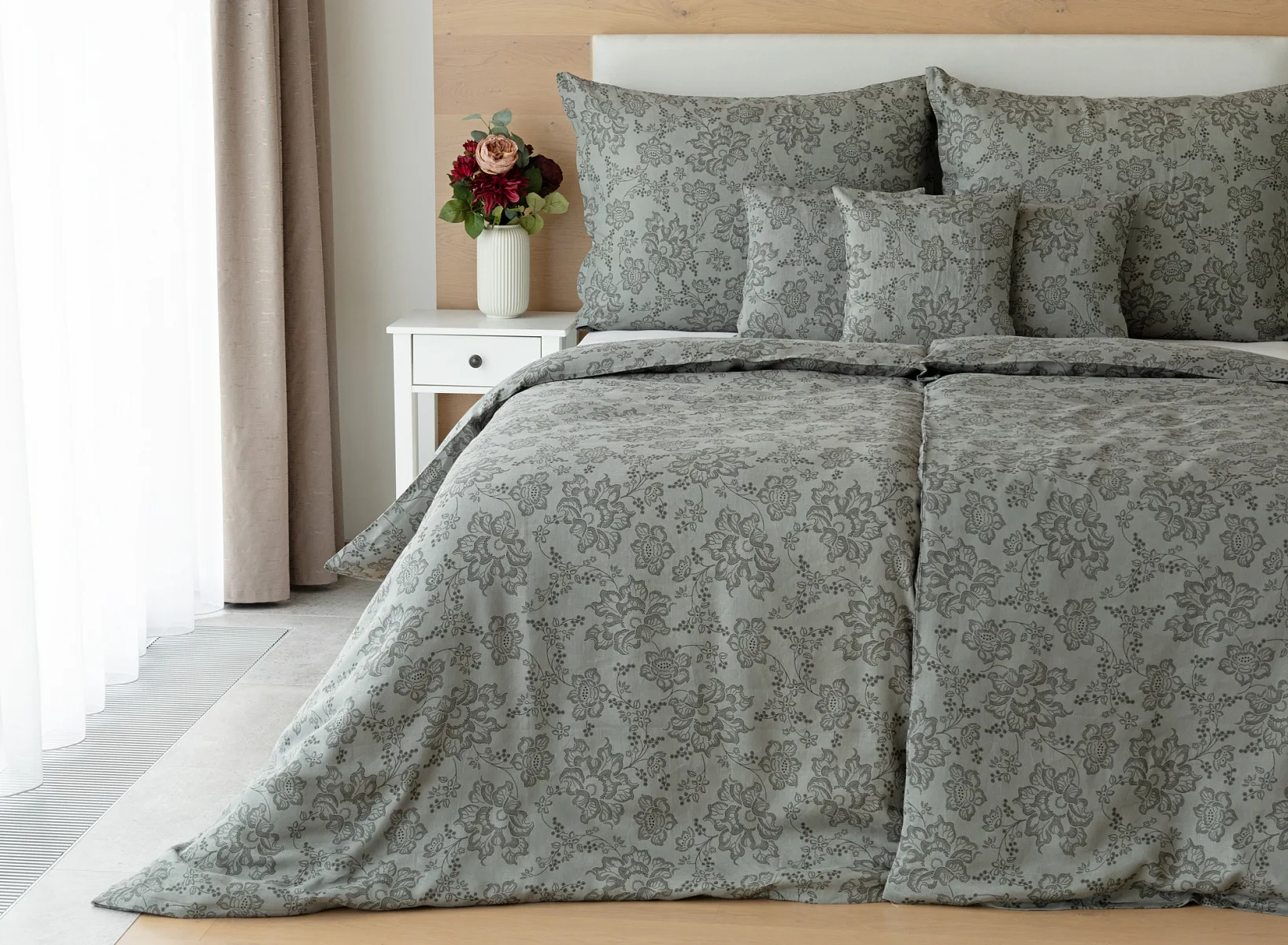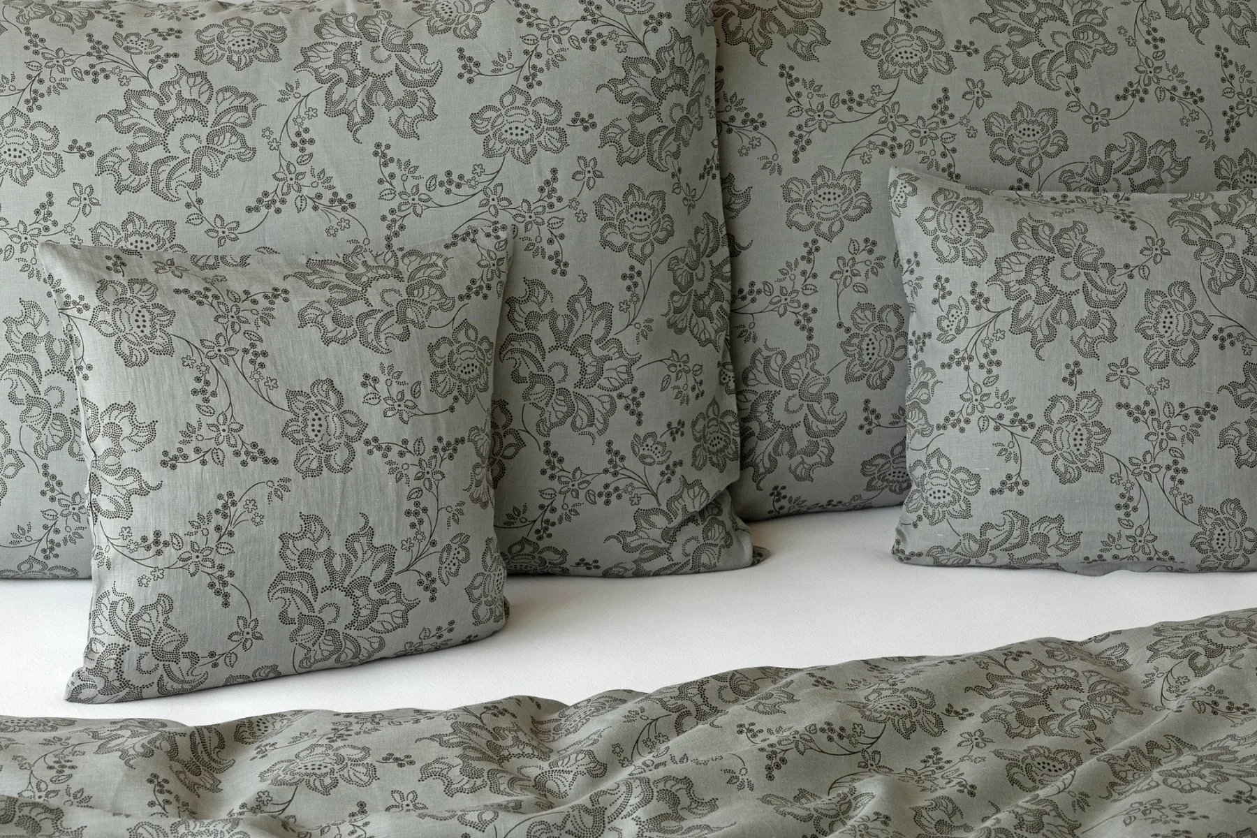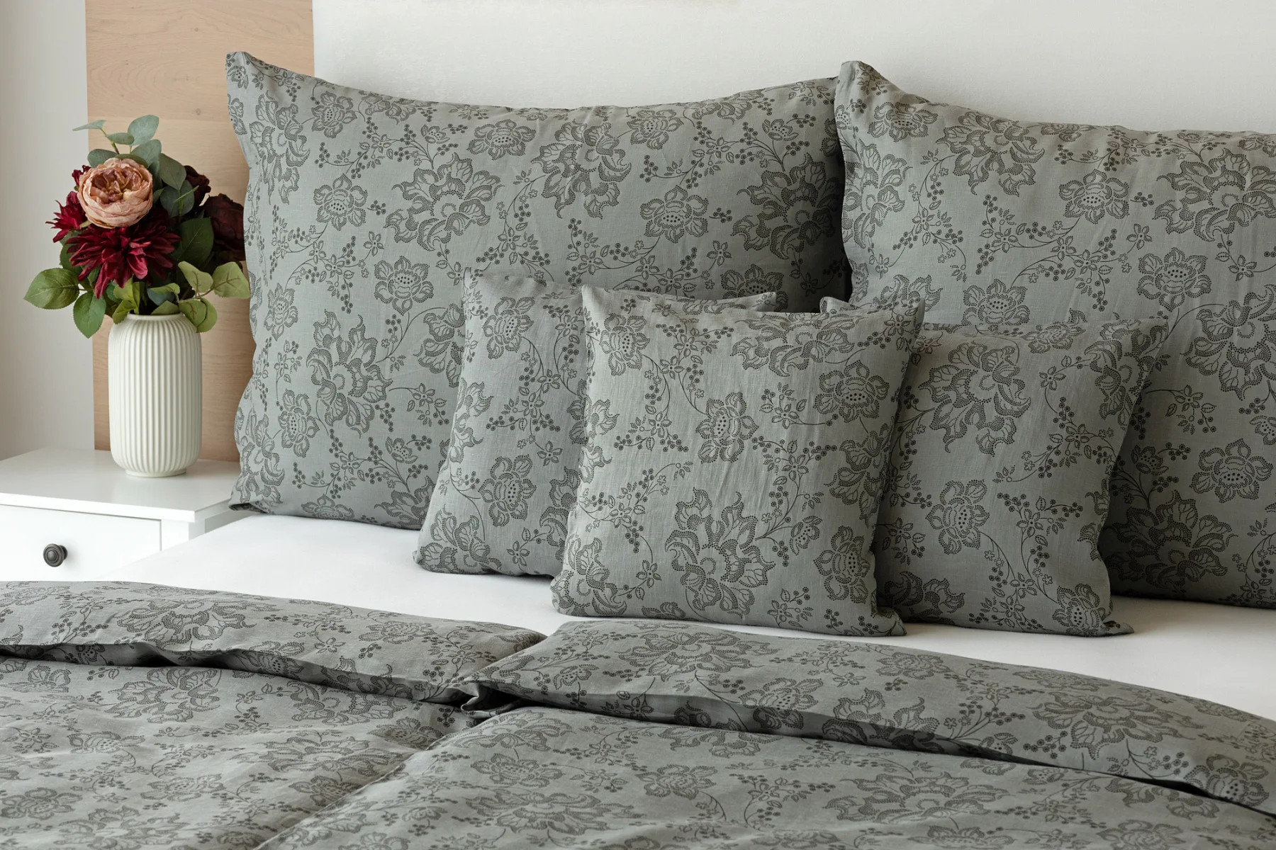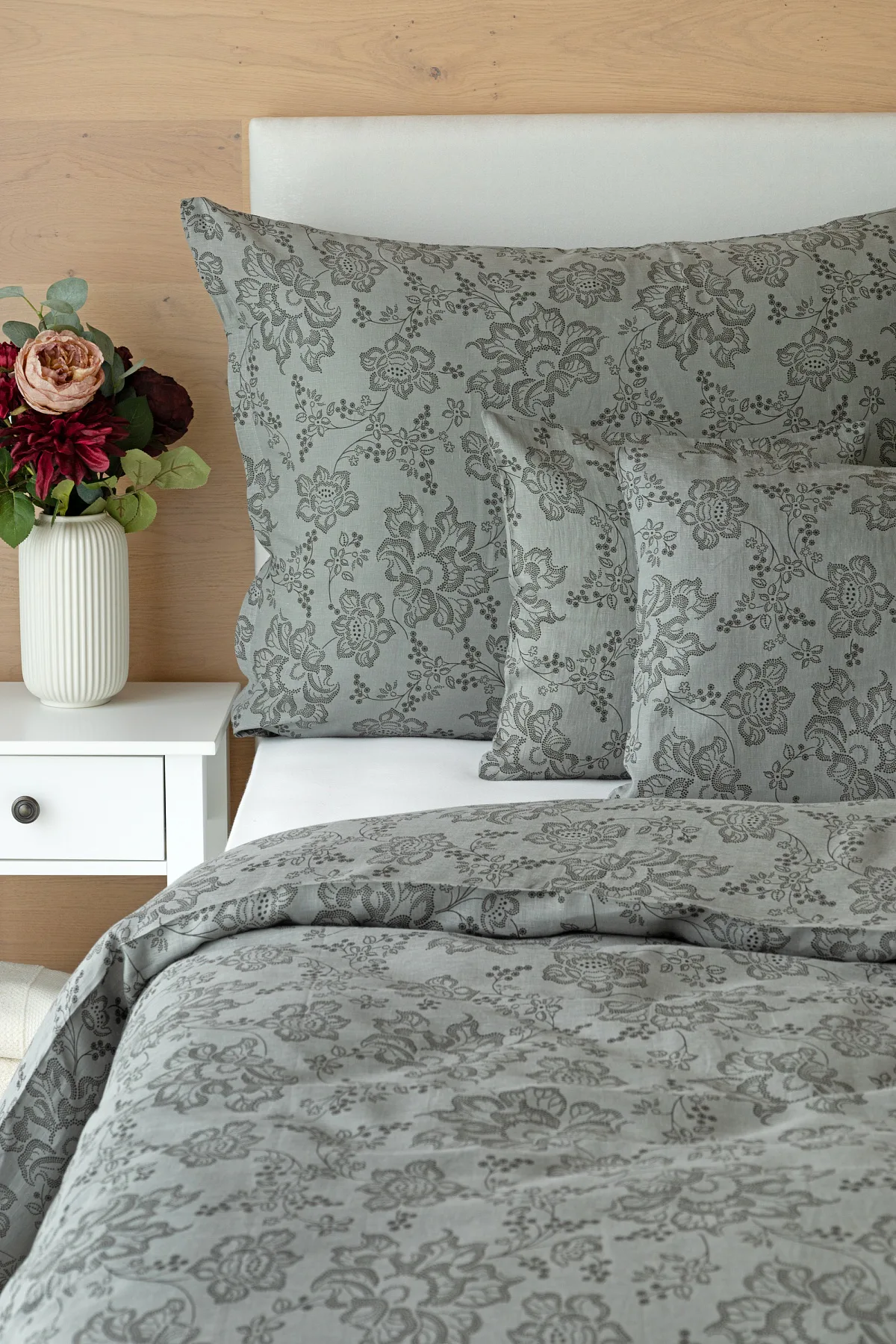 Objevte benefity jedinečného přírodního materiálu a dopřejte si nezaměnitelný komfort s naším lněným povlečením Leilani. Originální florální motiv v antracitové barvě vyniká na šédém podkladu ložního povlečení. Elegntní vzor v kombinaci s tímto ekologicky šetrným materiálem doladí k dokonalosti každý interiér s rustikálním nádechem, ale může být noblesní ozdobou i v moderně zařízené ložnici.