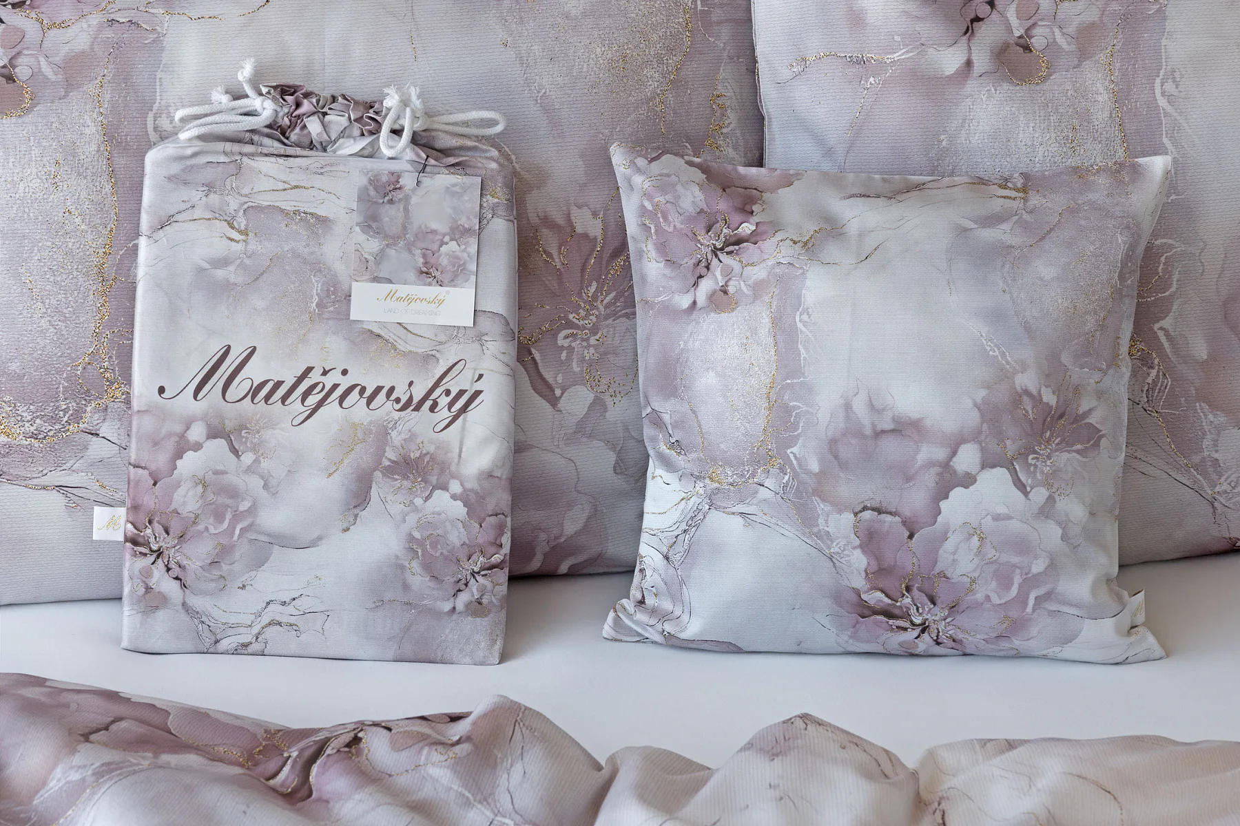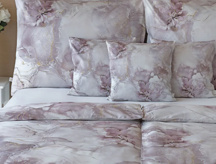 Tento elegantní vzor spojuje jemnou mramorovou kresbu s důmyslně zakomponovanými květinovými konturami. Lehké přechody v odstínech lila, starorůžové a smetanové barvy se prolínají s decentními zlatavými liniemi, které celému dezénu dodávají nádech luxusu. Povlak na polštář i na přikrývku je z obou stran stejný, vrchní stranu povlaku na polštář zdobí malé logo "M" v pravém dolním rohu. Povlečení je opatřeno komfortním zipovým uzávěrem.