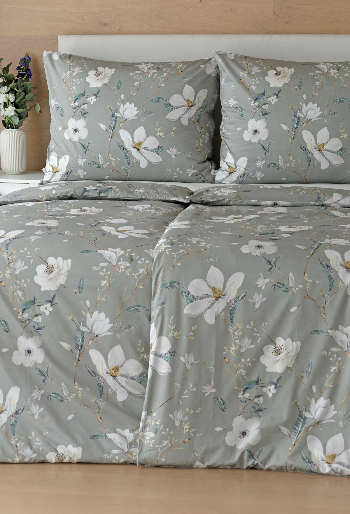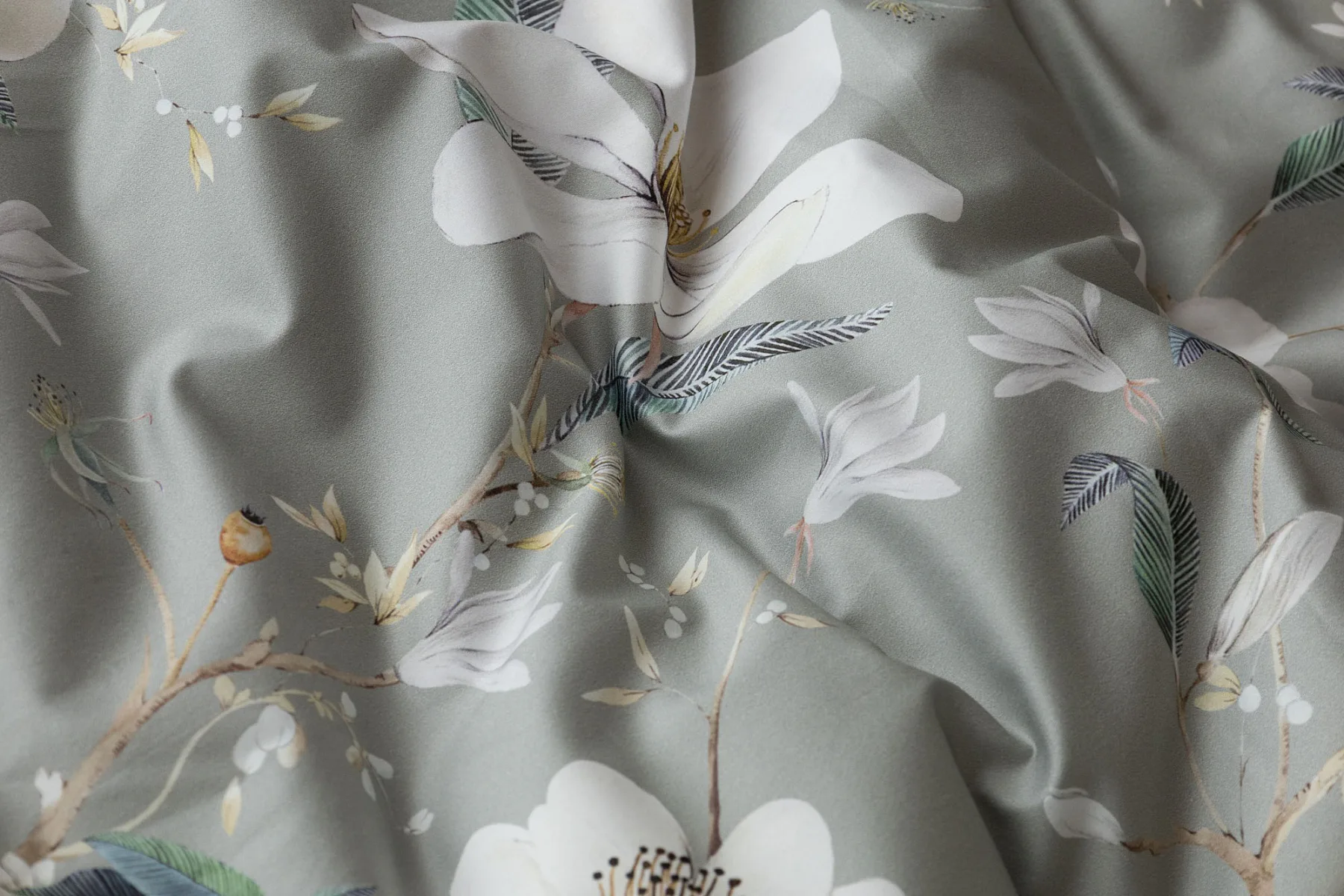 Elegantní květinový vzor ložního povlečení Lilian promění vaši ložnici v okouzlující místo a postará se o váš pohodlný spánek díky prvotřídnímu bavlněnému mako saténu. Větší a menší květy v bílé barvě vynikají na šedém podkladu s jemným zeleným podtónem.