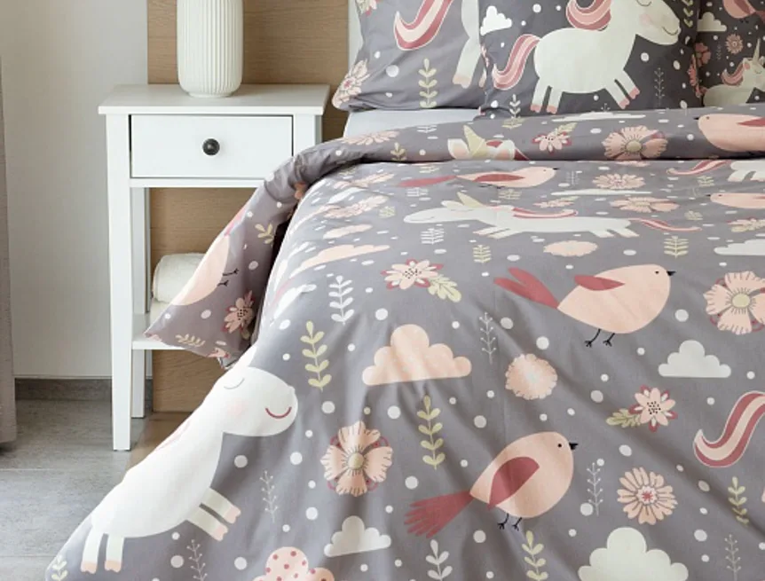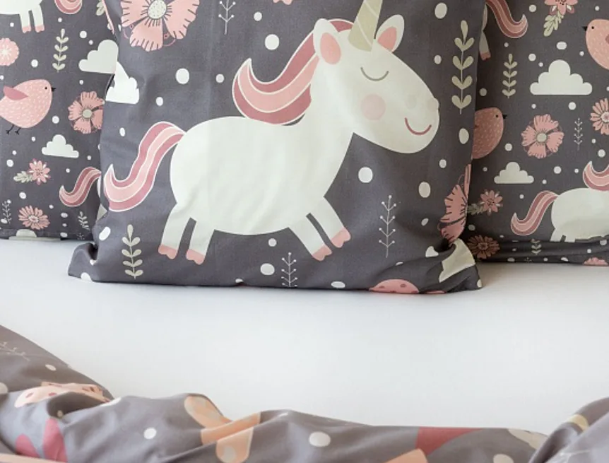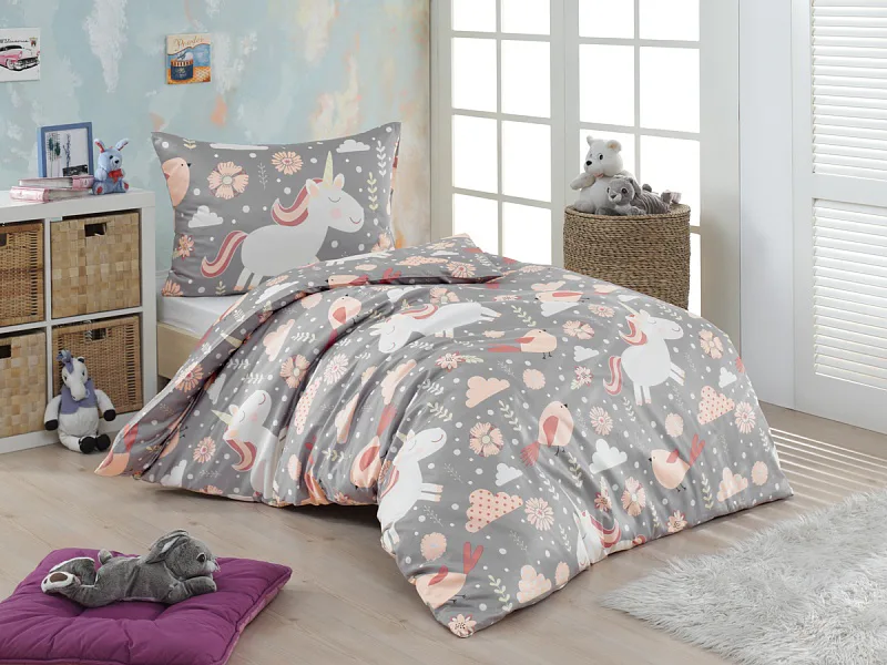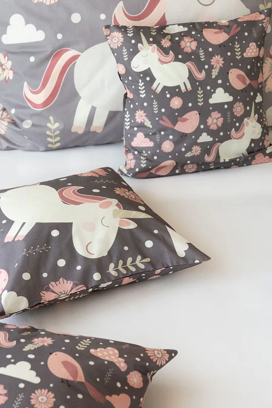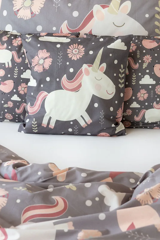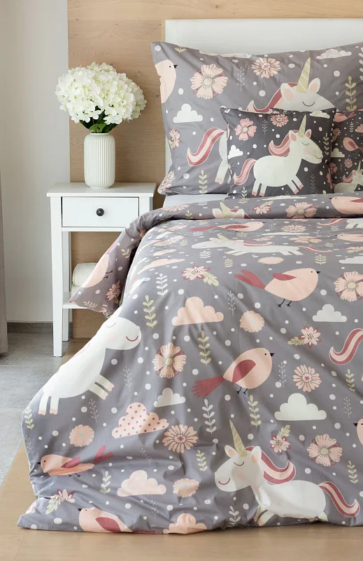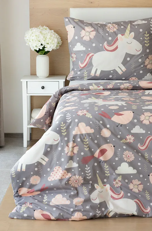 Něžné povlečení Lily se postará o pohádkové snění všech malých princezen. Jemným pastelovým barvám vévodí odstíny světle růžové, tmavě malinové, krémově šedé a bílé barvy, které vynikají na mimořádně příjemném materiálu v provedení 100% bavlny deluxe. Oblíbený motiv bájných jednorožců doplňují ilustrace obláčků, kytiček a roztomilých ptáčků.