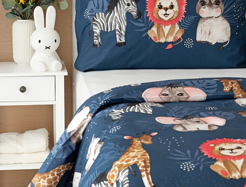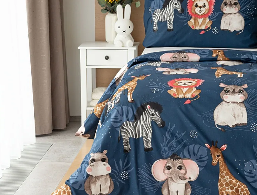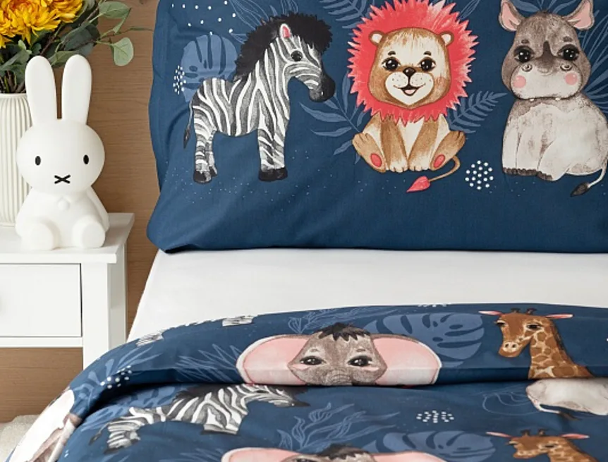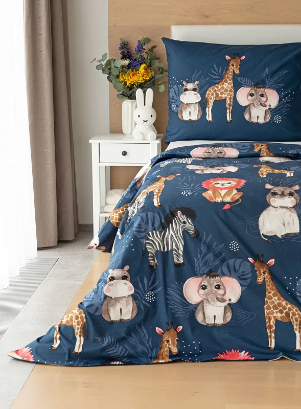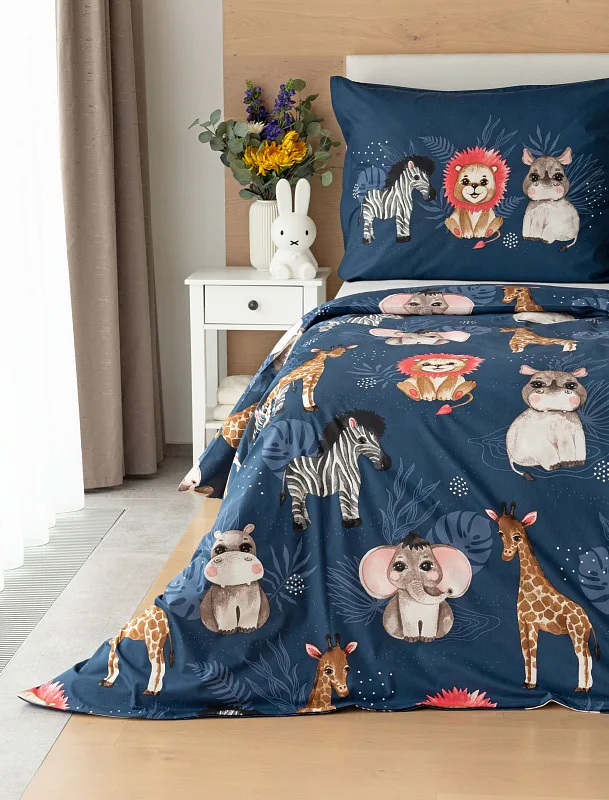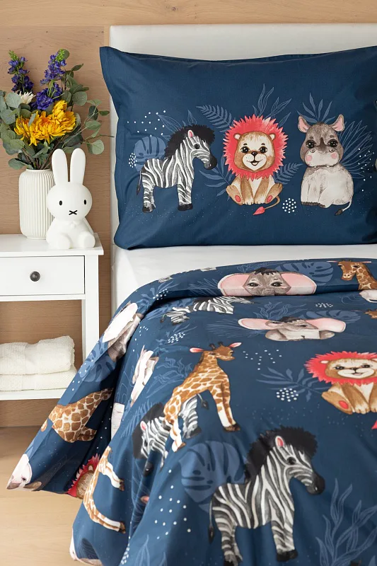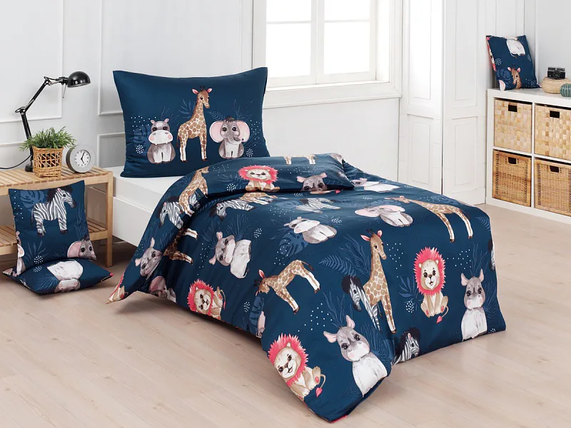 Povlak na přikrývku je z obou stran stejný, povlak na polštář zachycuje z každé strany jinou skupinu zvířátek. Povlečení je vyrobeno ze 100% bavlny a je opatřeno praktickým zipovým uzávěrem.