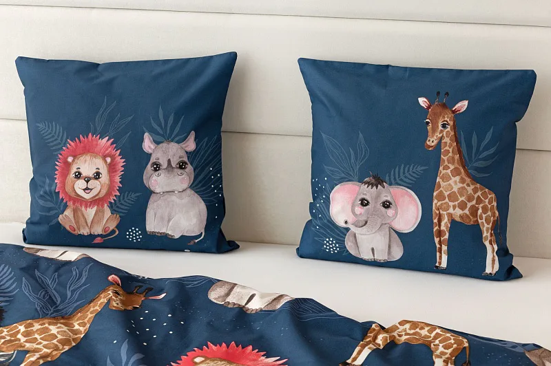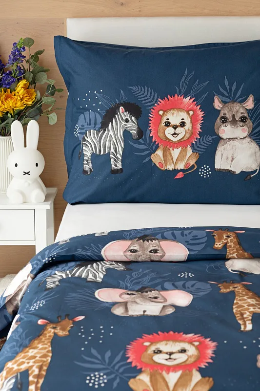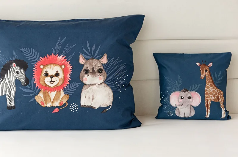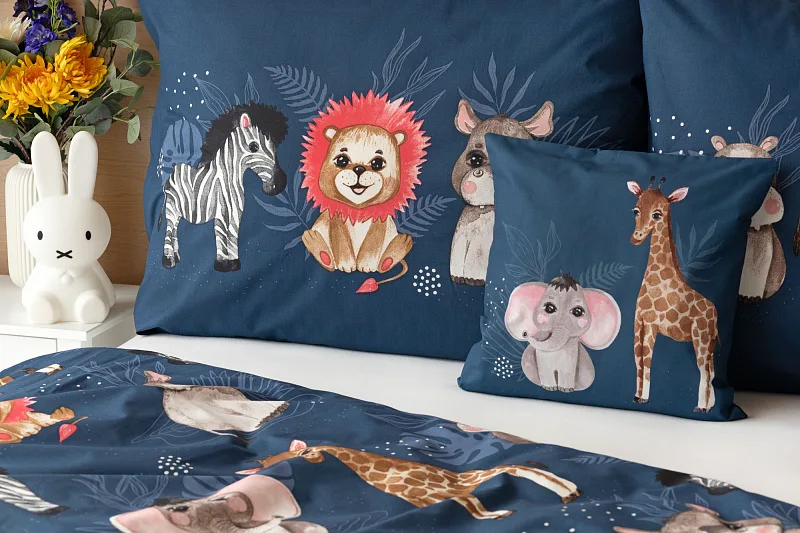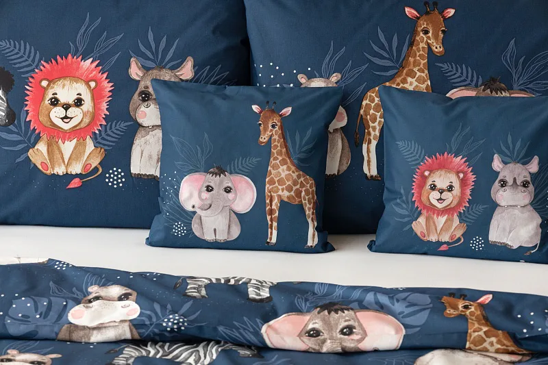 Bavlněné povlečení Little Jungle rozzáří dětské oči i pokojíček. Roztomilá exotická zvířátka na temně modrém podkladu budou vyprovázet děti do světa snů noc co noc.