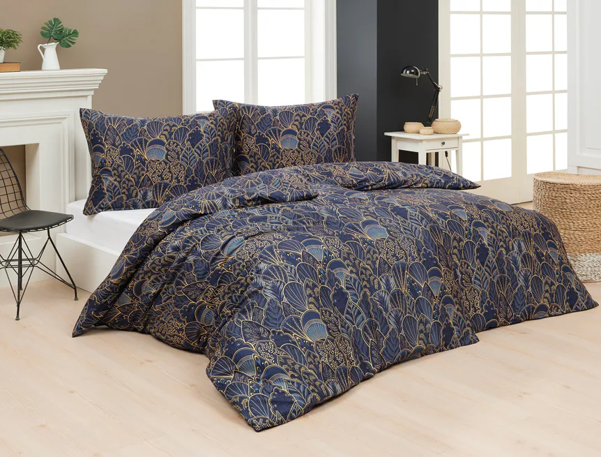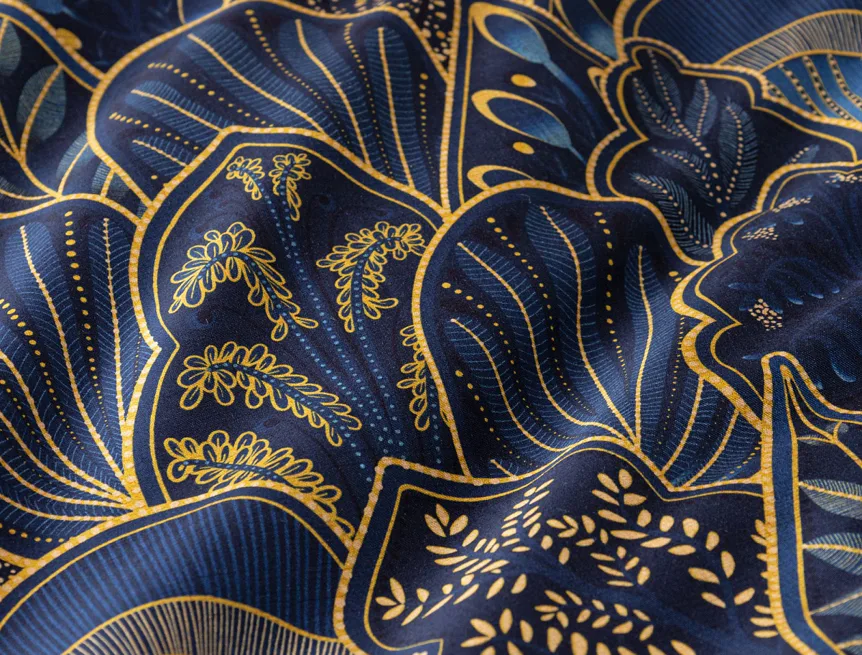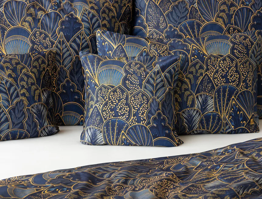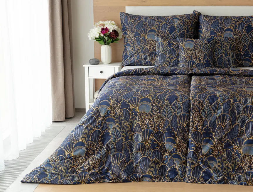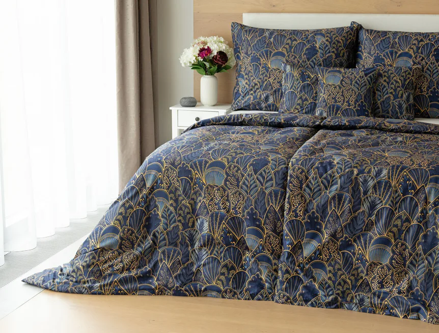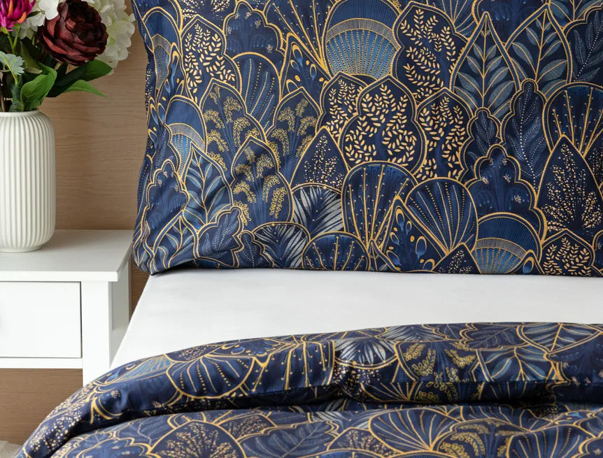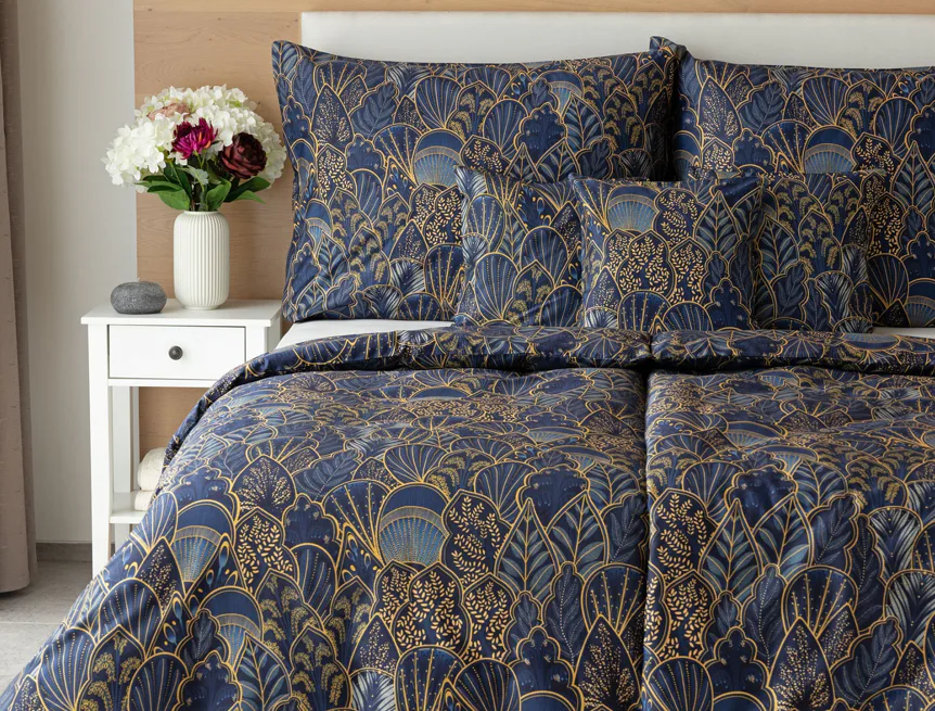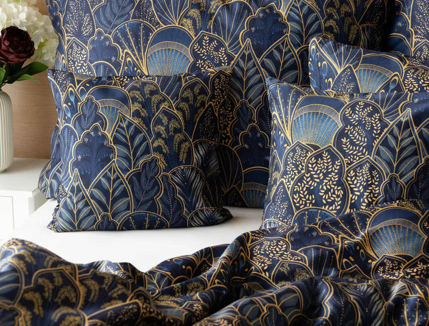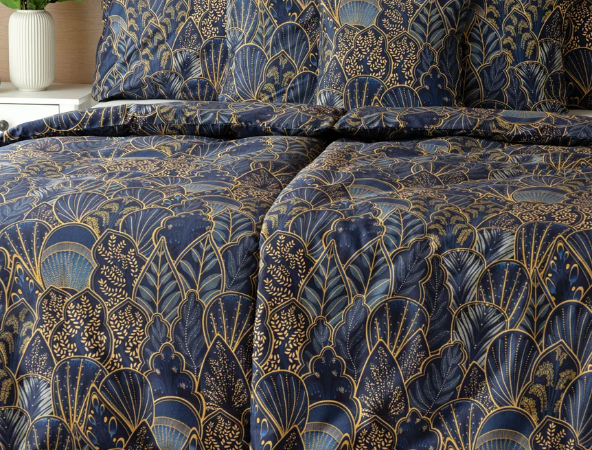 Objevte dokonalou eleganci s ložním povlečením Livia Blue. Zlatavé motivy ve znamení exotiky okořeněné špetkou orientu skvěle vynikají na podkladu v barvě noční oblohy. Díky nejmodernějšímu digitálnímu tisku můžete obdivovat precizní detail tištěného vzoru.