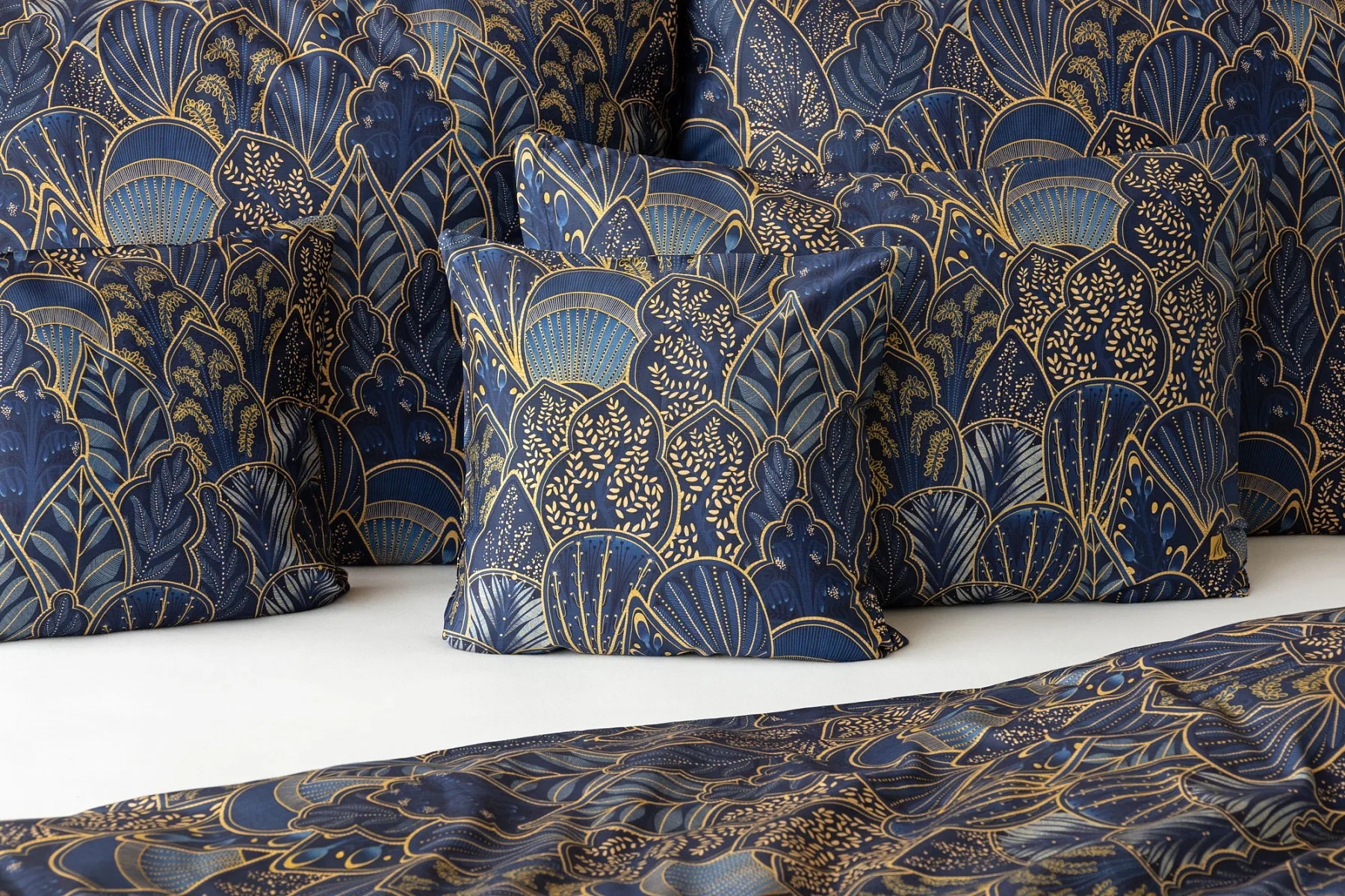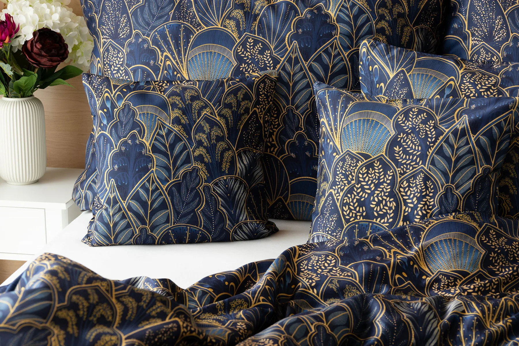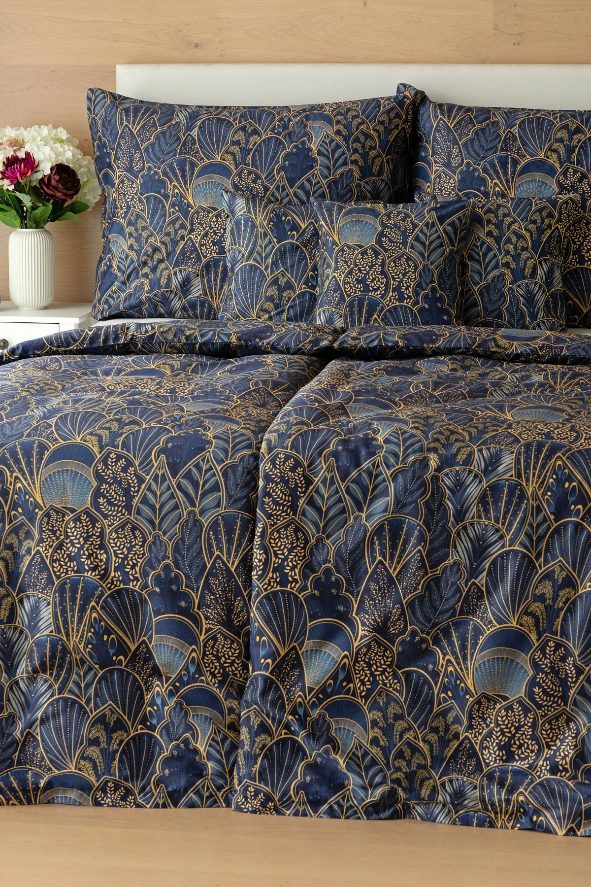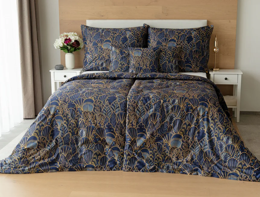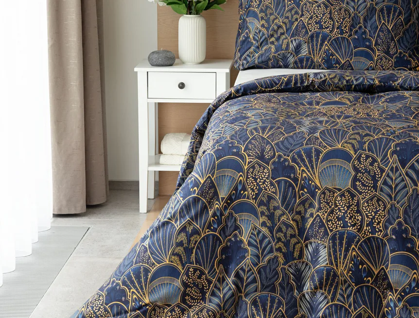 Objevte dokonalou eleganci s ložním povlečením Livia Blue. Zlatavé motivy ve znamení exotiky okořeněné špetkou orientu skvěle vynikají na podkladu v barvě noční oblohy. Díky nejmodernějšímu digitálnímu tisku můžete obdivovat precizní detail tištěného vzoru.
