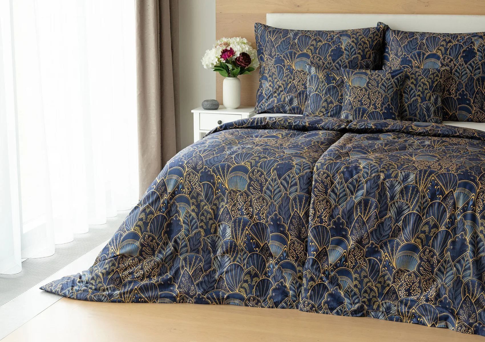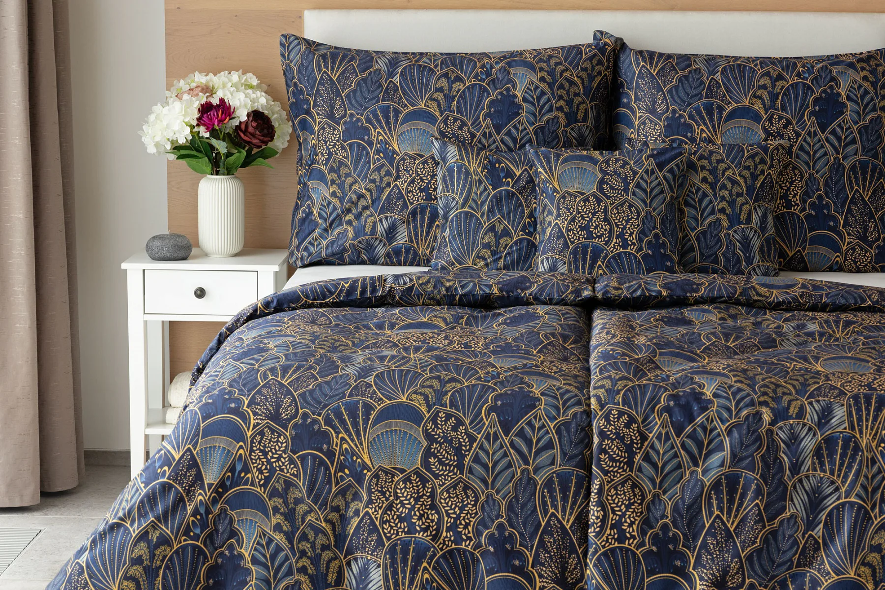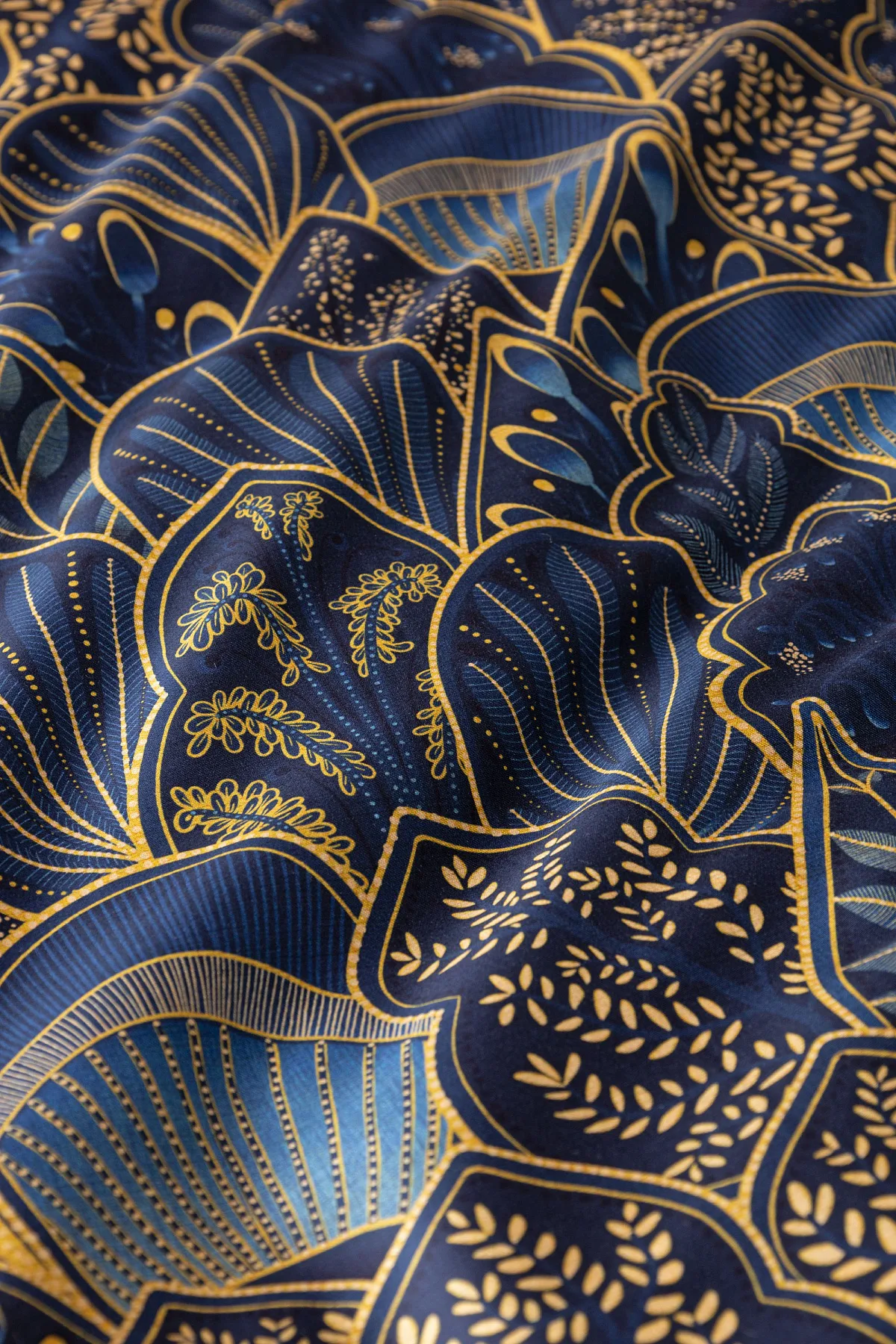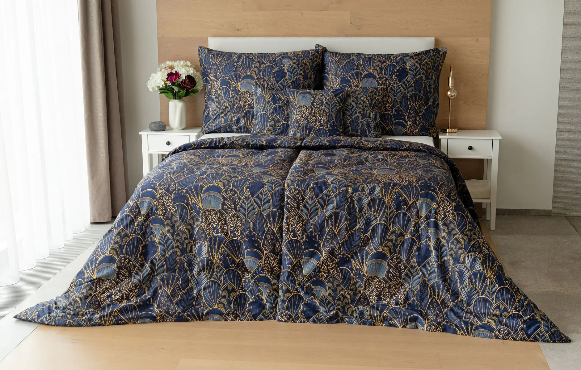 Objevte dokonalou eleganci s ložním povlečením Livia Blue. Zlatavé motivy ve znamení exotiky okořeněné špetkou orientu skvěle vynikají na podkladu v barvě noční oblohy. Díky nejmodernějšímu digitálnímu tisku můžete obdivovat precizní detail tištěného vzoru.