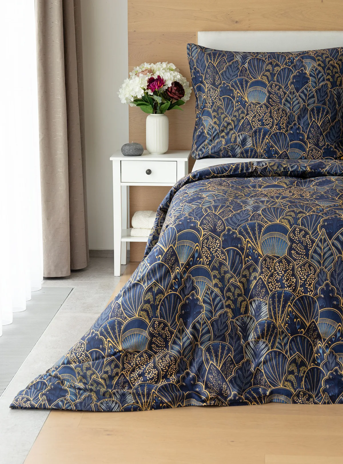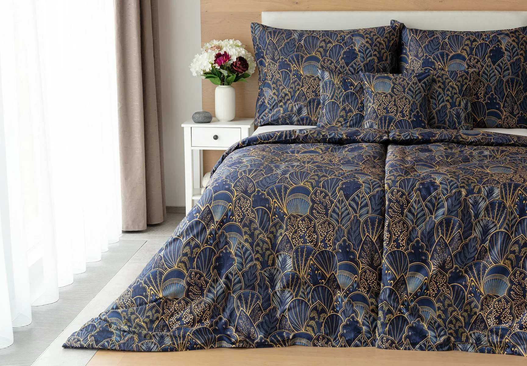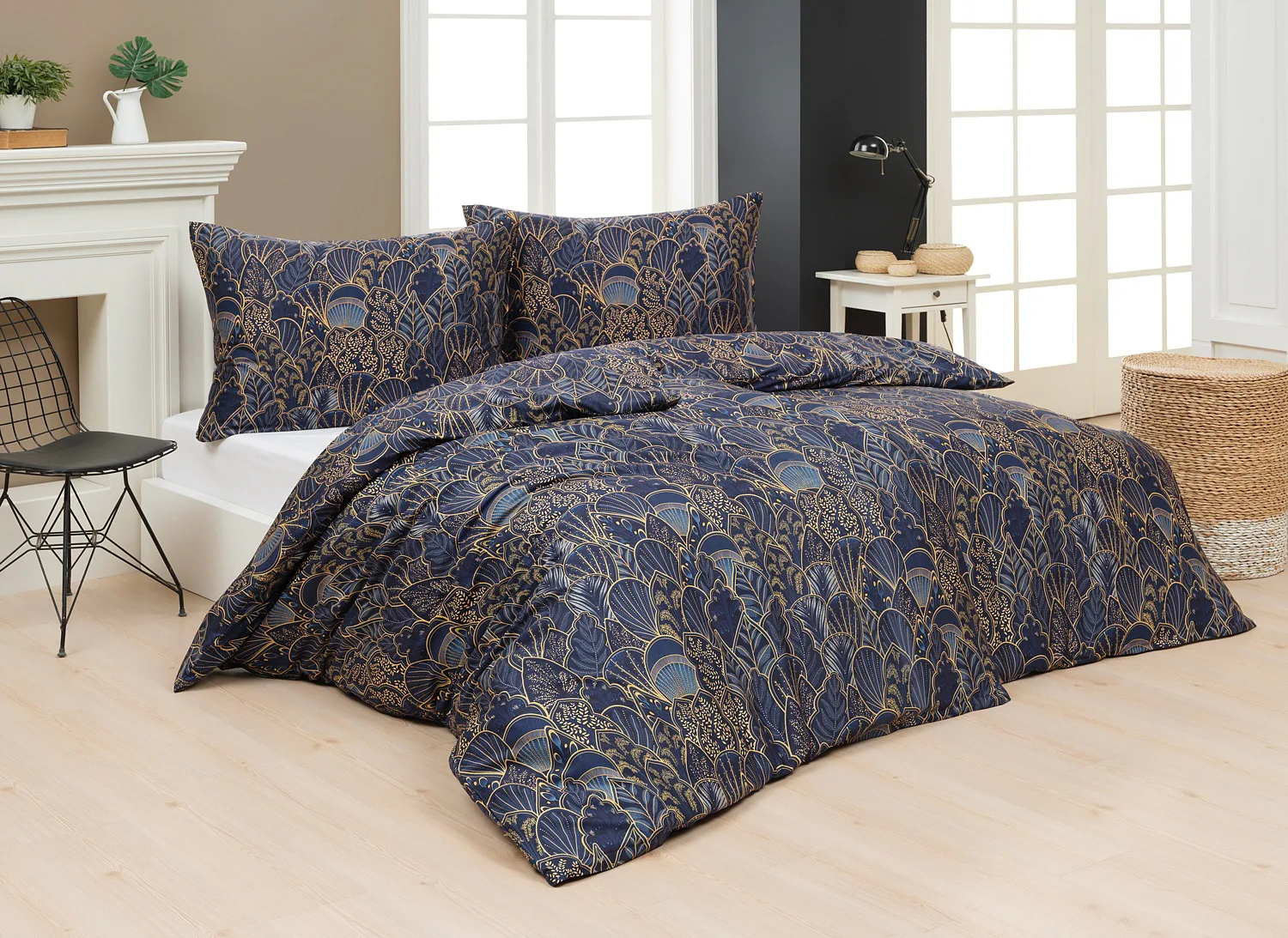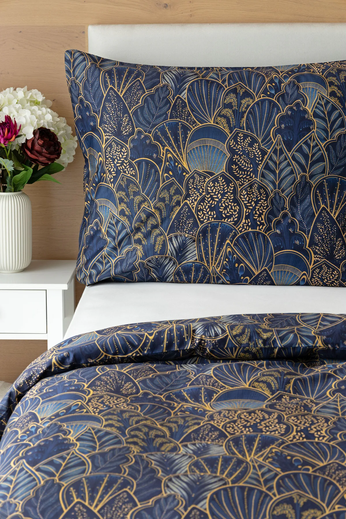 Objevte dokonalou eleganci s ložním povlečením Livia Blue. Zlatavé motivy ve znamení exotiky okořeněné špetkou orientu skvěle vynikají na podkladu v barvě noční oblohy. Díky nejmodernějšímu digitálnímu tisku můžete obdivovat precizní detail tištěného vzoru.