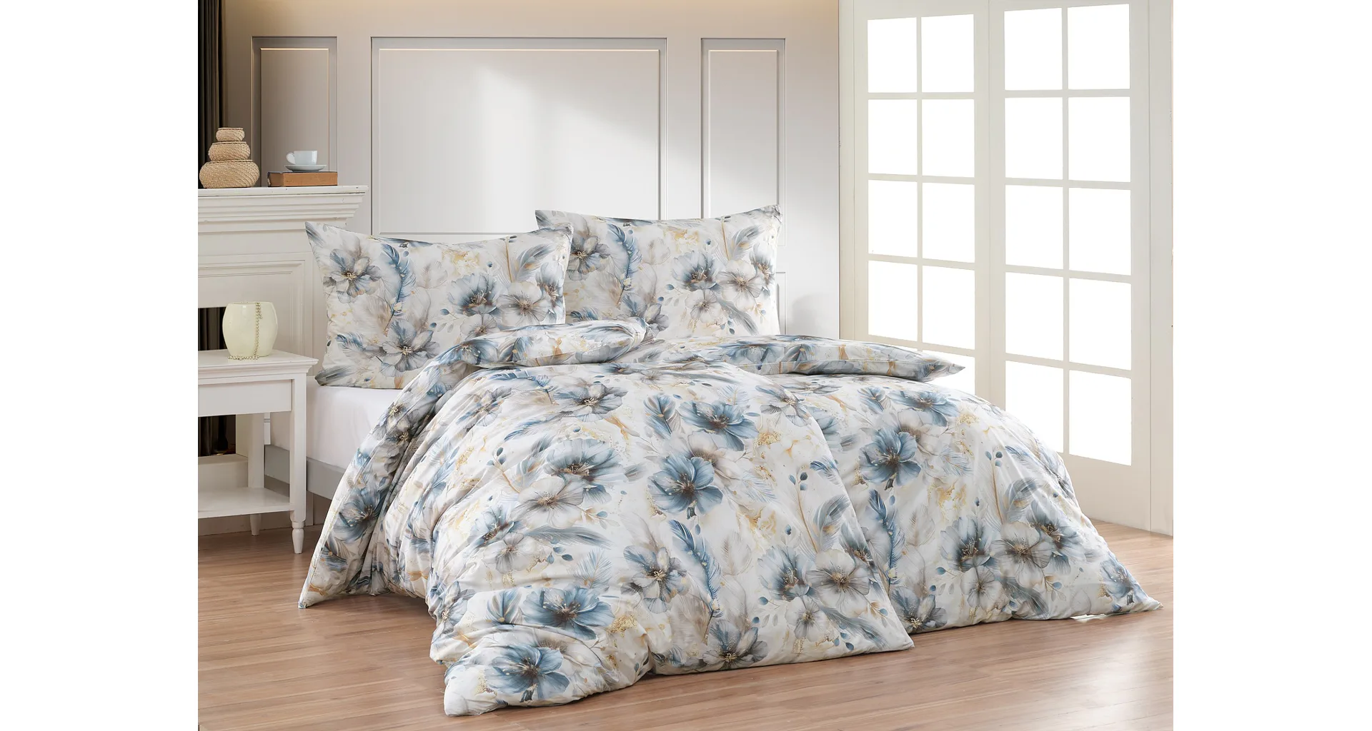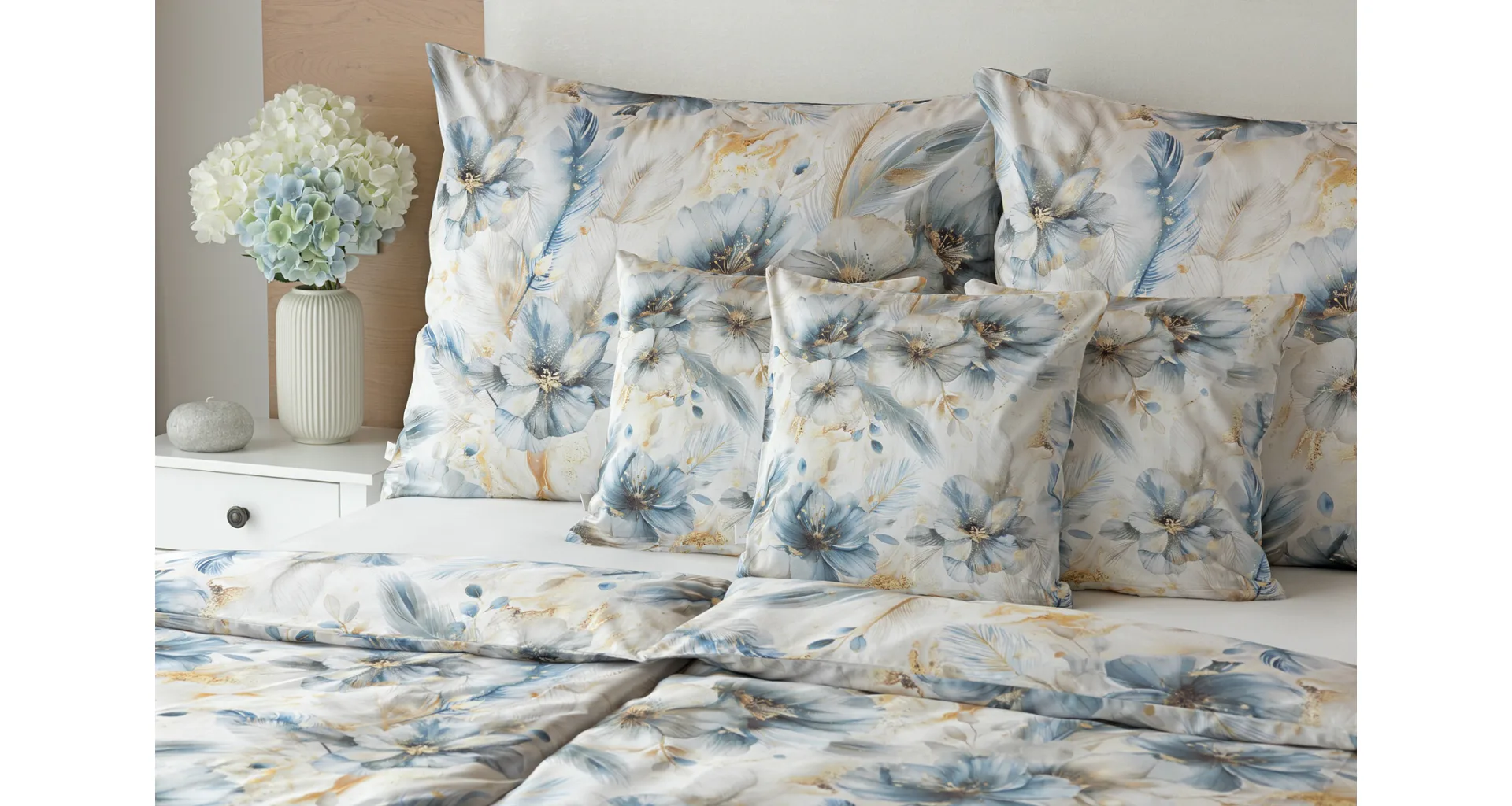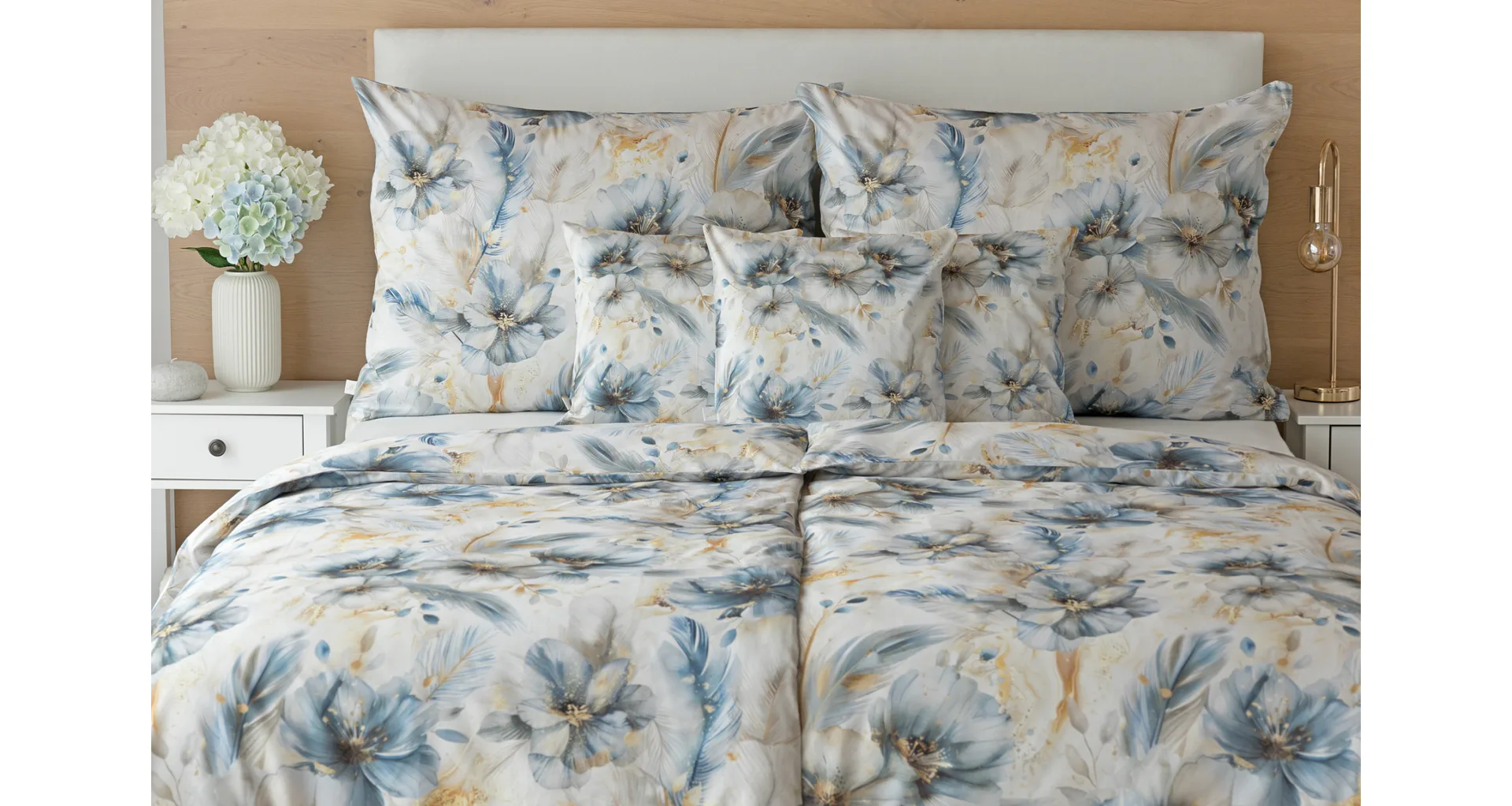 Vzor Lowell zdobí atraktivní květinový motiv v paletě modrých, šedých a zlatavých tónů na krémově bílém podkladu. Povlak na polštář i na přikrývku je z obou stran stejný, povlečení je opatřeno komfortním zipovým uzávěrem.