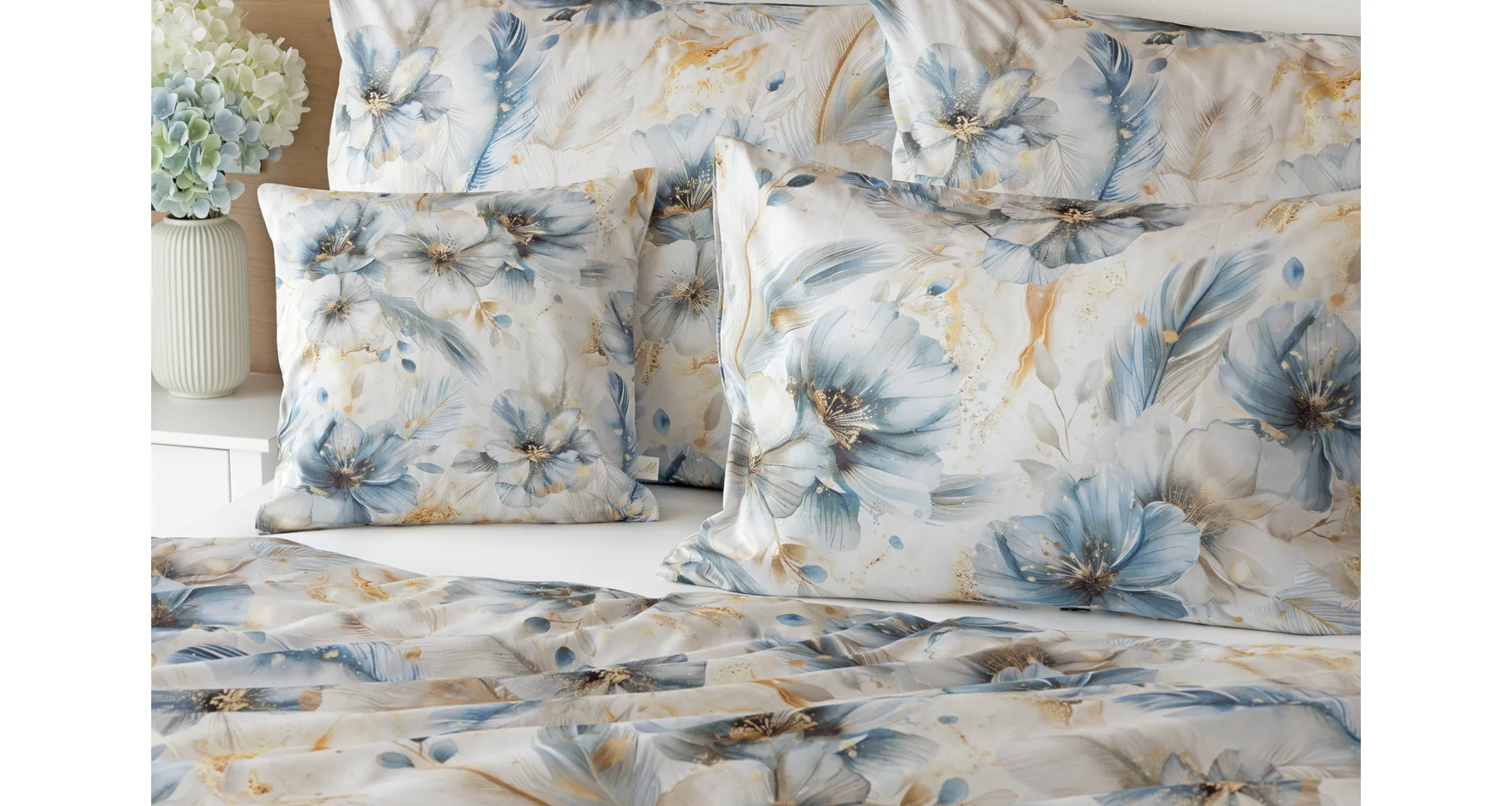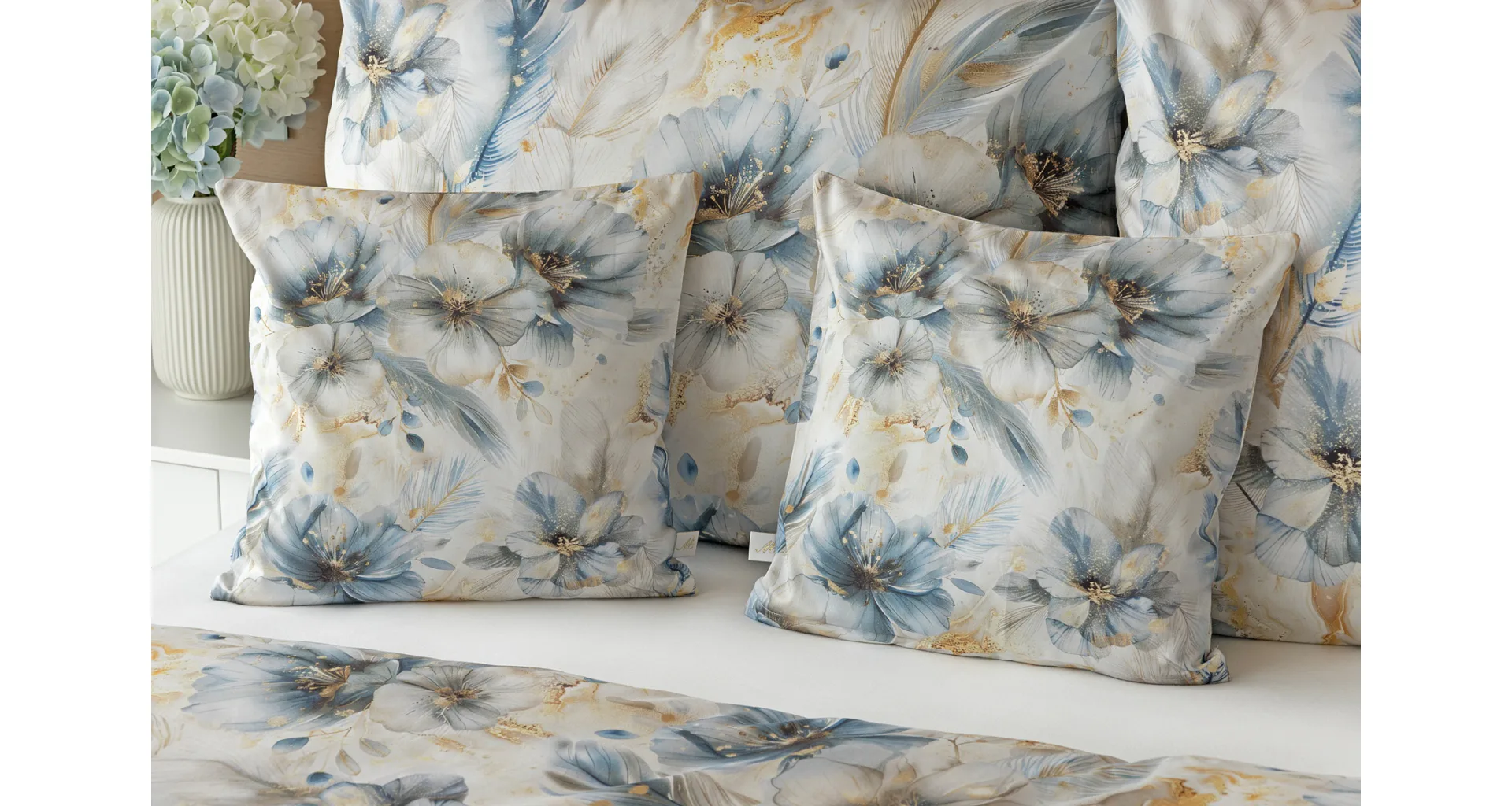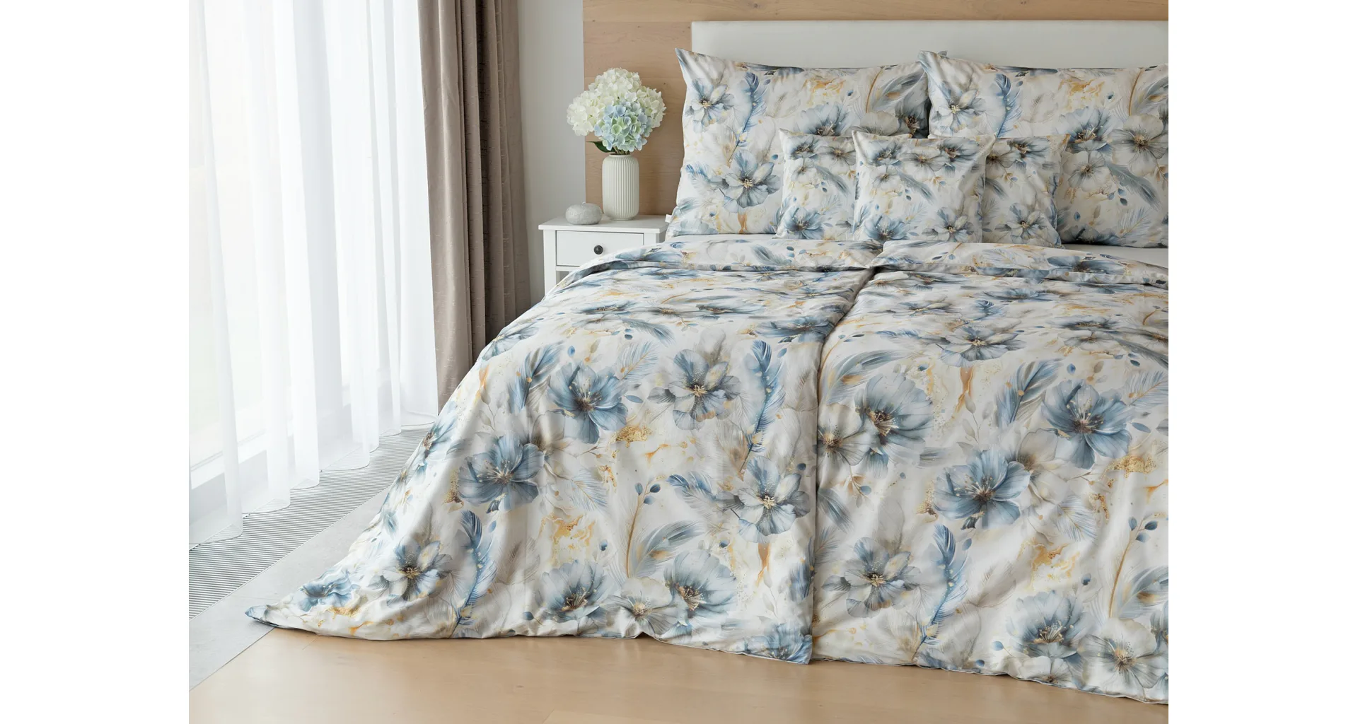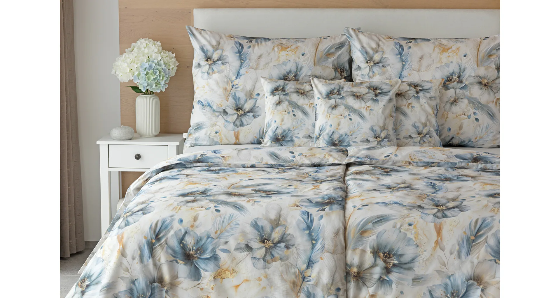 Vzor Lowell zdobí atraktivní květinový motiv v paletě modrých, šedých a zlatavých tónů na krémově bílém podkladu. Povlak na polštář i na přikrývku je z obou stran stejný, povlečení je opatřeno komfortním zipovým uzávěrem.