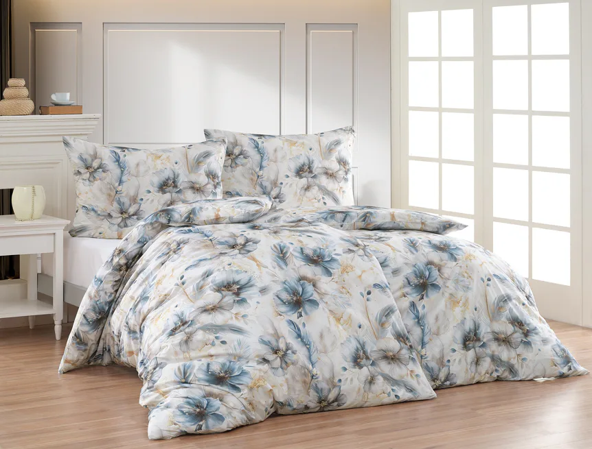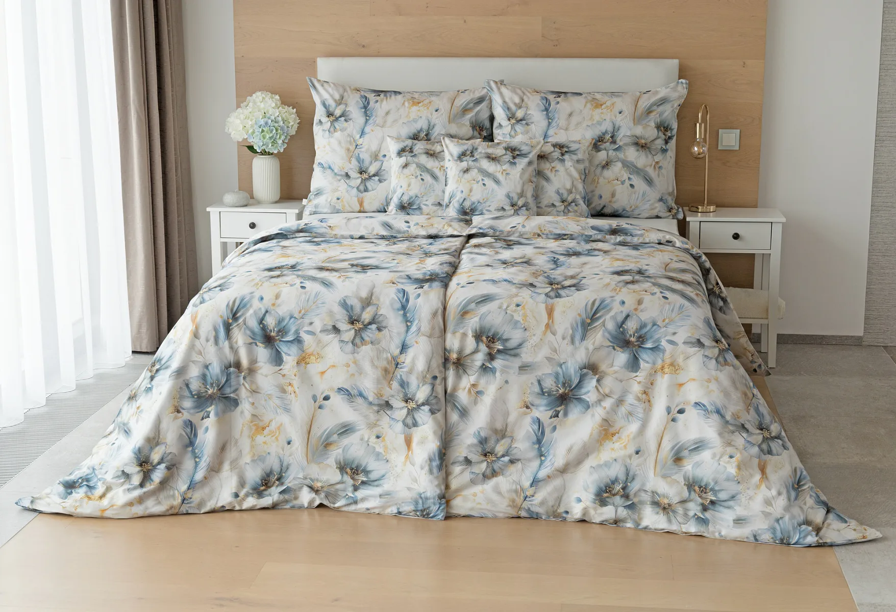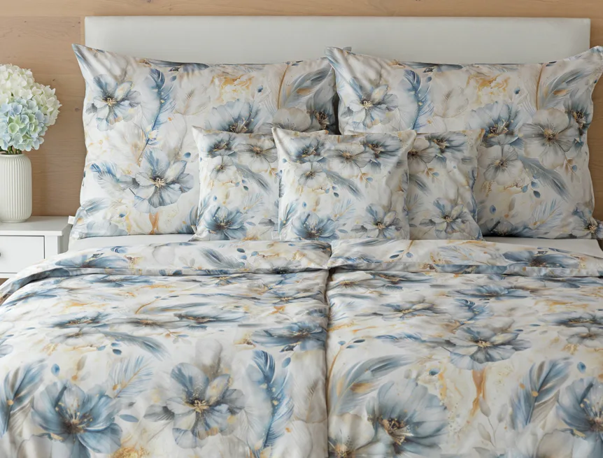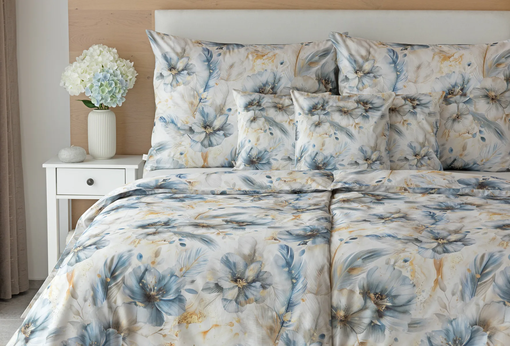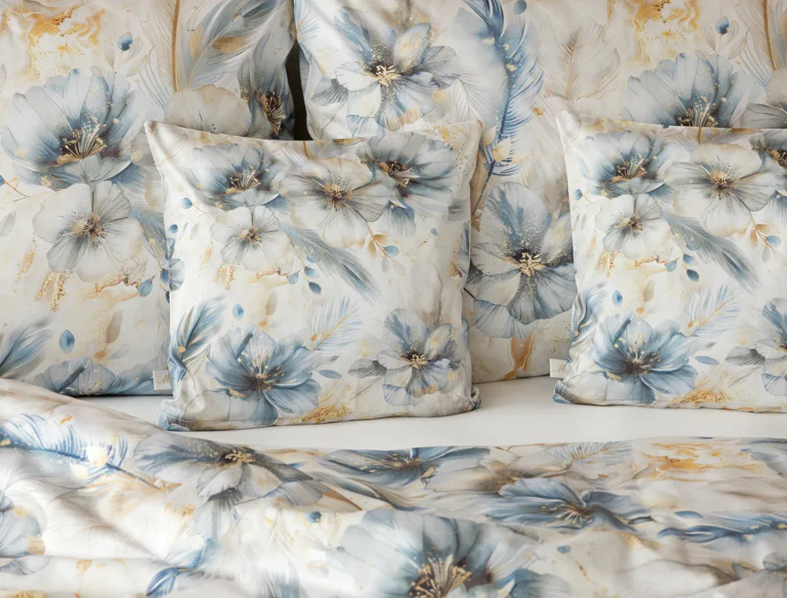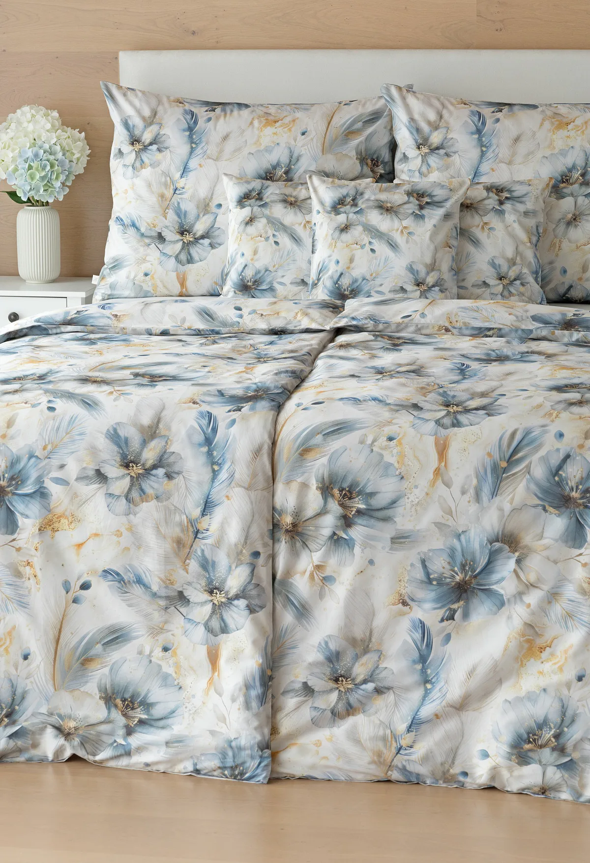 Vzor Lowell zdobí atraktivní květinový motiv v paletě modrých, šedých a zlatavých tónů na krémově bílém podkladu. Povlak na polštář i na přikrývku je z obou stran stejný, povlečení je opatřeno komfortním zipovým uzávěrem.