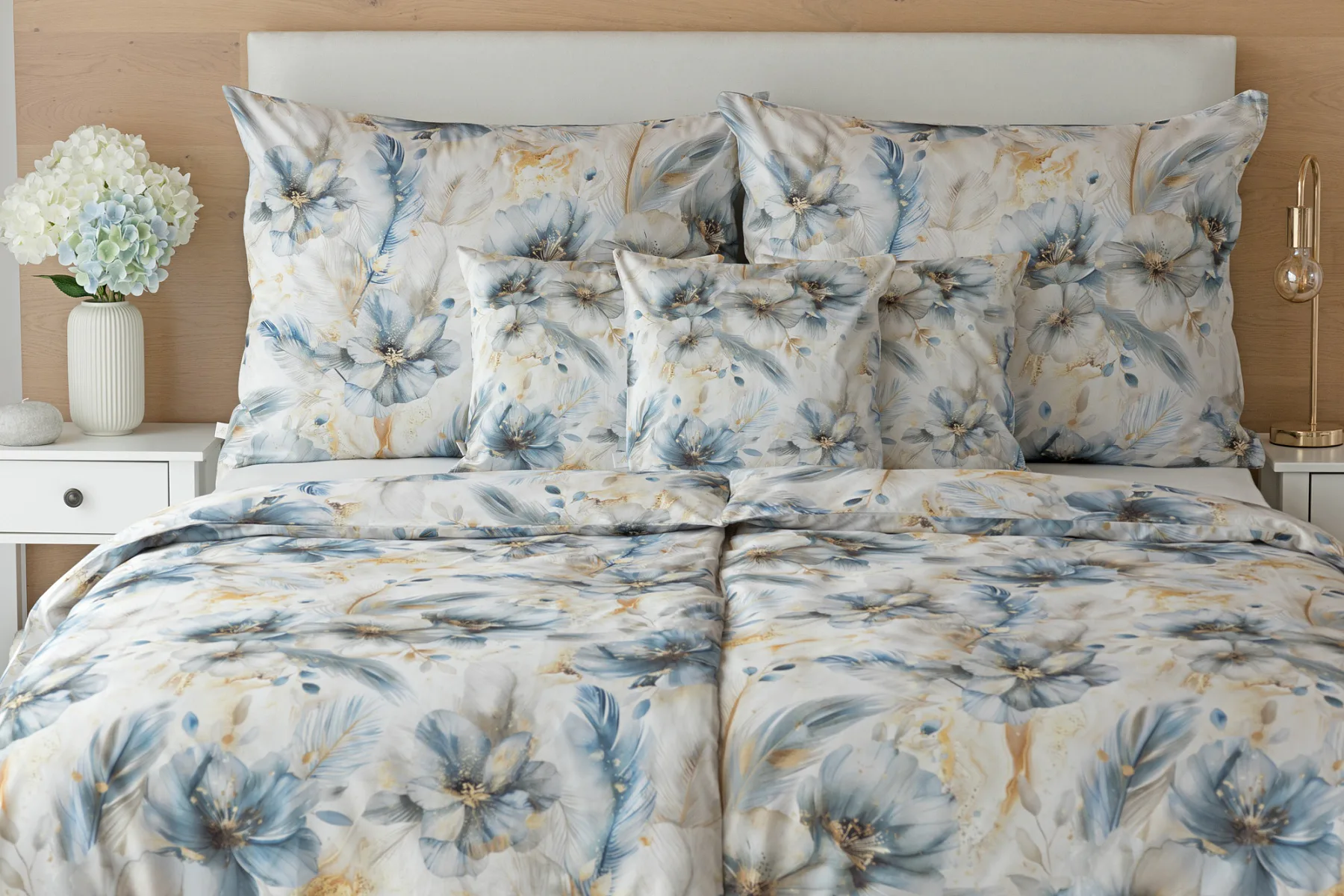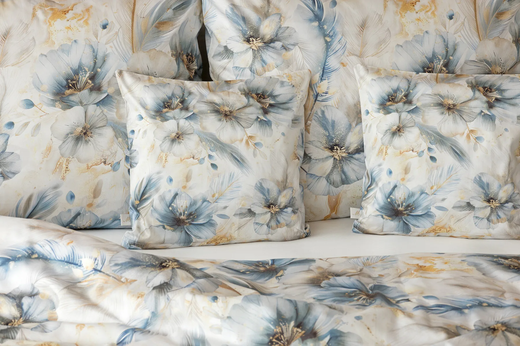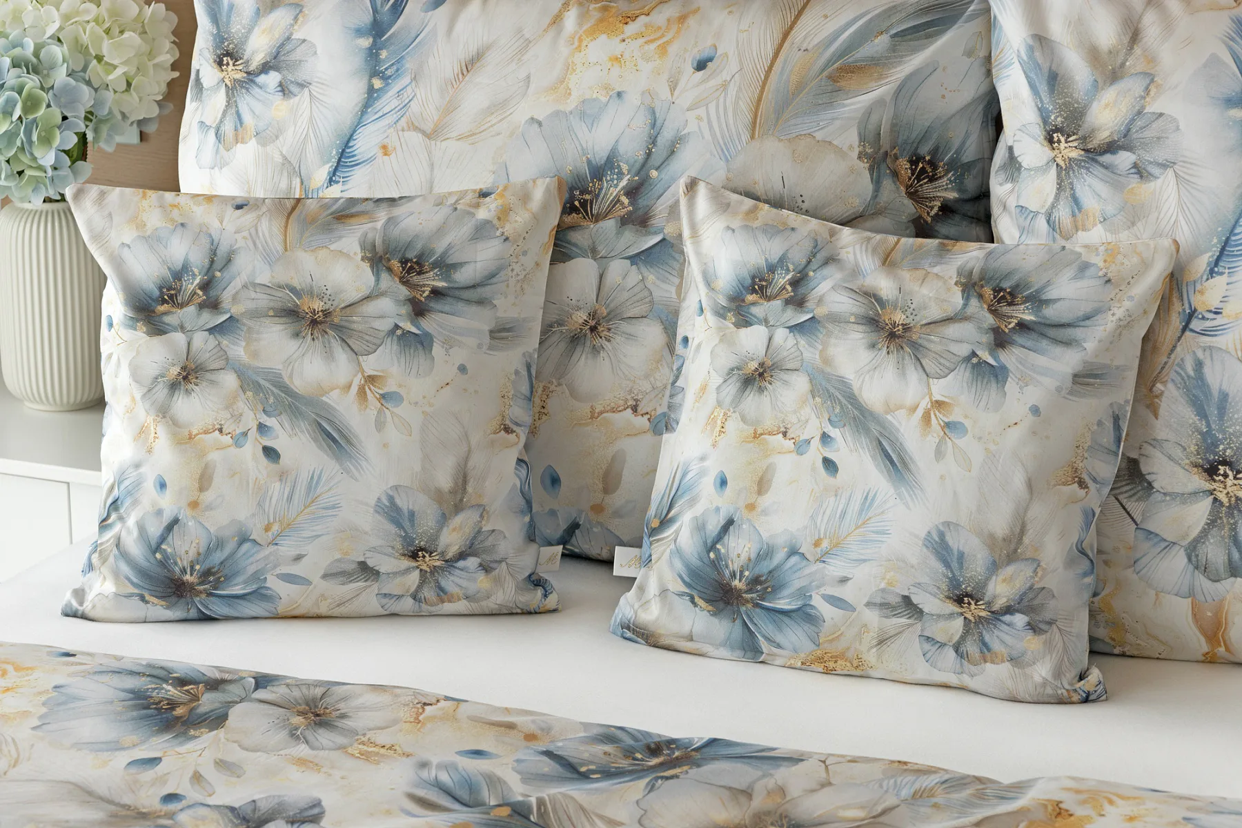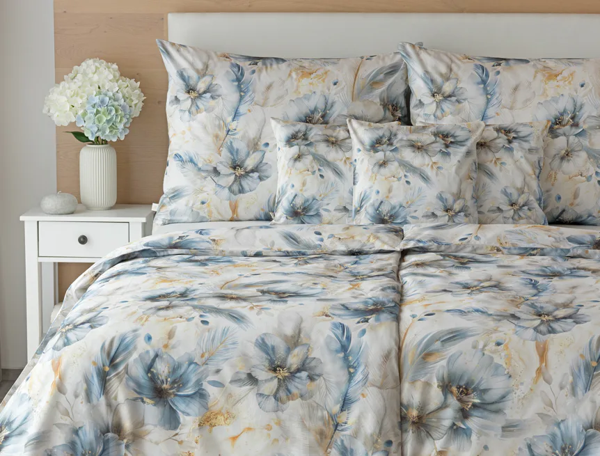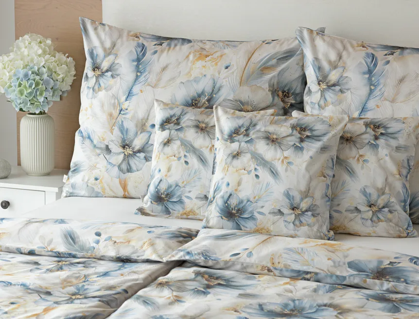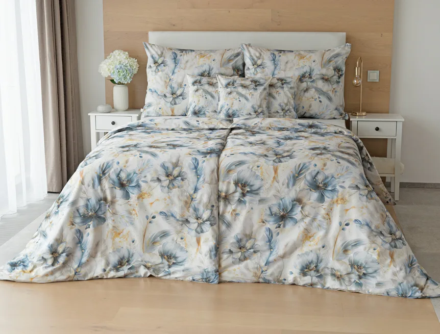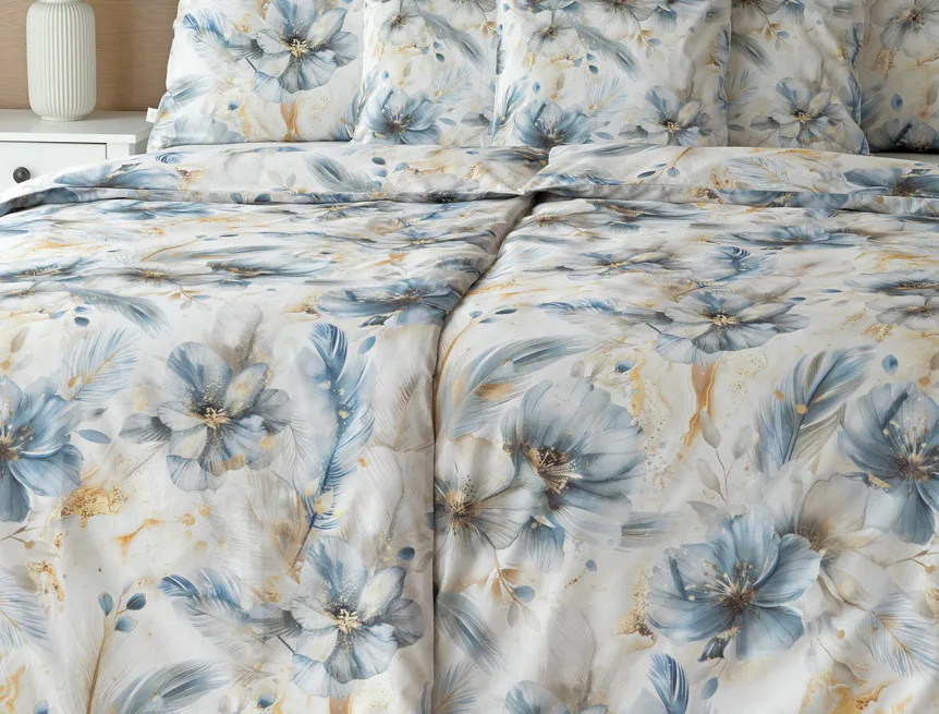 Vzor Lowell zdobí atraktivní květinový motiv v paletě modrých, šedých a zlatavých tónů na krémově bílém podkladu. Povlak na polštář i na přikrývku je z obou stran stejný, povlečení je opatřeno komfortním zipovým uzávěrem.