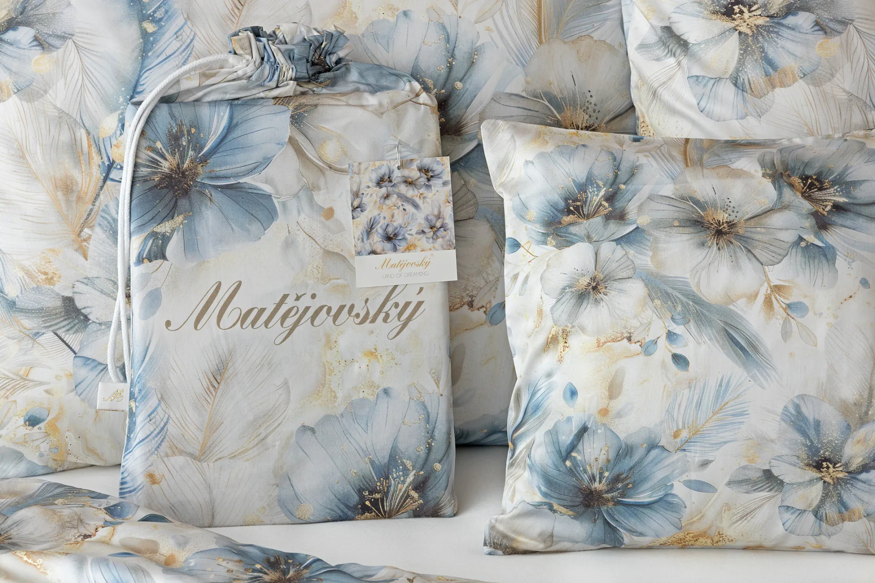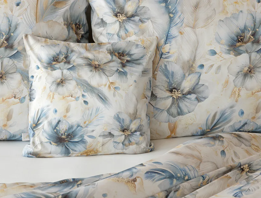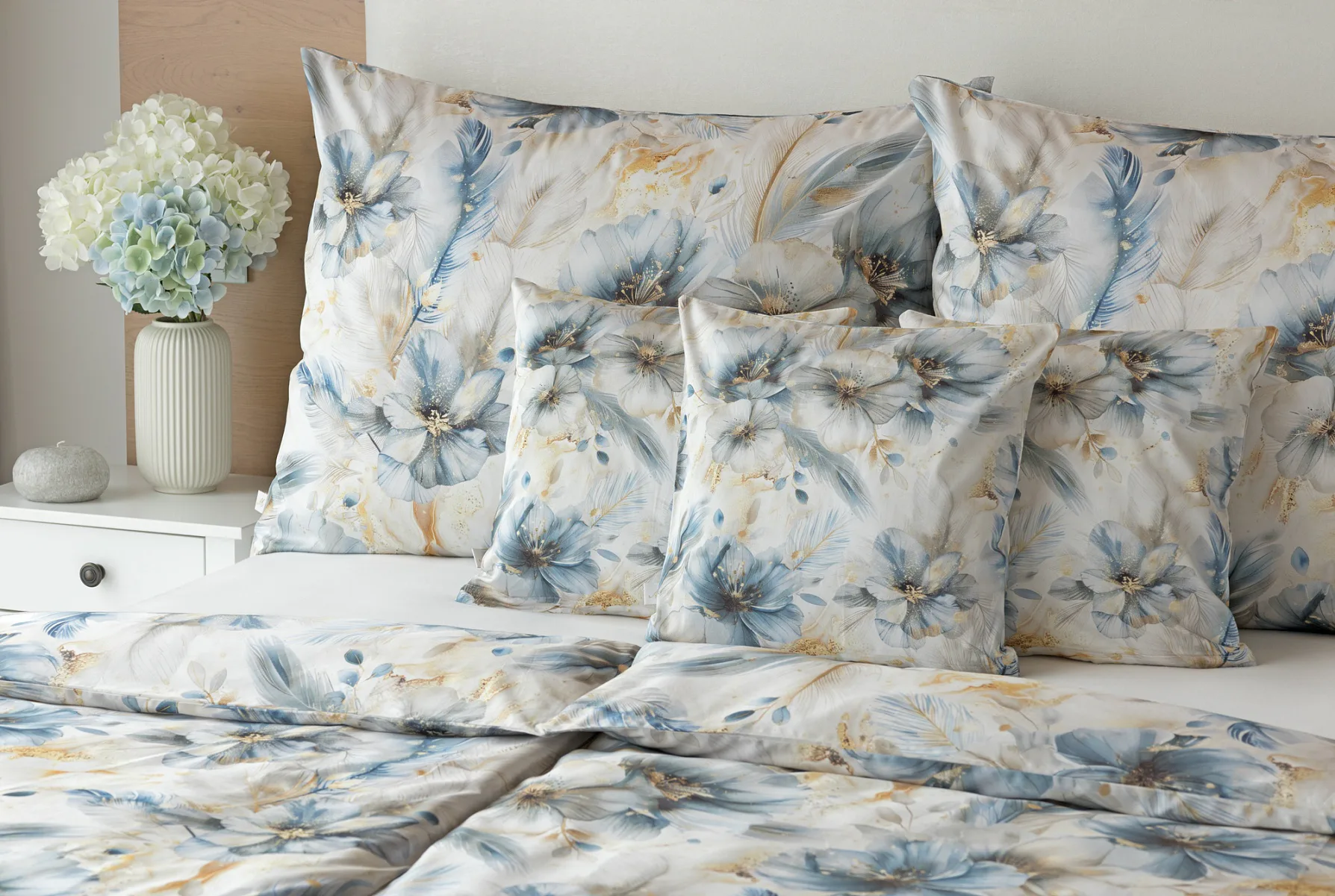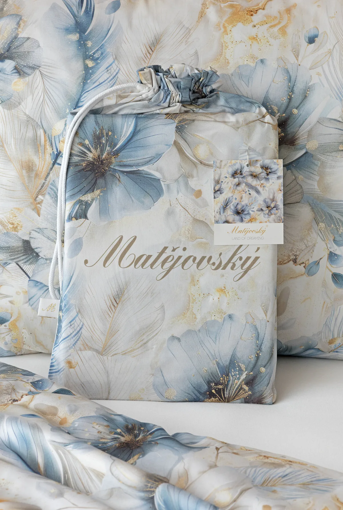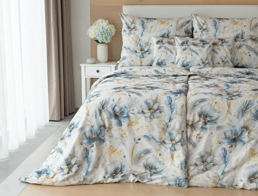 Vzor Lowell zdobí atraktivní květinový motiv v paletě modrých, šedých a zlatavých tónů na krémově bílém podkladu. Povlak na polštář i na přikrývku je z obou stran stejný, povlečení je opatřeno komfortním zipovým uzávěrem.
