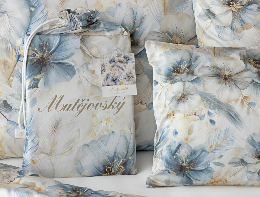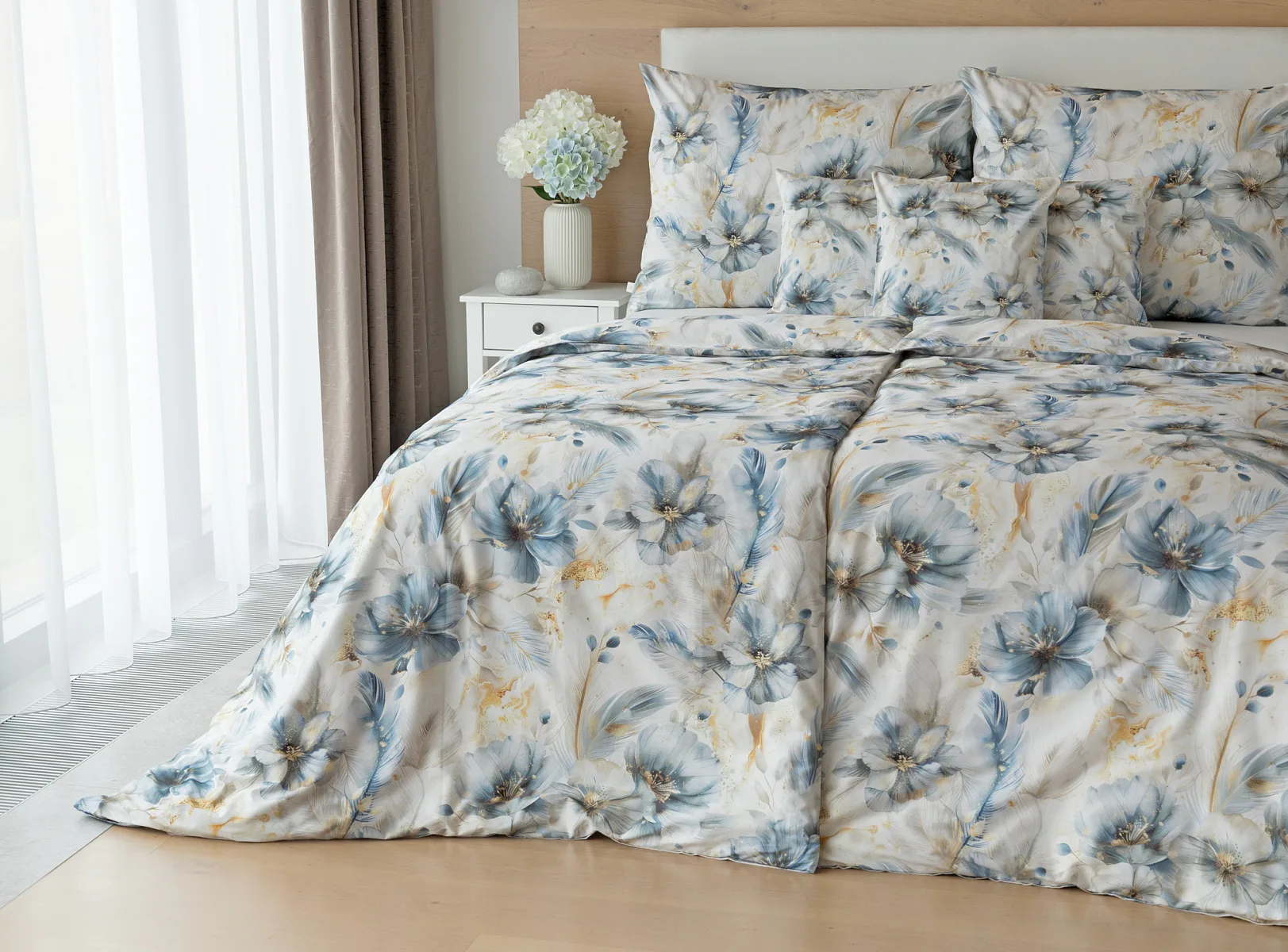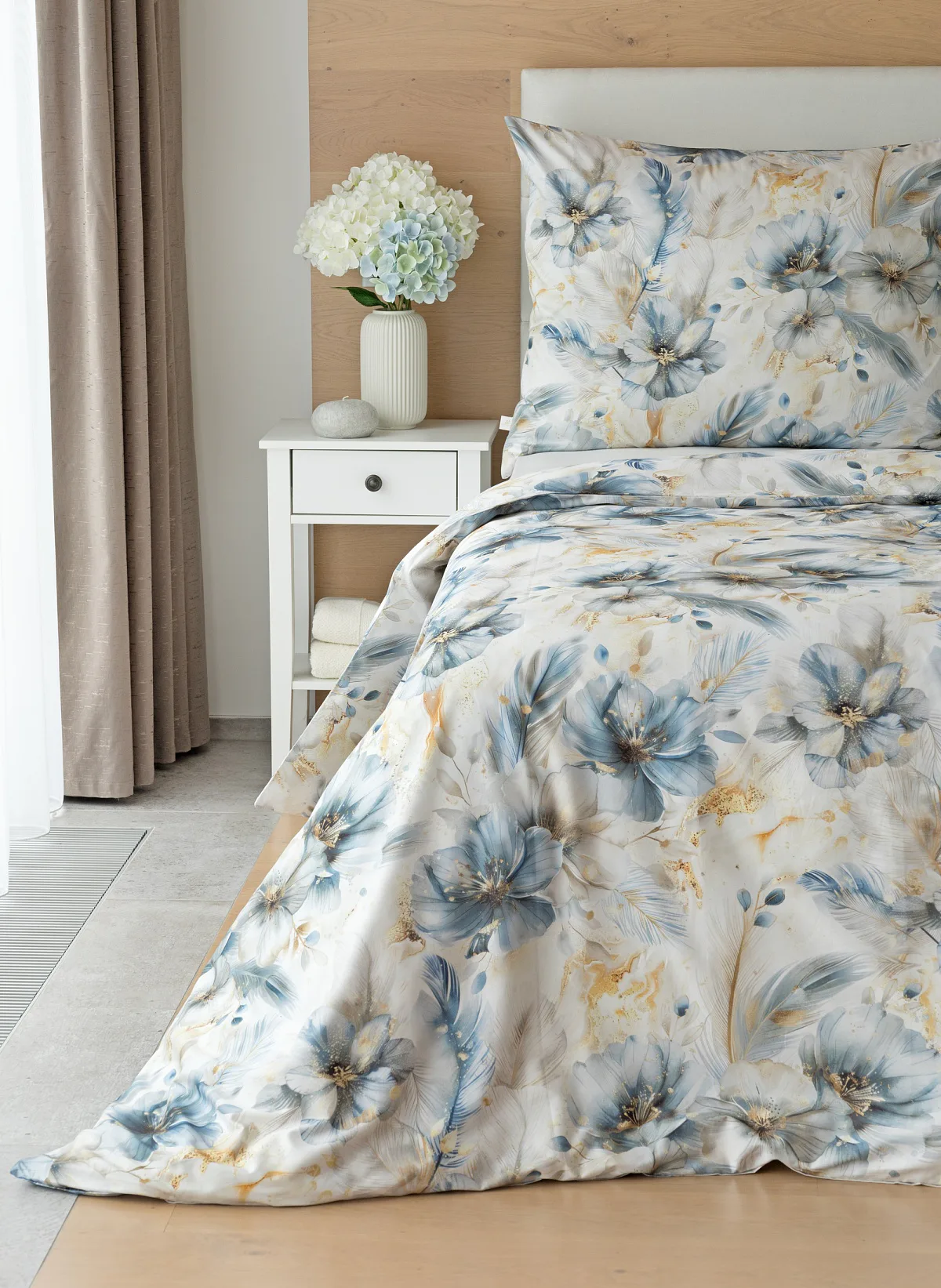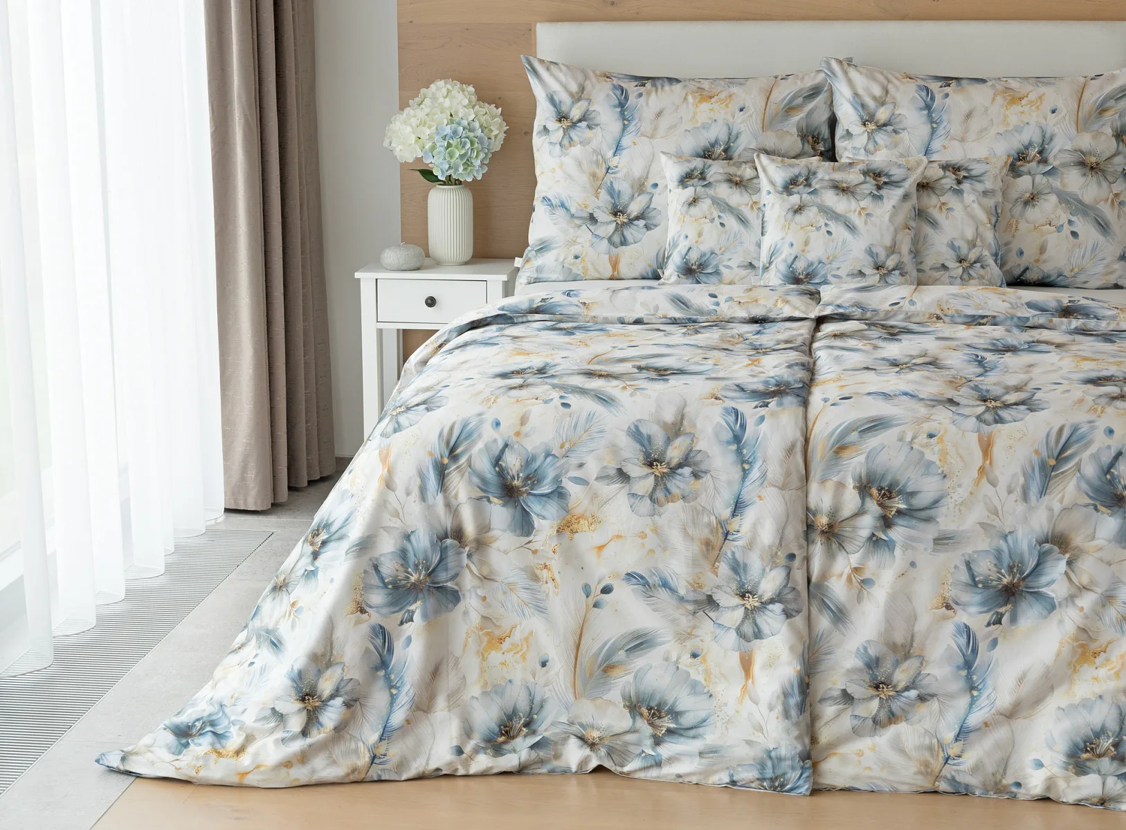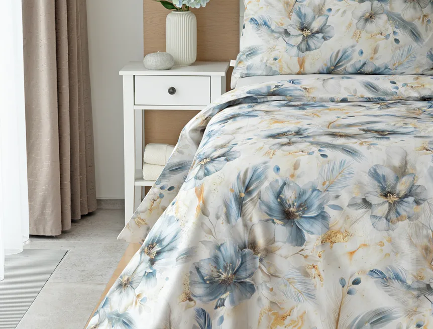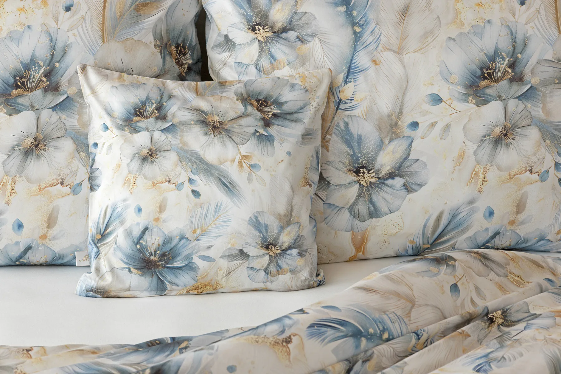 Vzor Lowell zdobí atraktivní květinový motiv v paletě modrých, šedých a zlatavých tónů na krémově bílém podkladu. Povlak na polštář i na přikrývku je z obou stran stejný, povlečení je opatřeno komfortním zipovým uzávěrem.