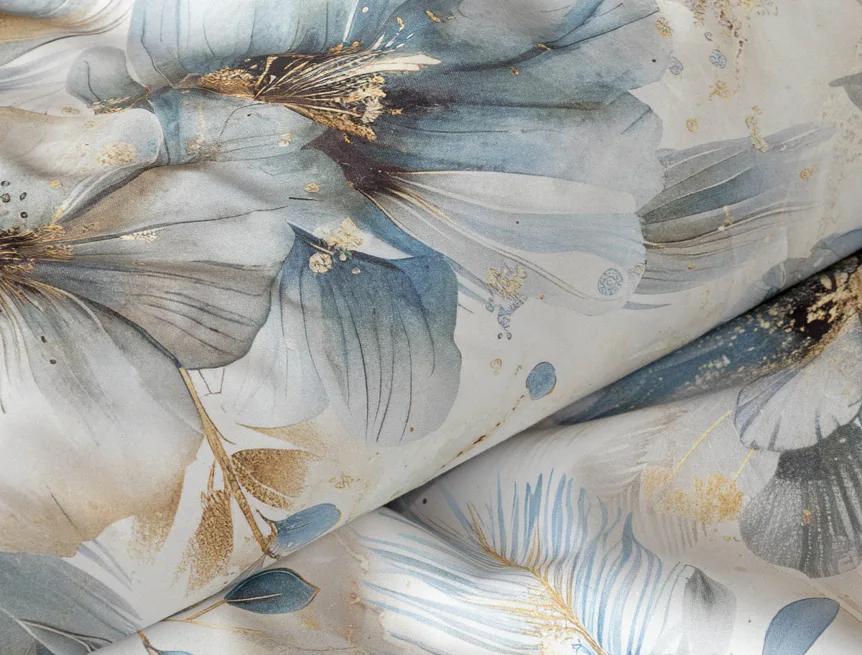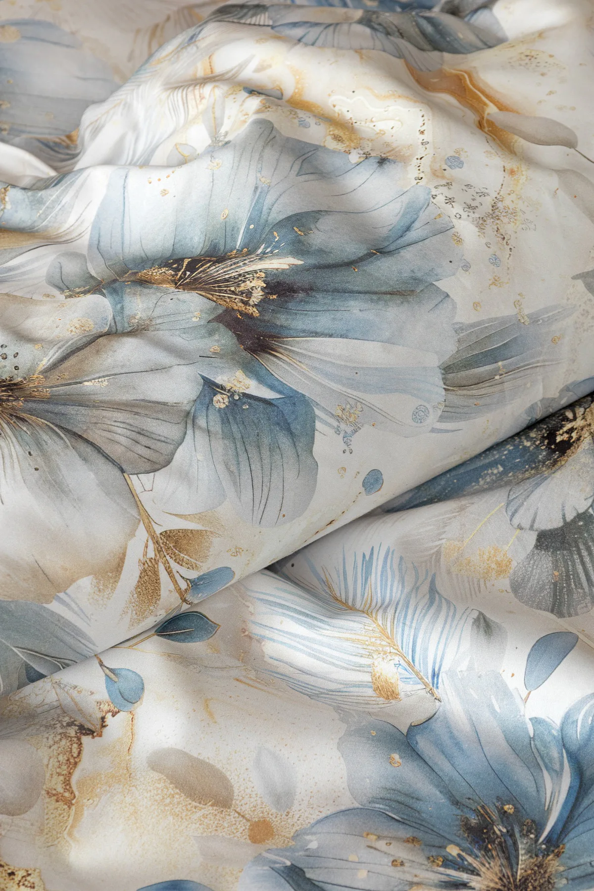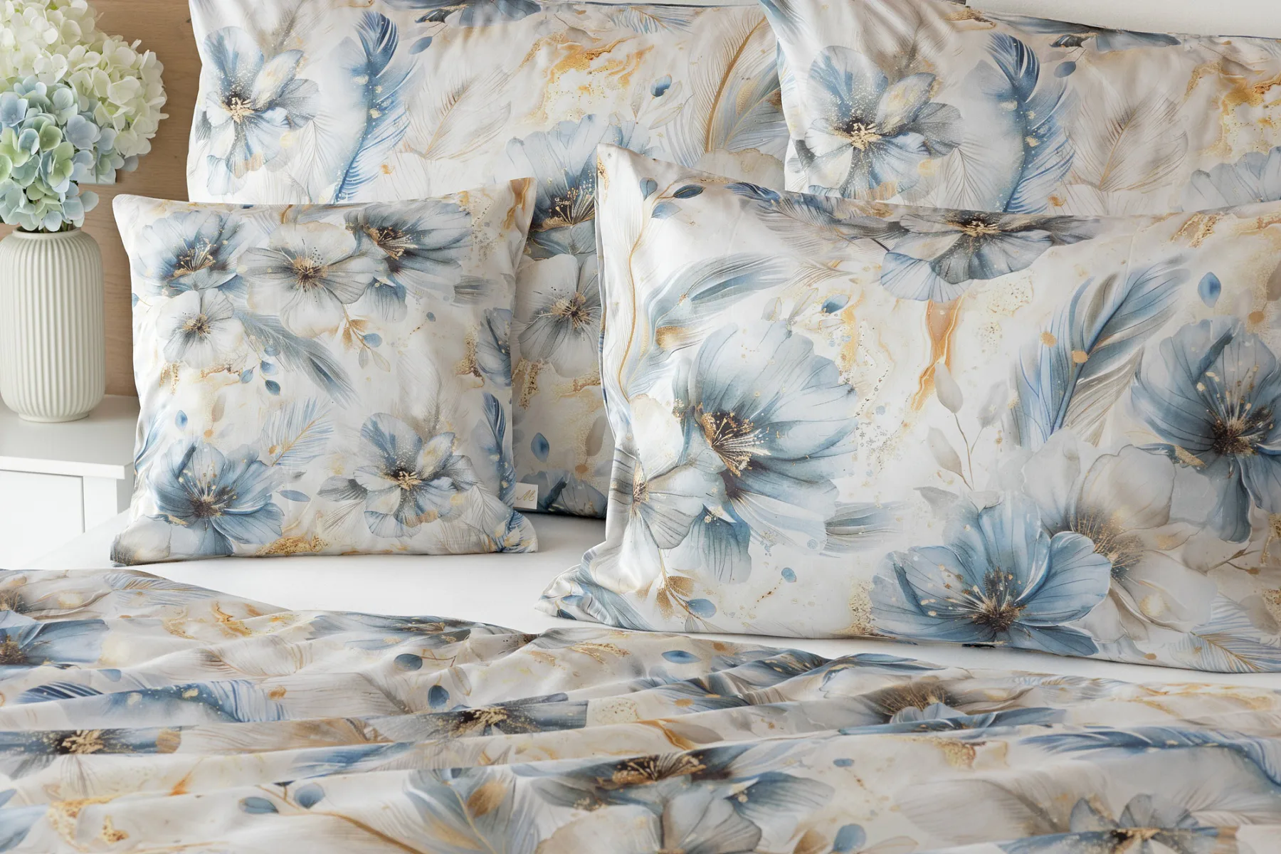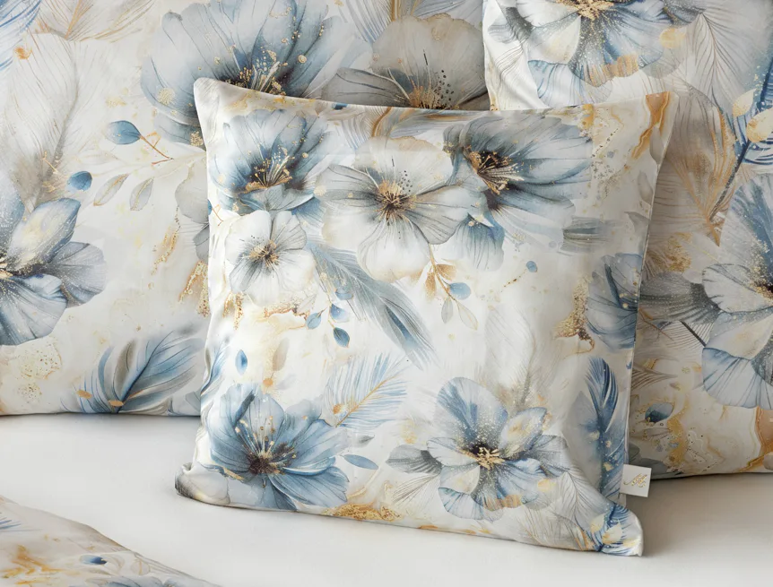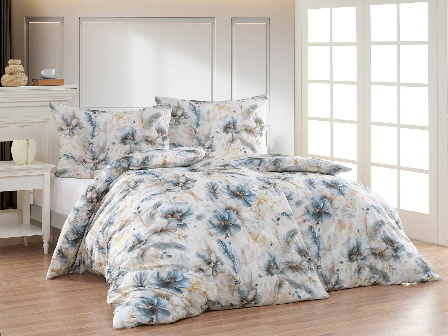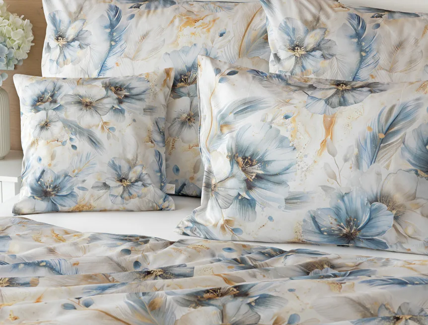 Vzor Lowell zdobí atraktivní květinový motiv v paletě modrých, šedých a zlatavých tónů na krémově bílém podkladu. Povlak na polštář i na přikrývku je z obou stran stejný, povlečení je opatřeno komfortním zipovým uzávěrem.