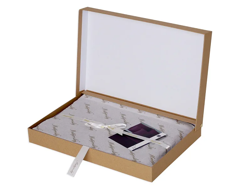 Povlečení je dodáváno v luxusní dárkové krabici (v případě dvou stejných setů baleno v jedné krabici jako sada povlečení na manželské lůžko). Obal z přírodních surovin podtrhuje jedinečnost tohoto 100% přírodního produktu.