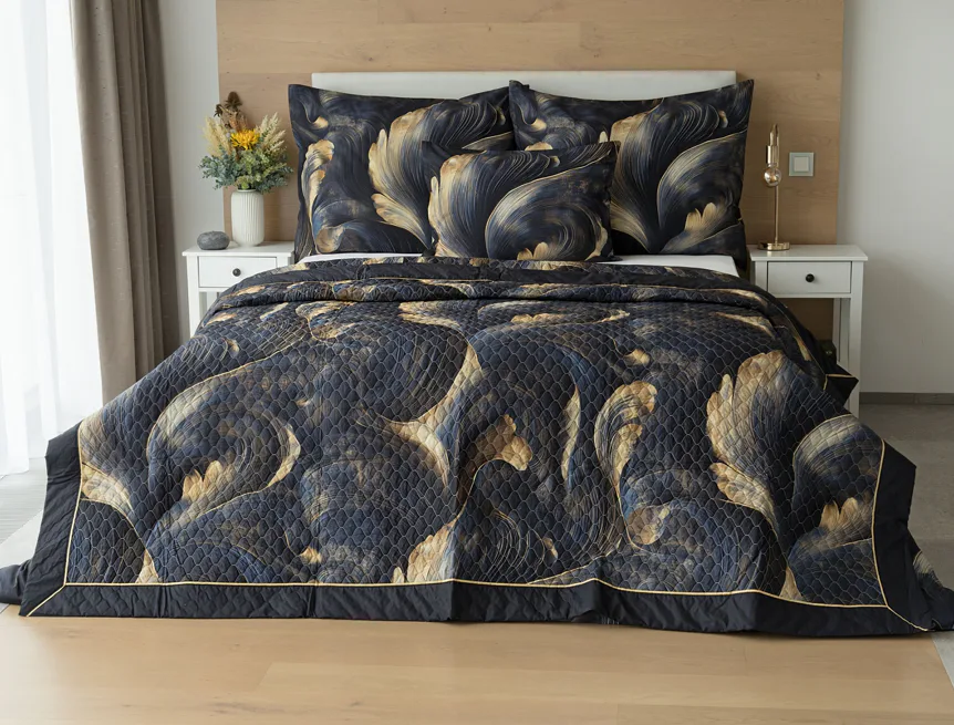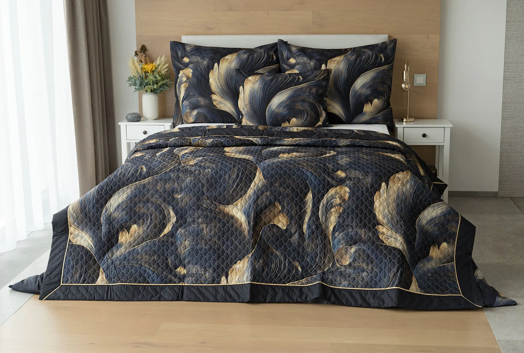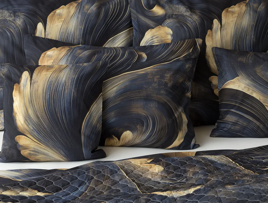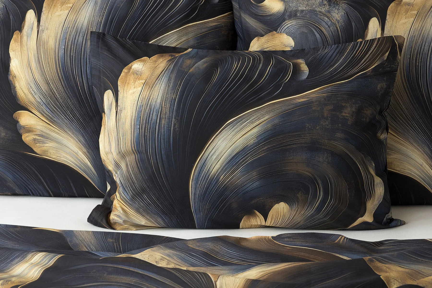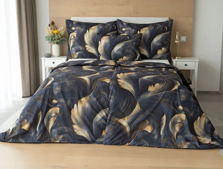 Elegantní bavlněné povlečení Lyra povznese každodenní stlaní na radost a potěšení z krásného bydlení. Abstraktní vzor vyniká v jedinečném spojení temně modrých tónů s pískově zlatými konturami, které připomínají tvar lyry. Díky nejmodernějšímu digitálnímu tisku vyniká vzor v precizním detailu.