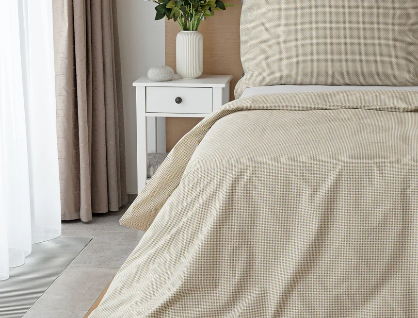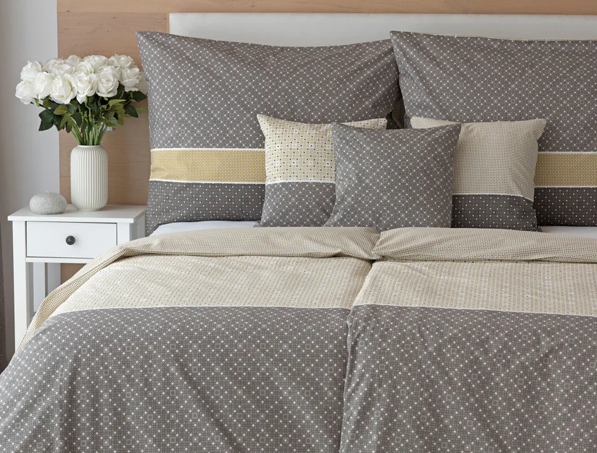 Rozmanitý geometrický vzor na bavlněném povlečení Maddox kombinuje oblíbené hřejivé tóny, od přírodní béžové až po antracitově šedou. Ve vzoru se snoubí decentní prvky nápaditě propojené v elegantní celek, který vám umožní při stlaní hravě experimentovat. Vrchní strana povlečení odpovídá vyobrazení na fotografii, spodní stranu povlečení zdobí zjednodušený motiv tvořený drobnými puntíky v šedé a okrové barvě na přírodním béžovém podkladu.