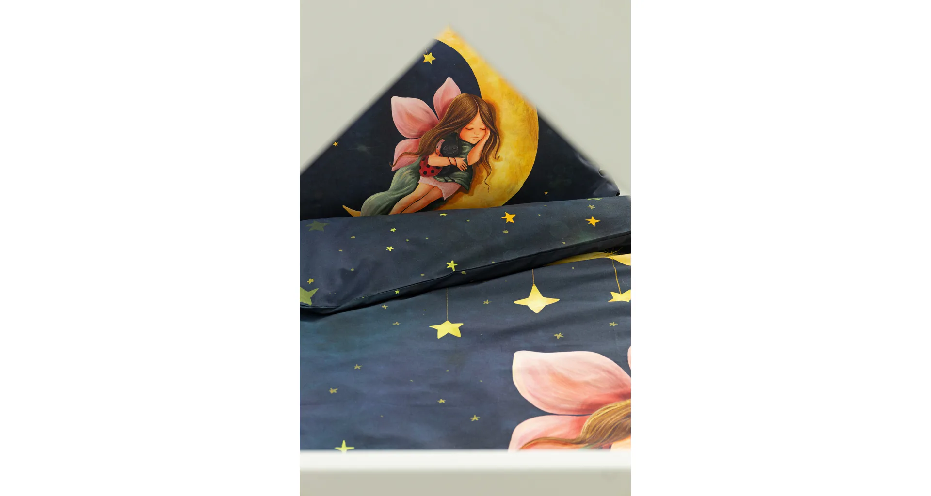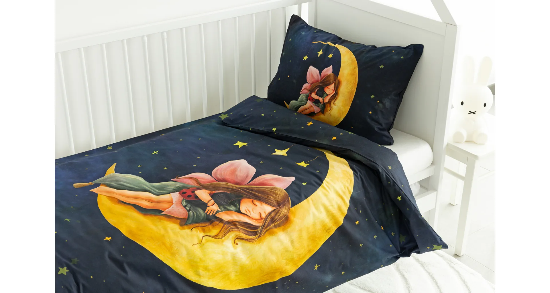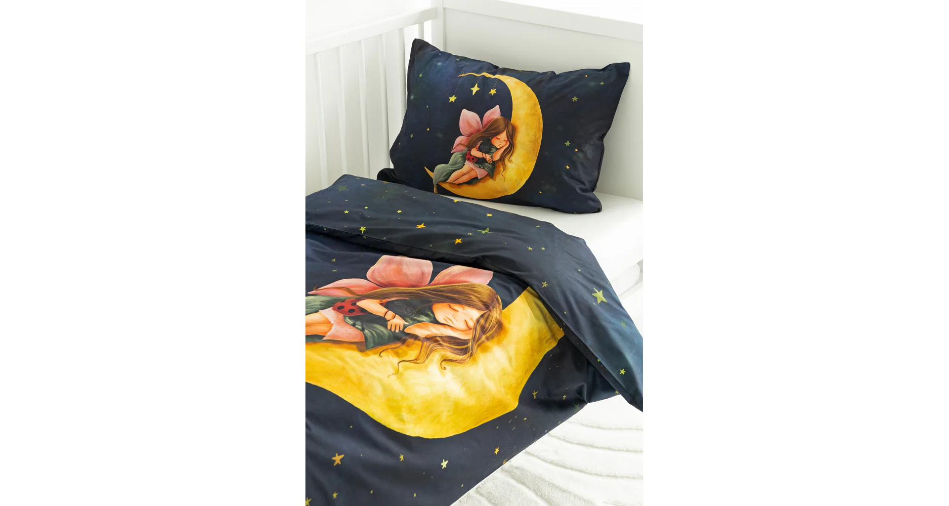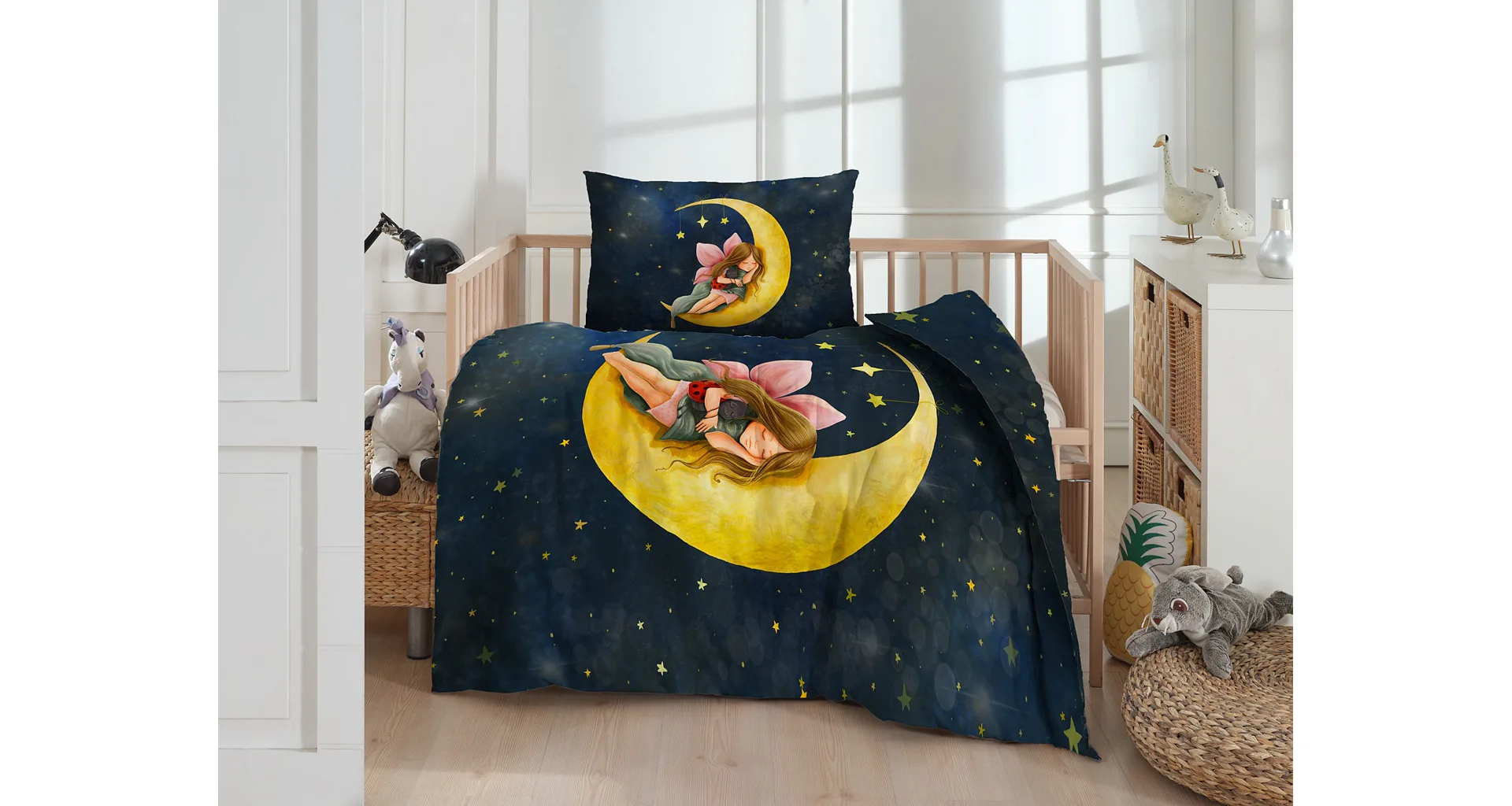 Proměňte dětský pokojíček v kouzelnou říši s bavlněným povlečením Malá víla. Motiv víly spící na měsíci, obklopené hvězdnou oblohou, vnese do dětského pokoje magickou atmosféru. Povlečení je vyrobeno ze 100% prémiové bavlny v úpravě DELUXE, která je jemná na dotek a prodyšná.