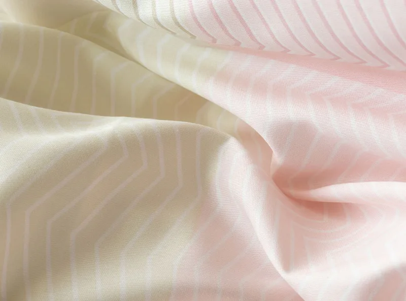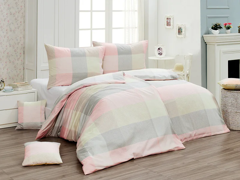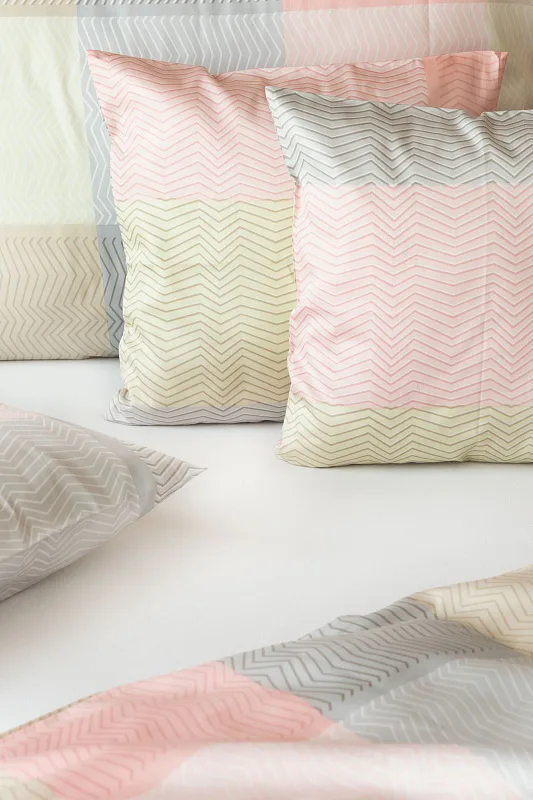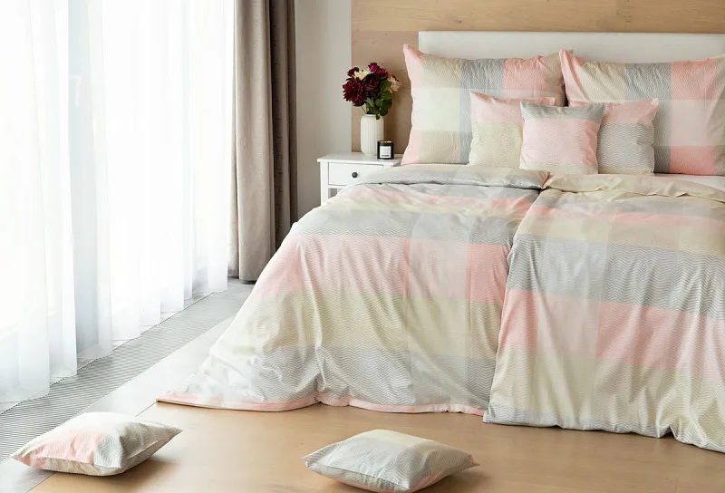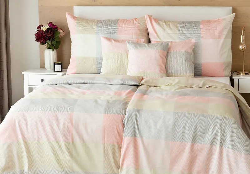 Svěží károvaný motiv s cik-cak vzorem v odstínech pastelové lososové, krémové a šedé na povlečení Mango bude ozdobou každé ložnice.