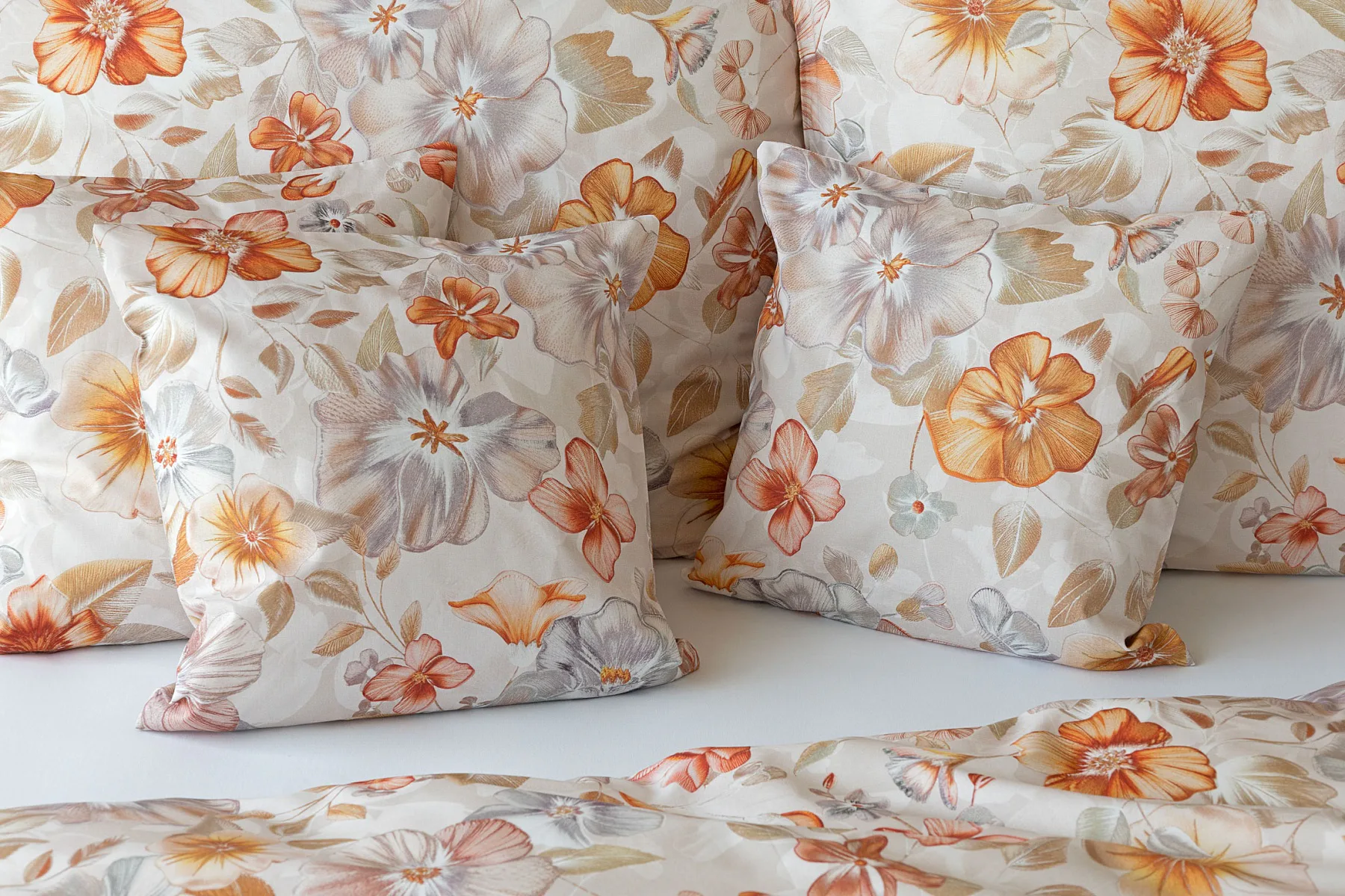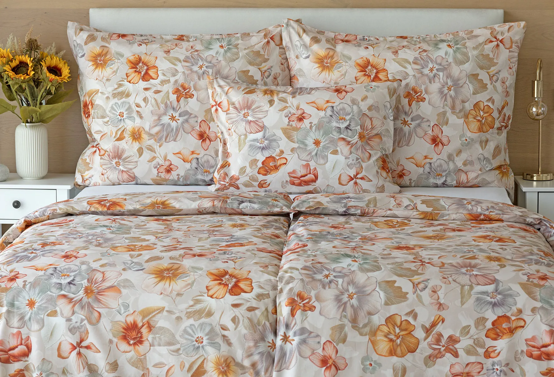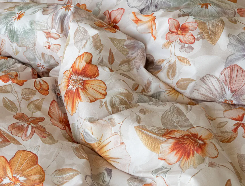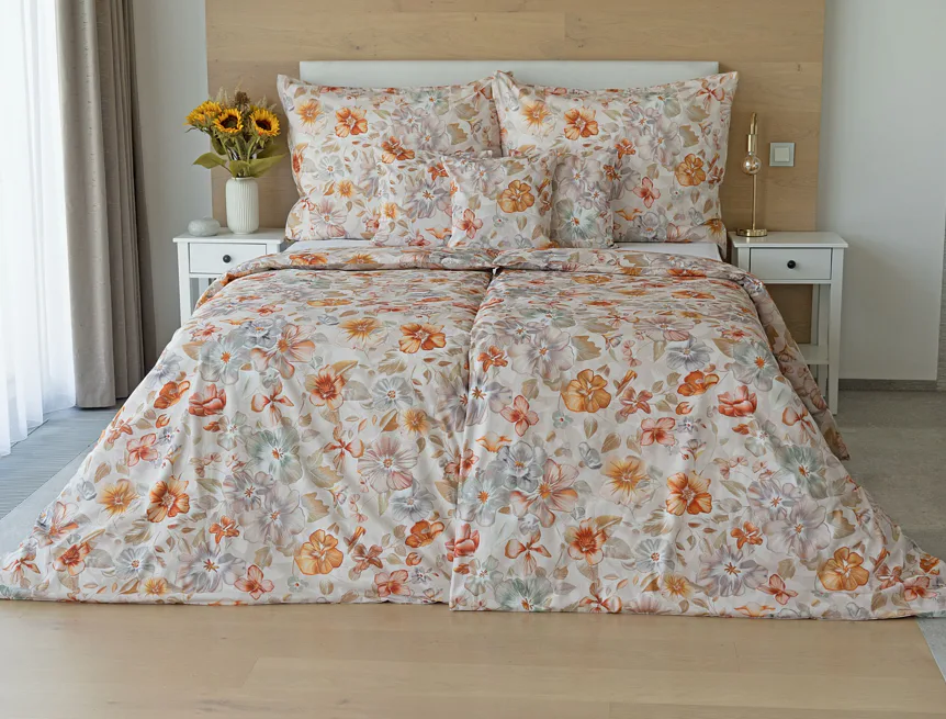 Bavlněné povlečení Manon v podzimních tónech vnese do vaší ložnice hřejivou atmosféru klidu a pohody. Jemný květinový vzor v paletě měděných a béžových tónů navodí pocit útulného domova. Díky nejmodernějšímu digitálnímu tisku je florální motiv zachycen v precizním detailu.