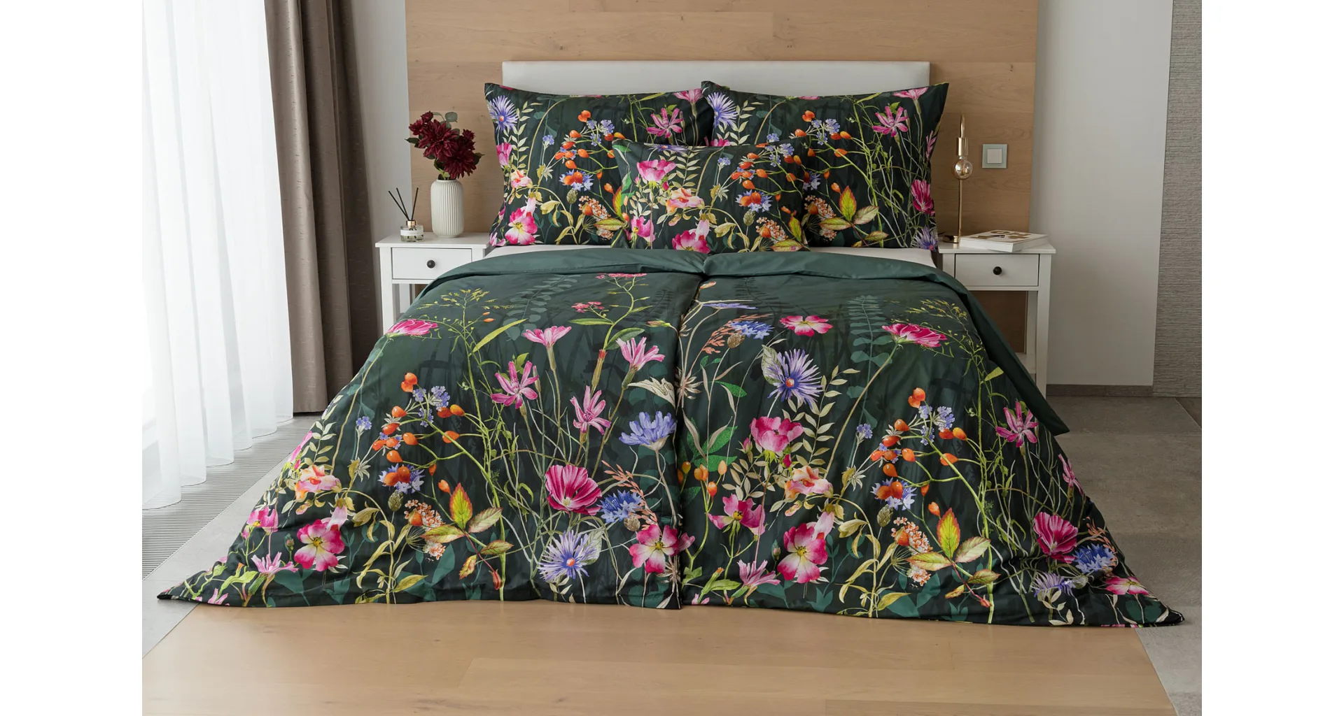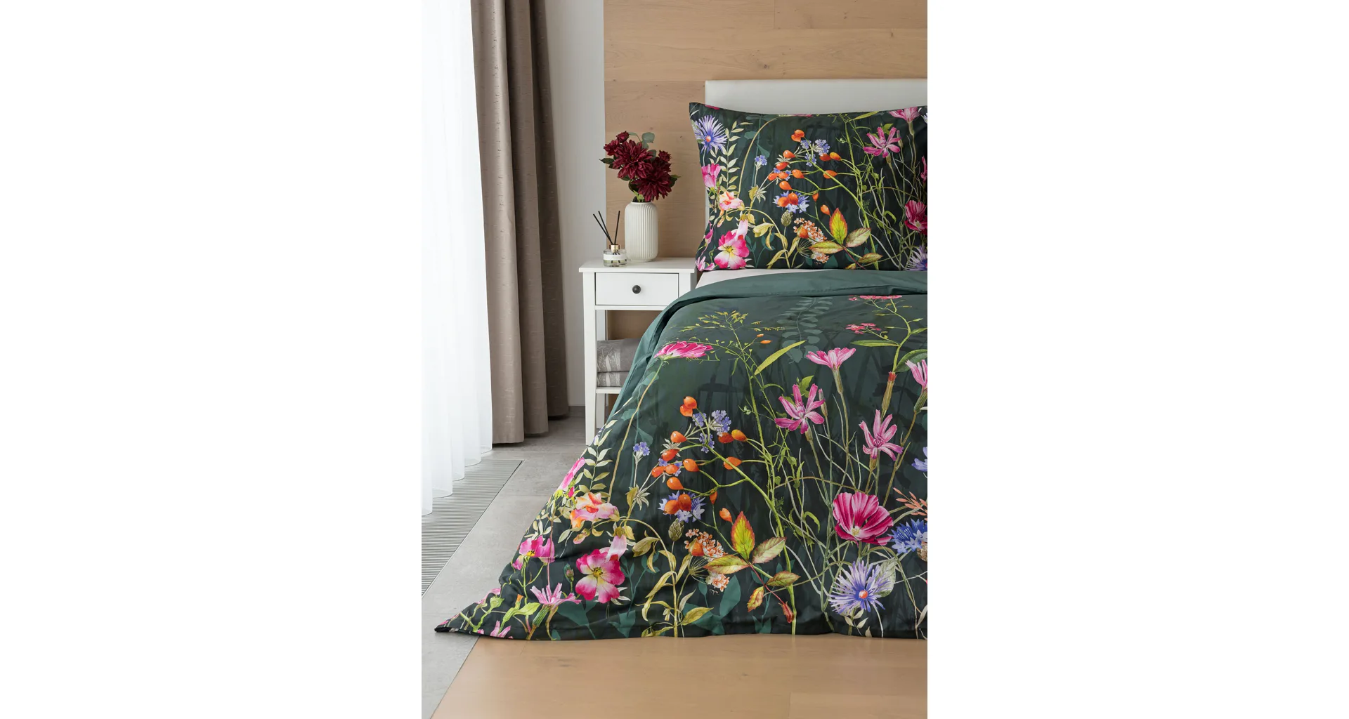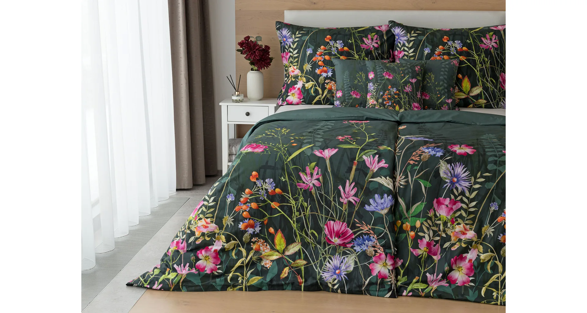 Povlak na přikrývku je z obou stran stejný, povlak na polštář zachycuje z každé strany jinou část květinového vzoru. Povlečení je opatřeno komfortním zipovým uzávěrem.