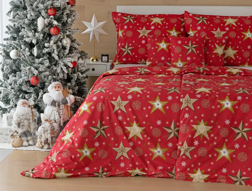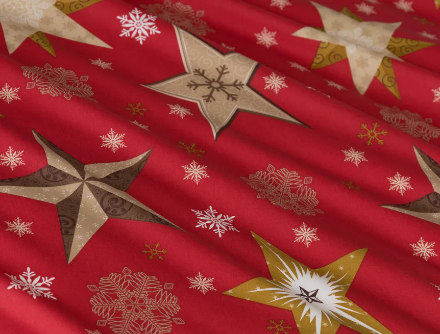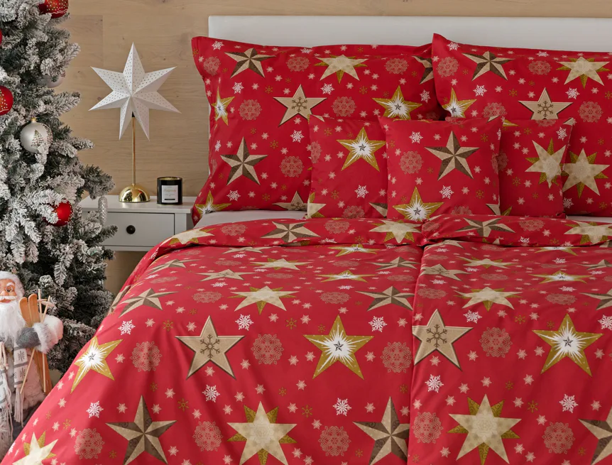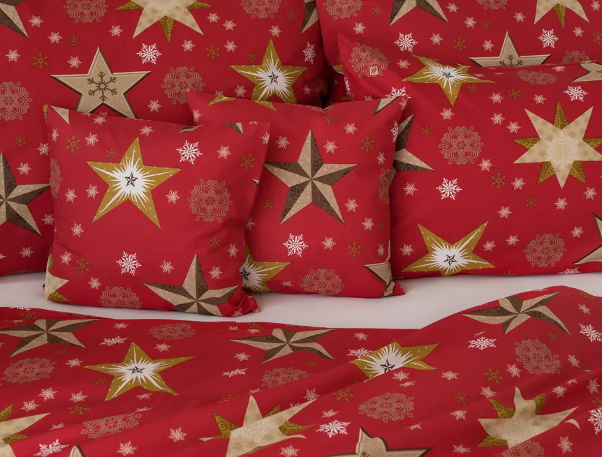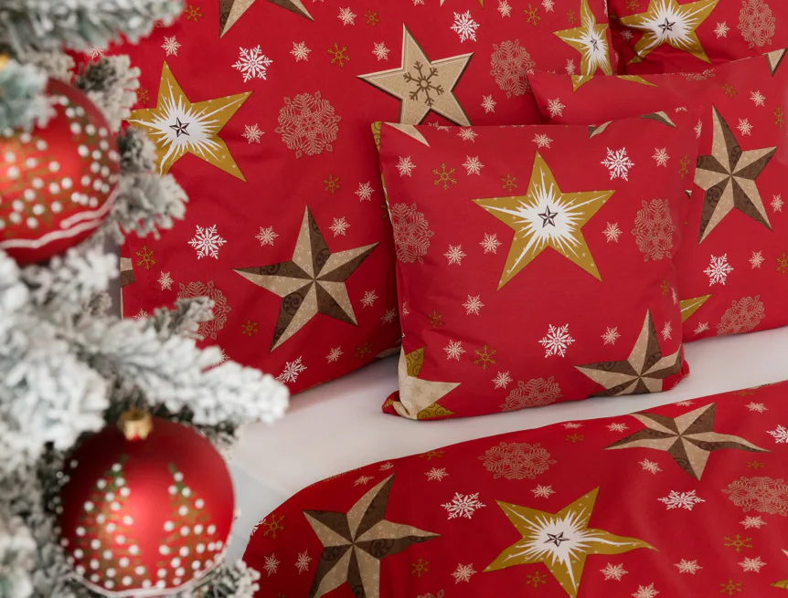 Nalaďte se na hřejivou vánoční atmosféru s bavlněným povlečením Merci. Sváteční motiv zlatých hvězd a sněhových vloček vyniká na podkladu v tradiční červené barvě.