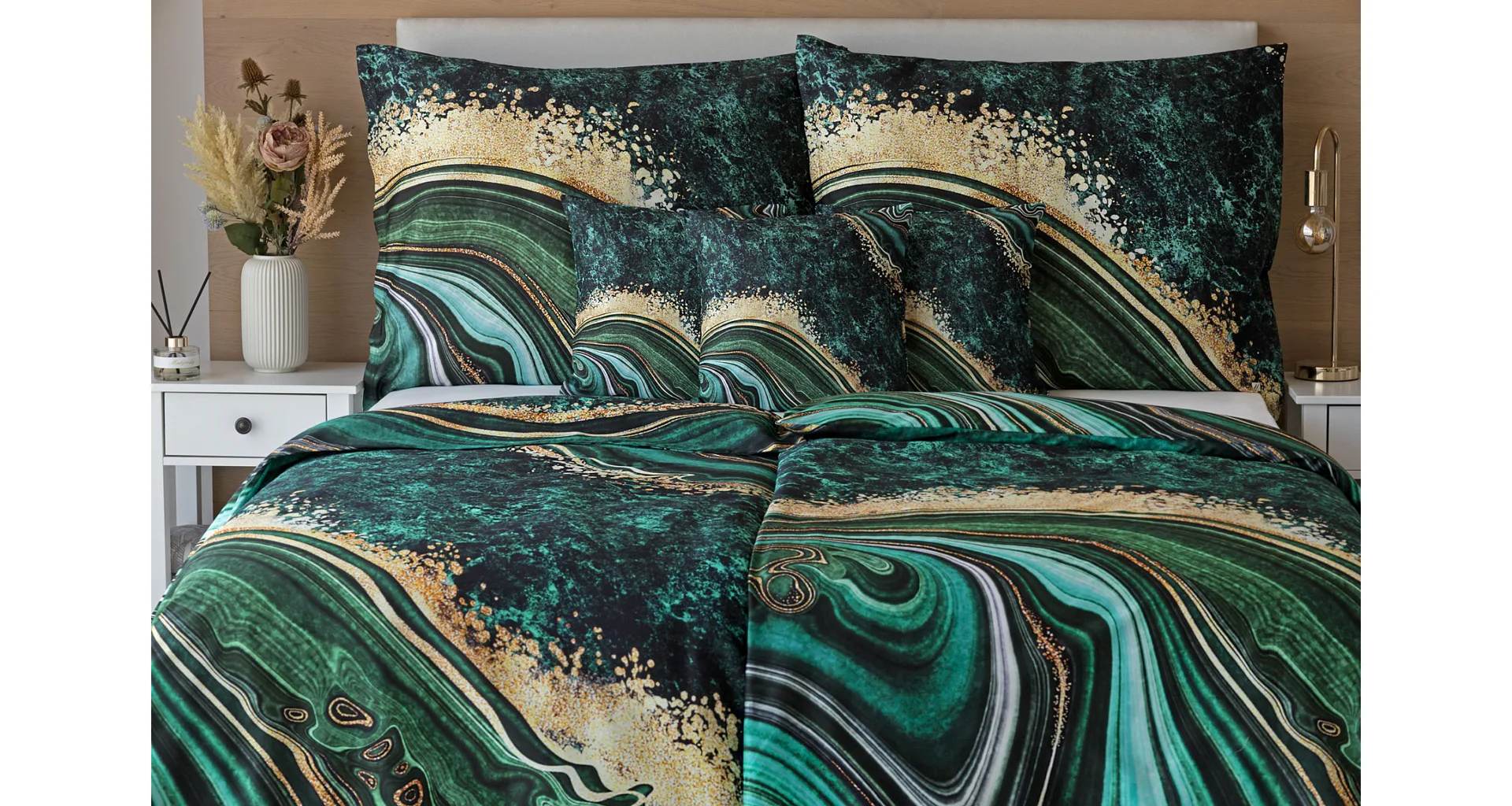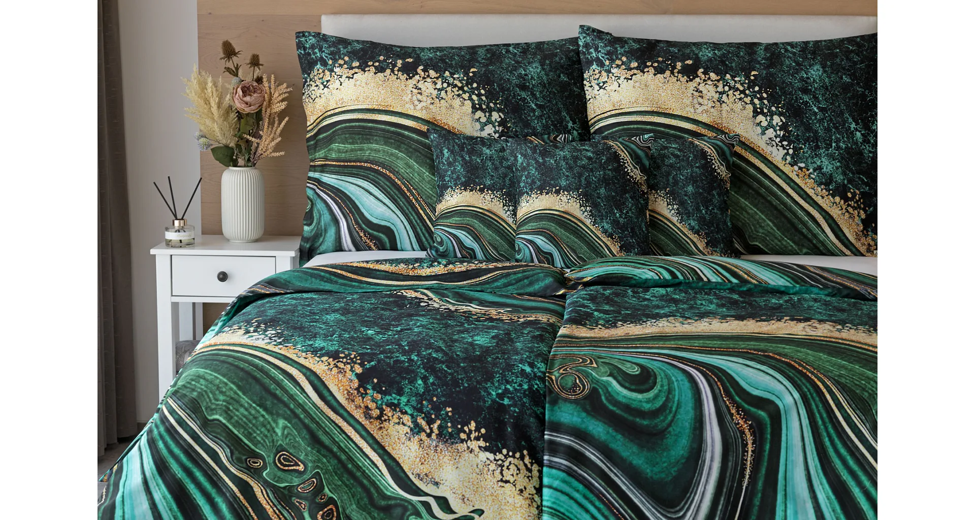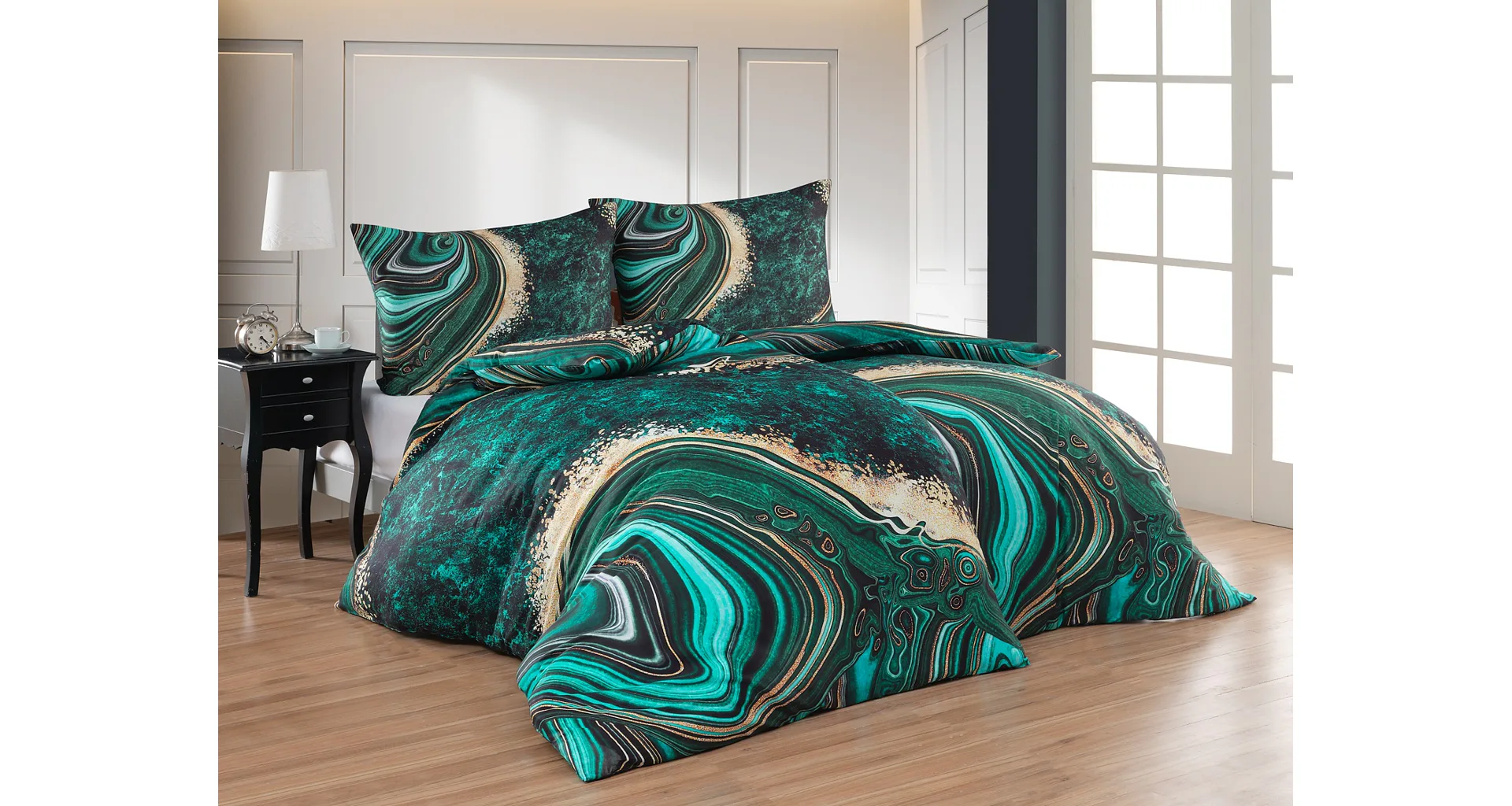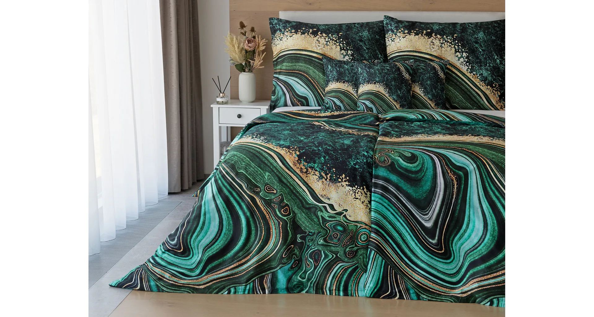 Nalaďte se na pozitivní vlnu s energickým vzorem ložního povlečení Metheora. Abstraktnímu motivu dominují odstíny smaragdově zelené barvy, která působí na lidskou mysl klidně, napomáhá regeneraci a načerpání nové síly. Zelené barvě sluší kombinace se zlatou, díky které získává noblesní nádech. A přesně tyto odstíny barev se snoubí ve vzoru Metheora, jehož eleganci navíc podtrhuje hebký bavlněný satén vyrobený ze 100% bavlny.