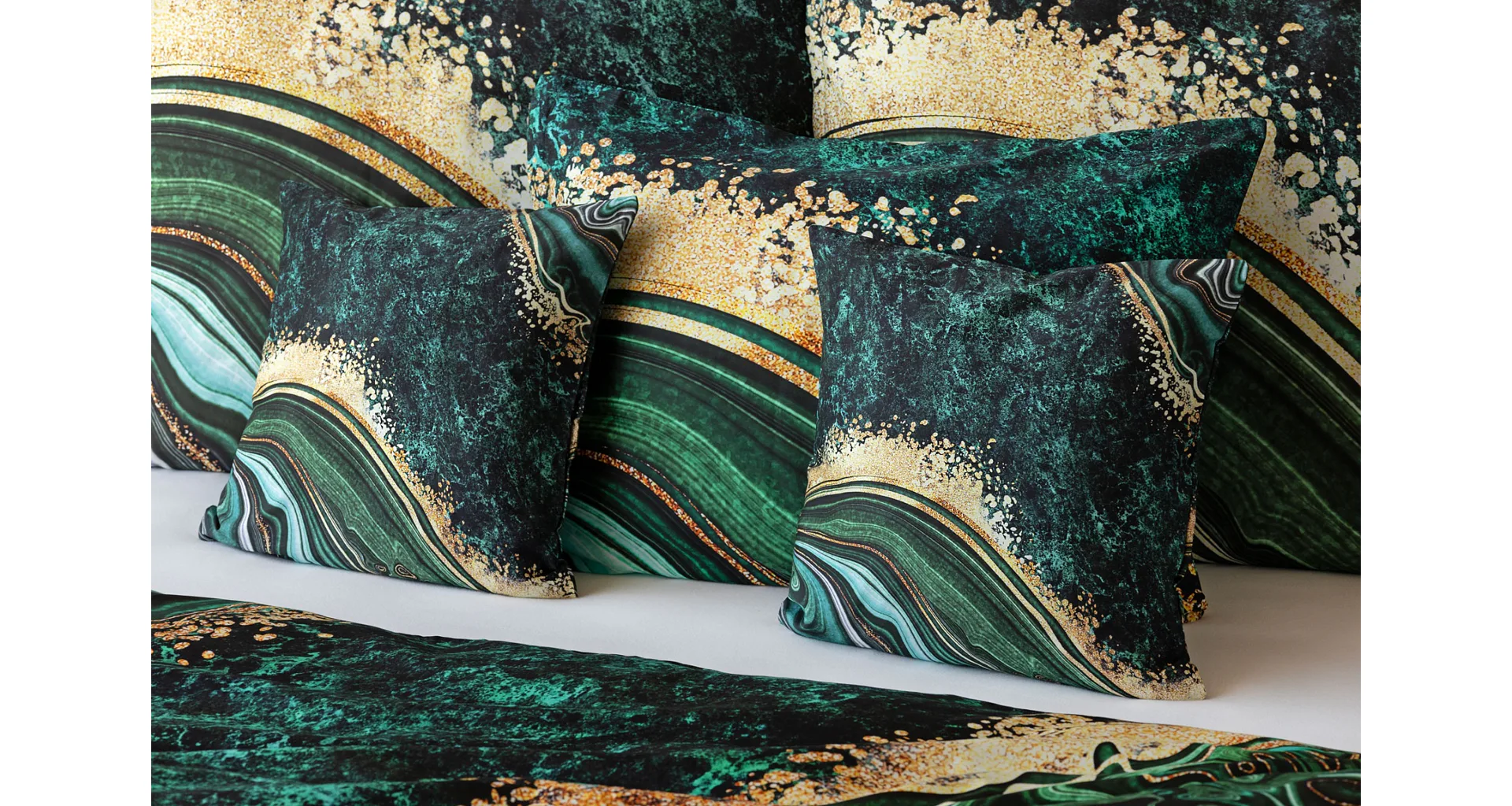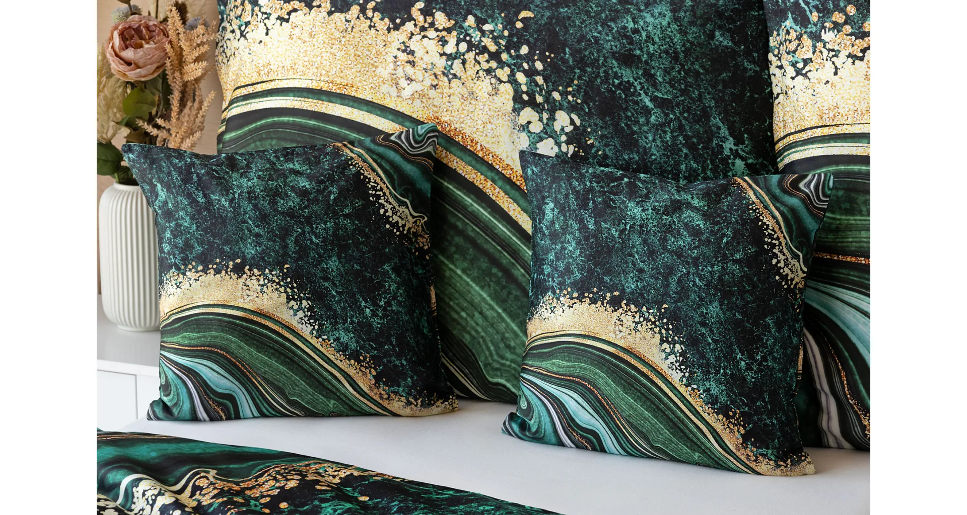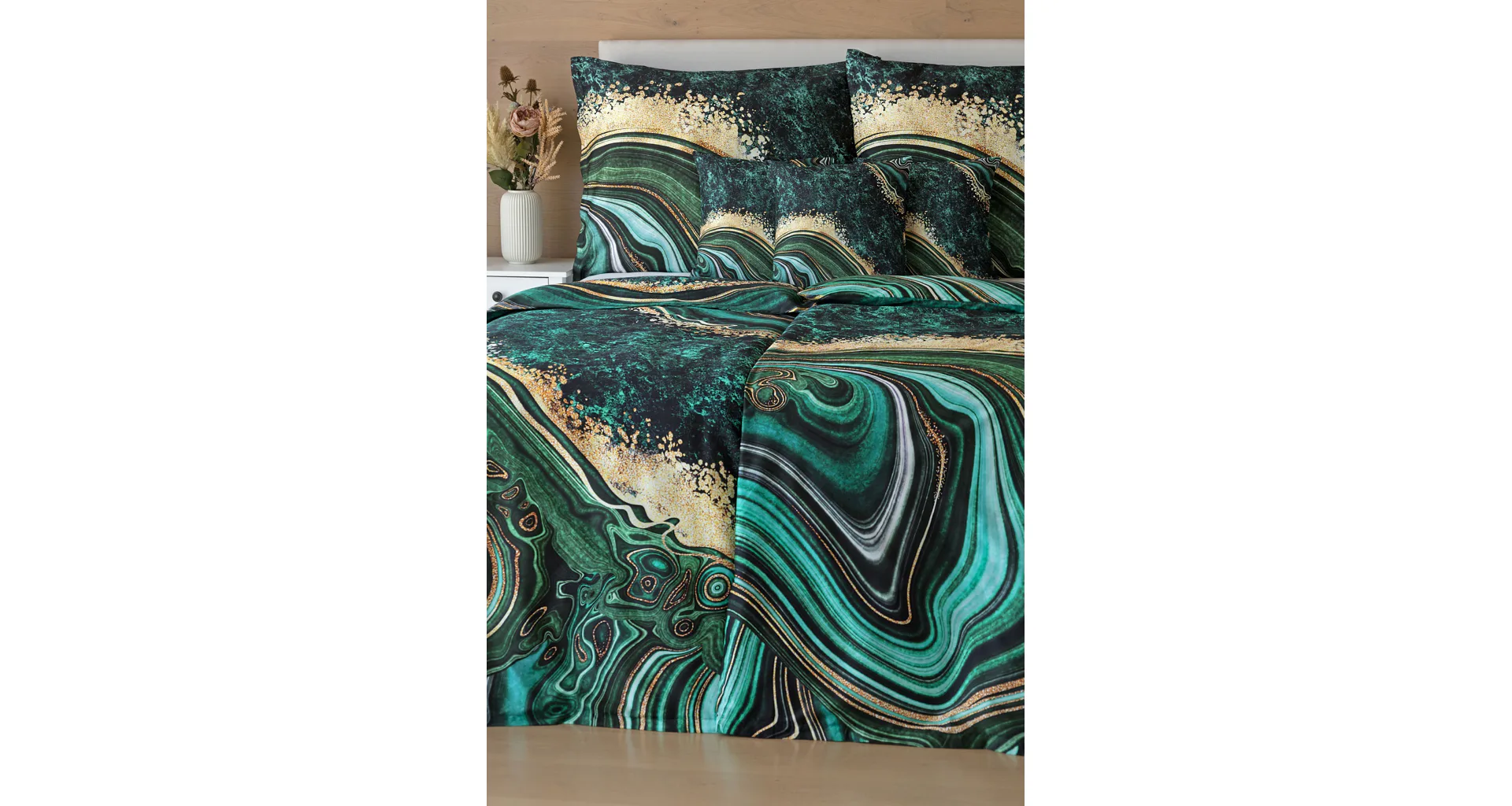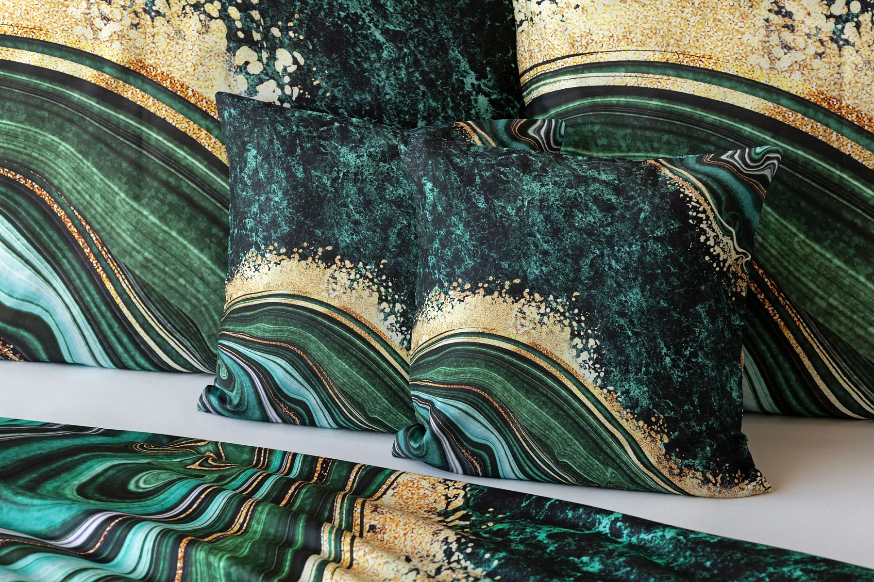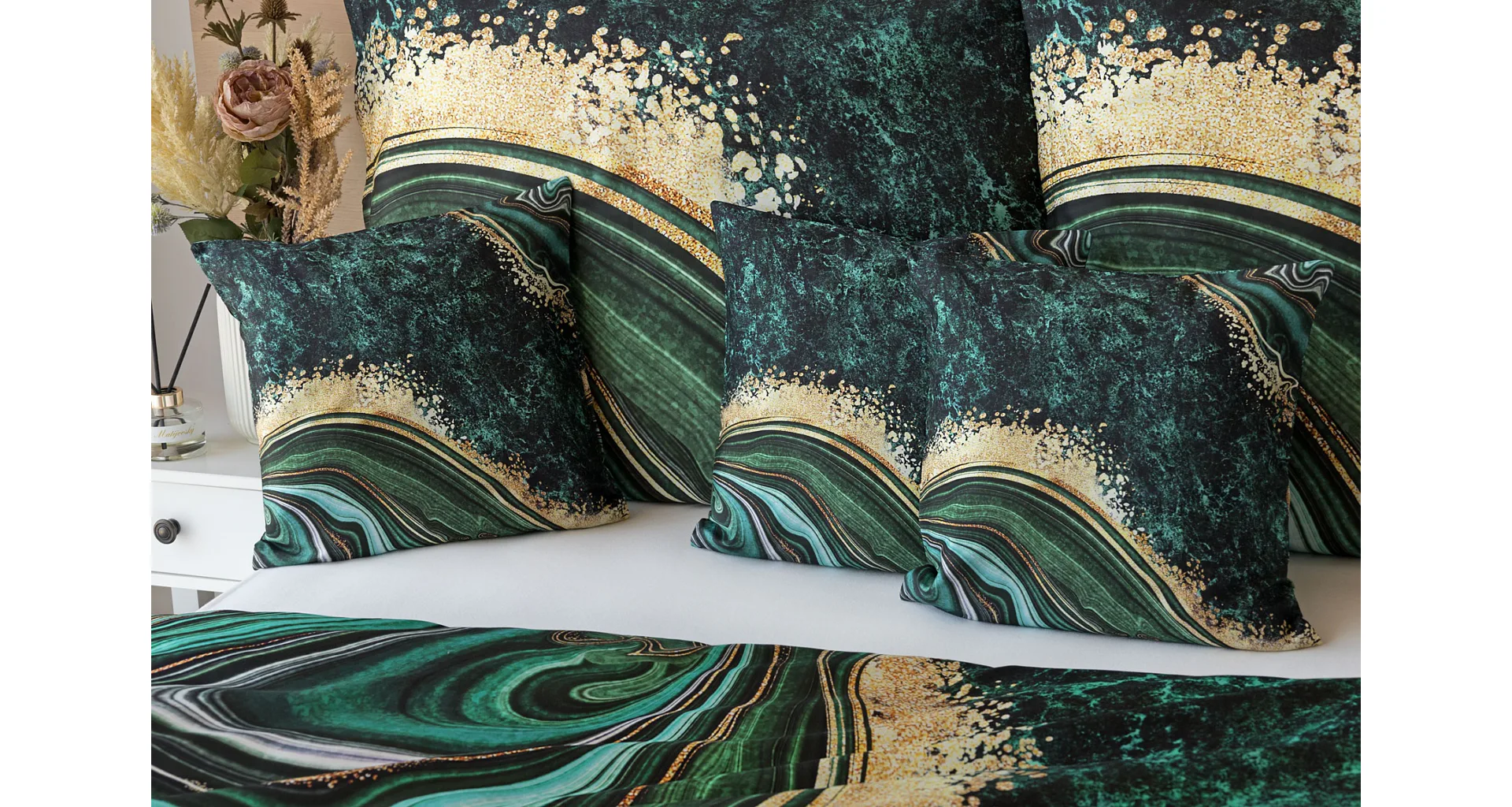 Nalaďte se na pozitivní vlnu s energickým vzorem ložního povlečení Metheora. Abstraktnímu motivu dominují odstíny smaragdově zelené barvy, která působí na lidskou mysl klidně, napomáhá regeneraci a načerpání nové síly. Zelené barvě sluší kombinace se zlatou, díky které získává noblesní nádech. A přesně tyto odstíny barev se snoubí ve vzoru Metheora, jehož eleganci navíc podtrhuje hebký bavlněný satén vyrobený ze 100% bavlny.