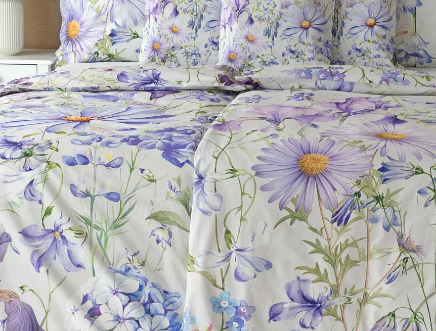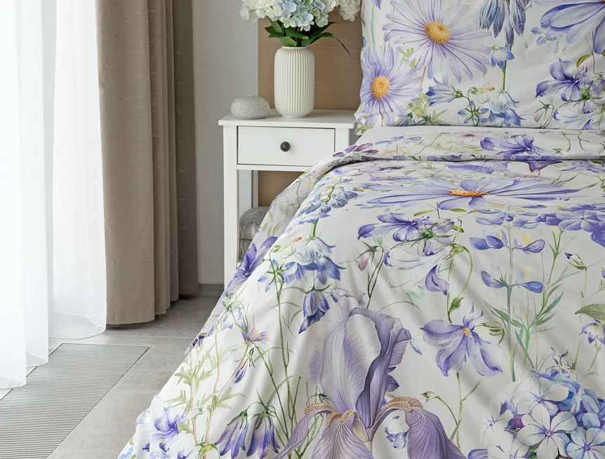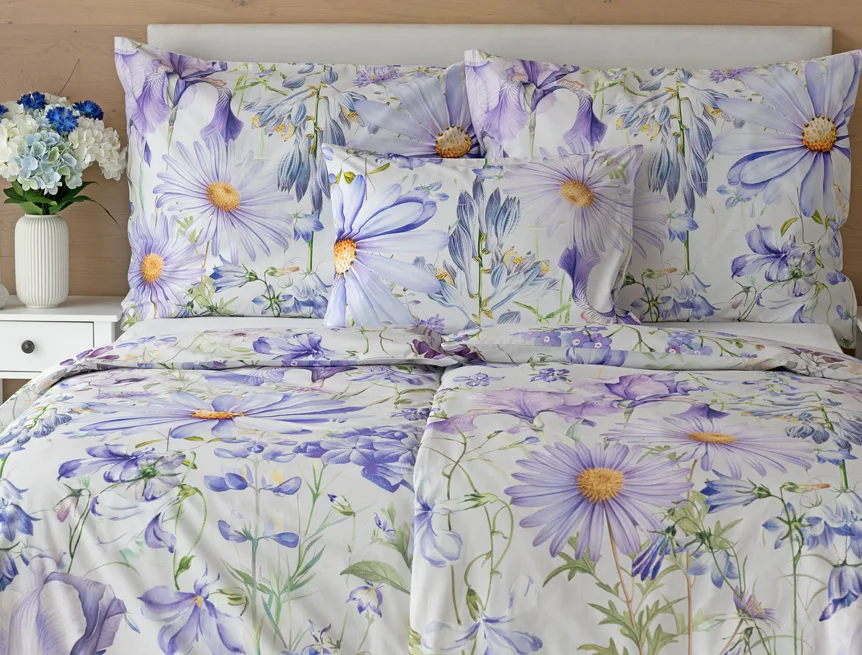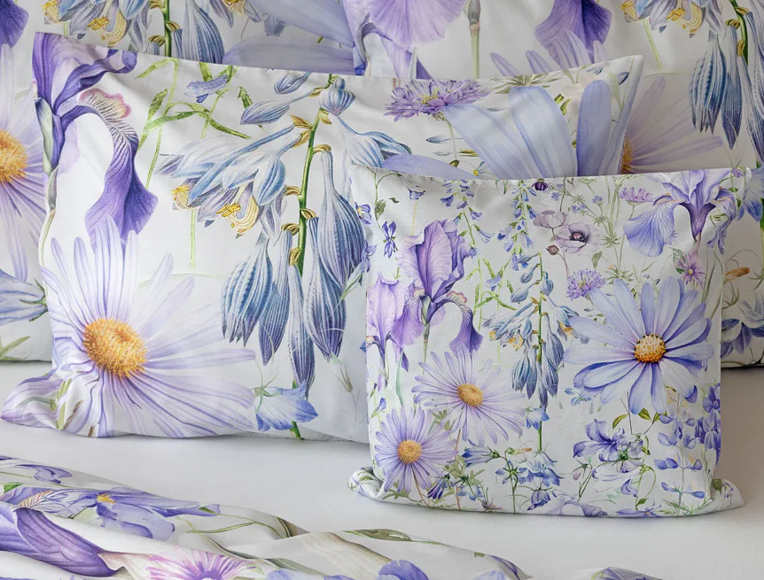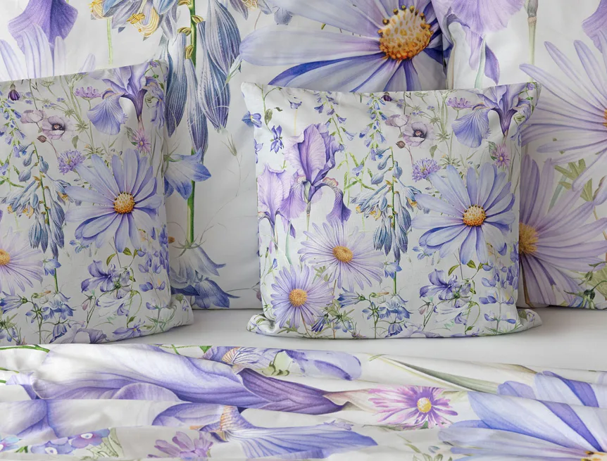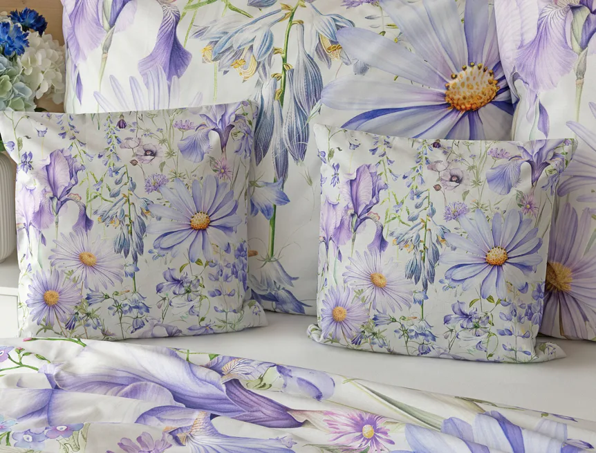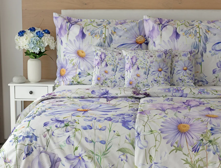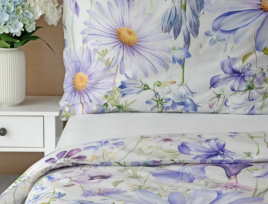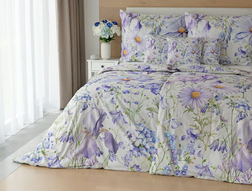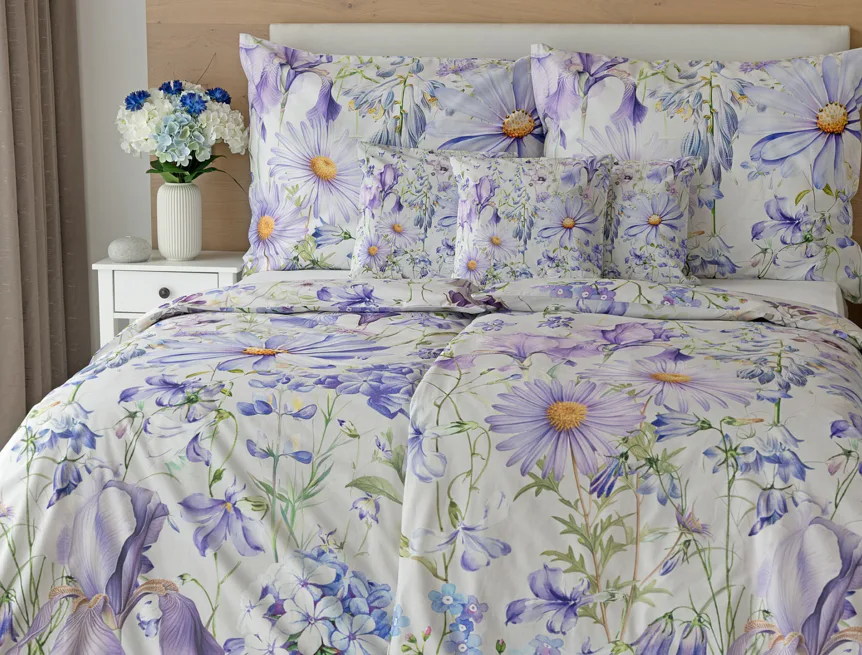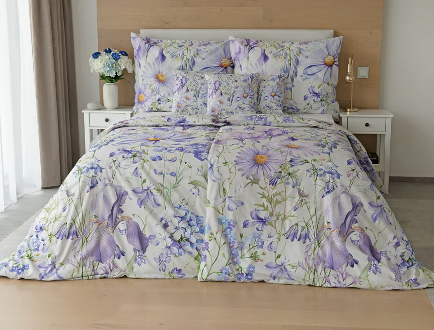 Okouzlující květinové povlečení Mirabel vnese do vaší ložnice nádech svěžesti. Květy kosatců, lučních zvonků, pomněnek i kopretin jsou v návrhu sladěny do atraktivní palety fialových a světle modrých tónů, které působí uklidňujícím a hřejivým dojmem. Díky nejmodernějšímu digitálnímu tisku vyniká florální motiv v precizním detailu.