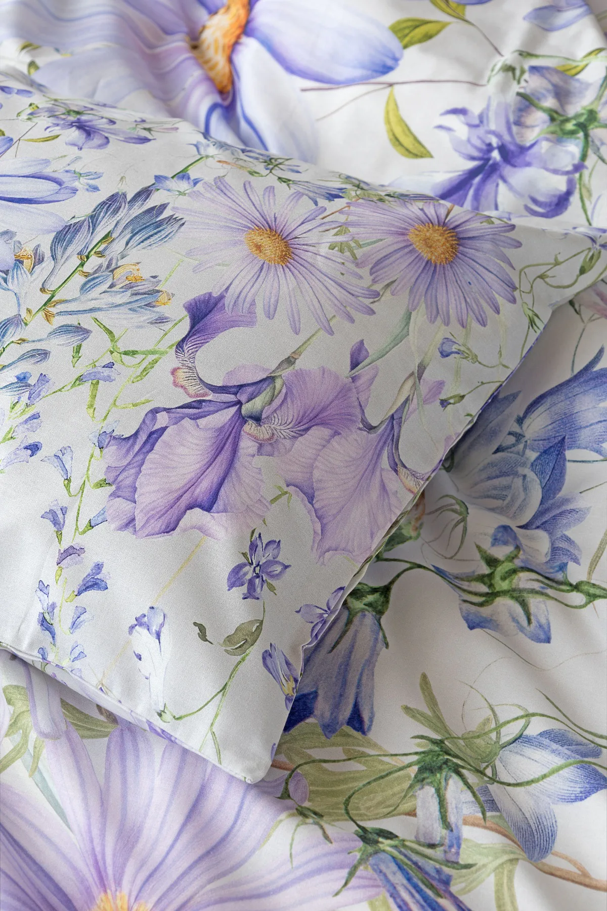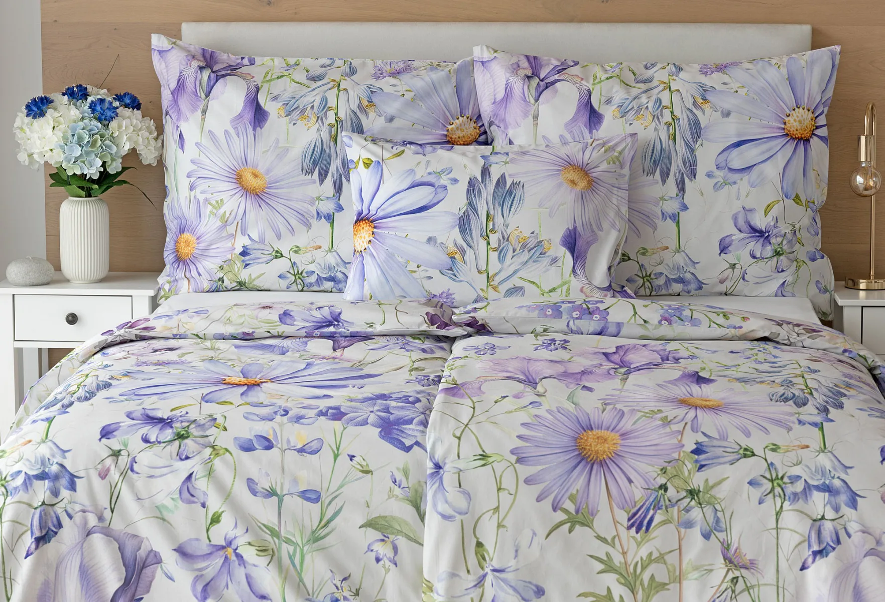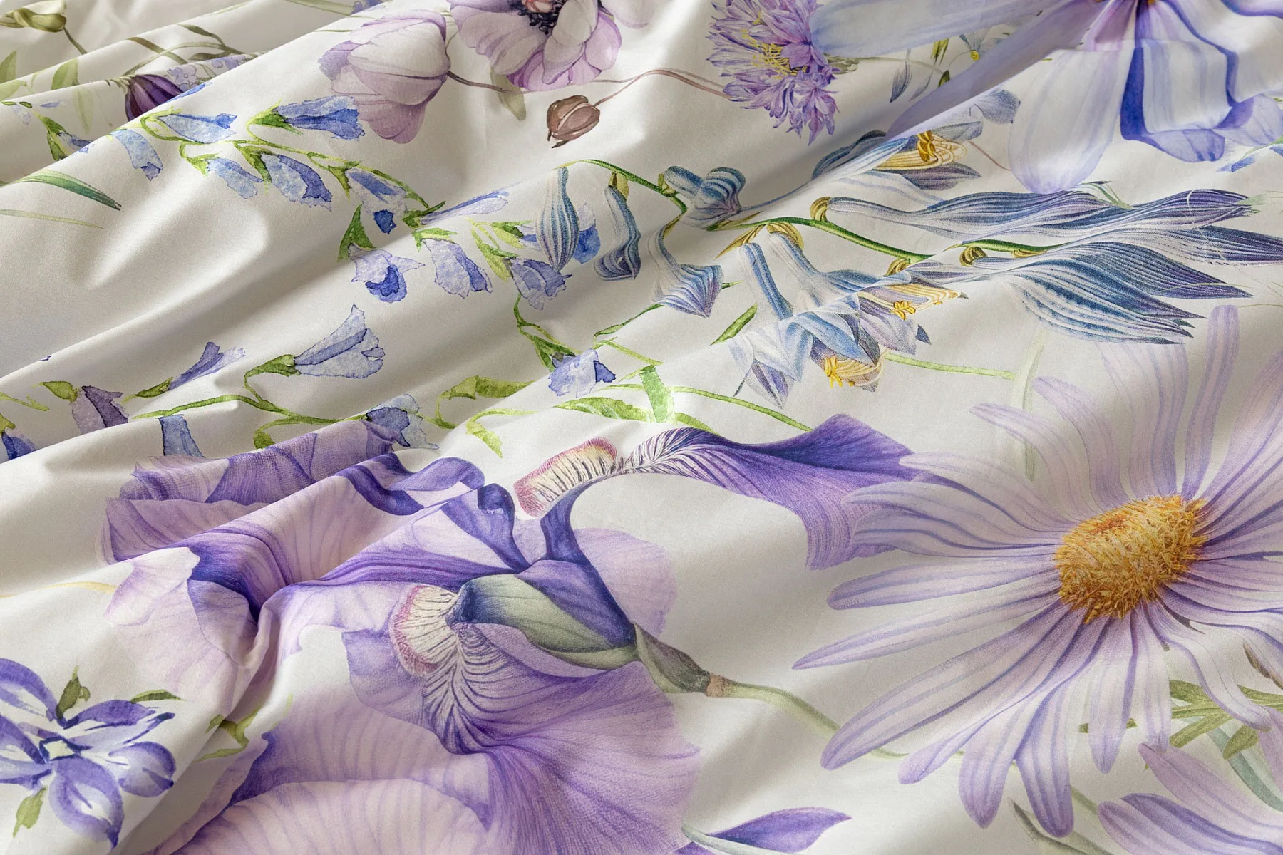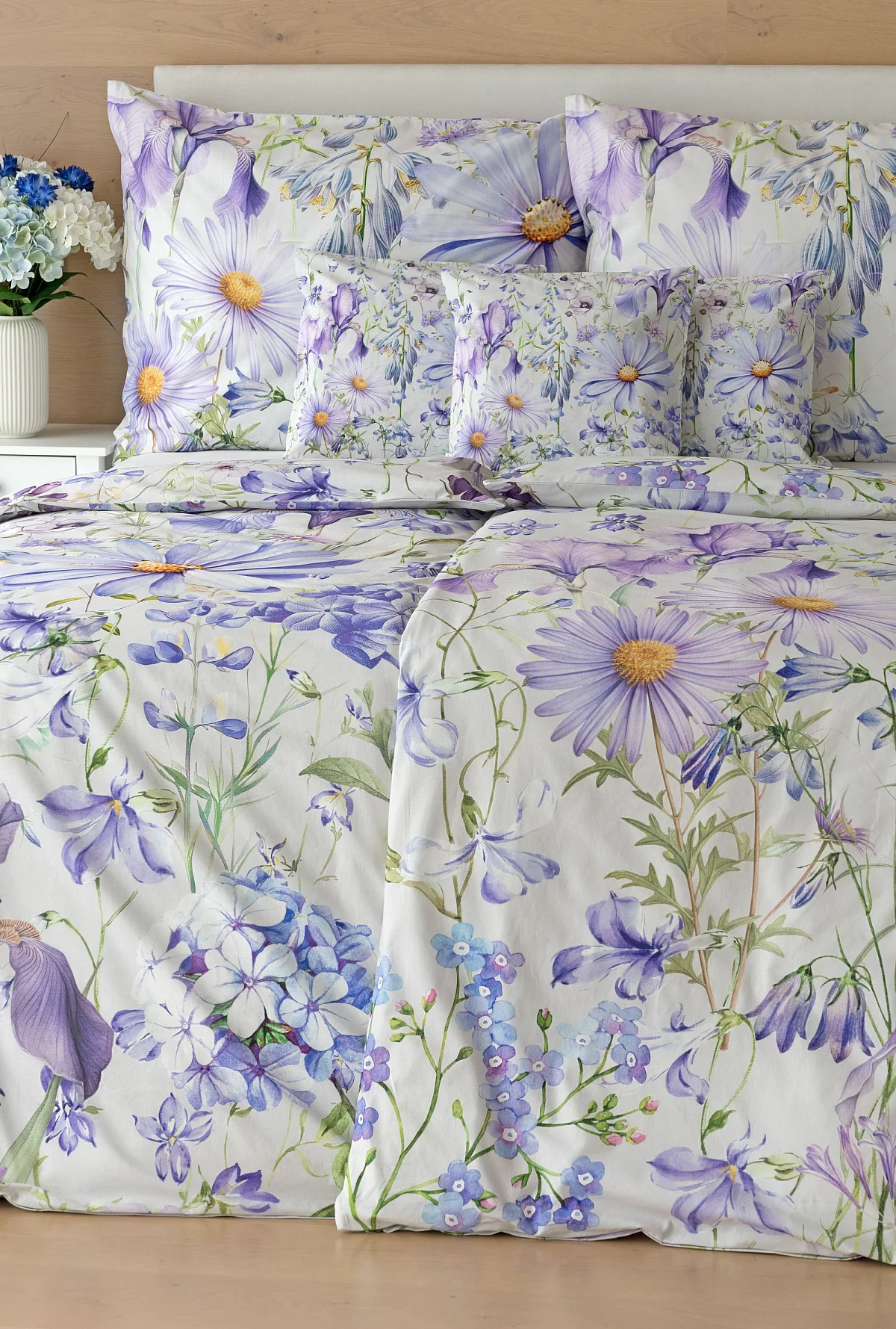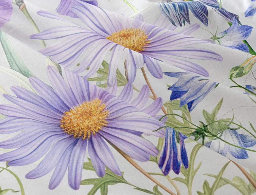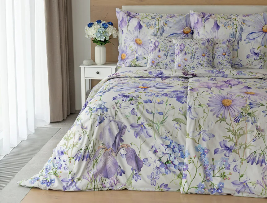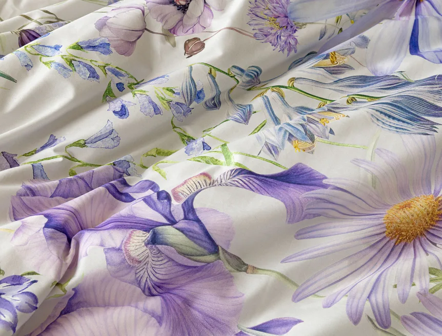 Okouzlující květinové povlečení Mirabel vnese do vaší ložnice nádech svěžesti. Květy kosatců, lučních zvonků, pomněnek i kopretin jsou v návrhu sladěny do atraktivní palety fialových a světle modrých tónů, které působí uklidňujícím a hřejivým dojmem. Díky nejmodernějšímu digitálnímu tisku vyniká florální motiv v precizním detailu.