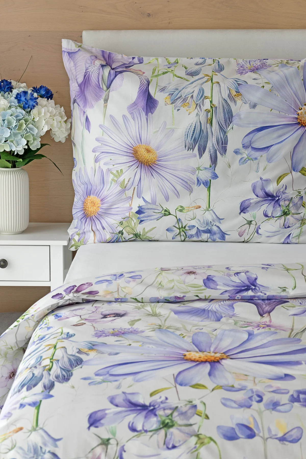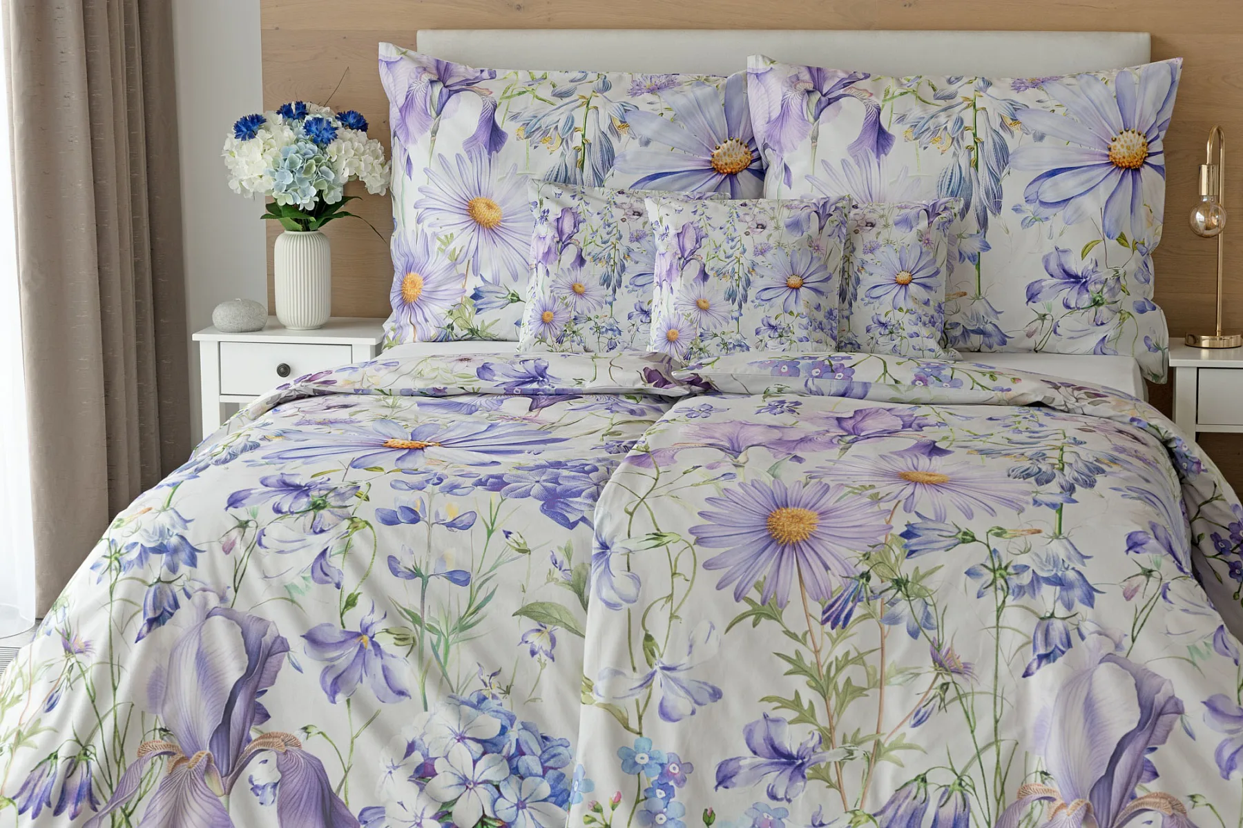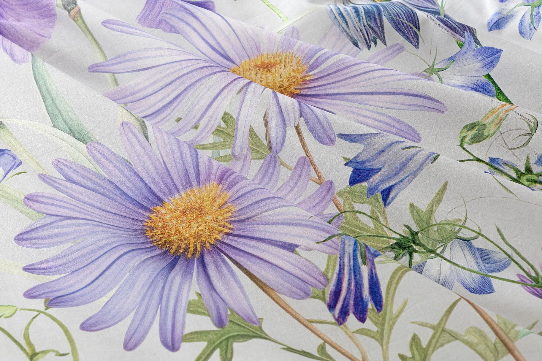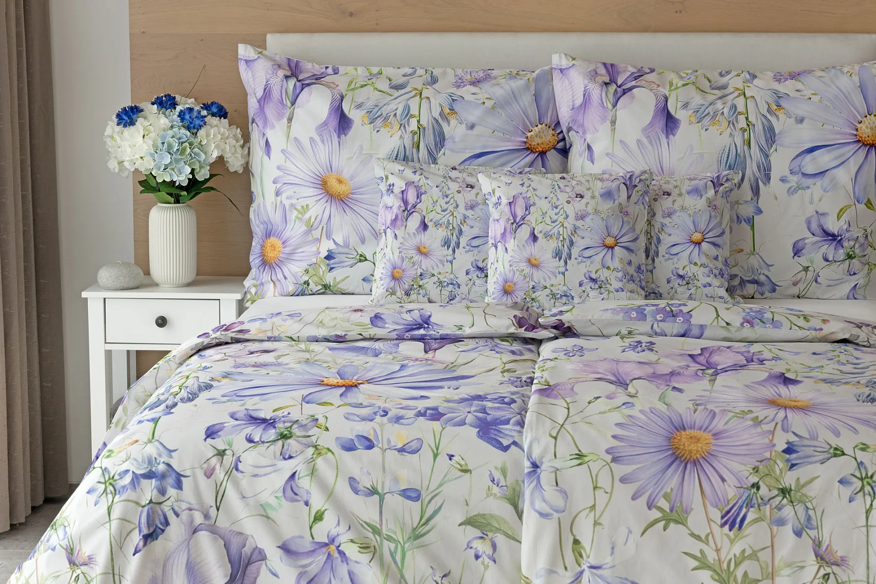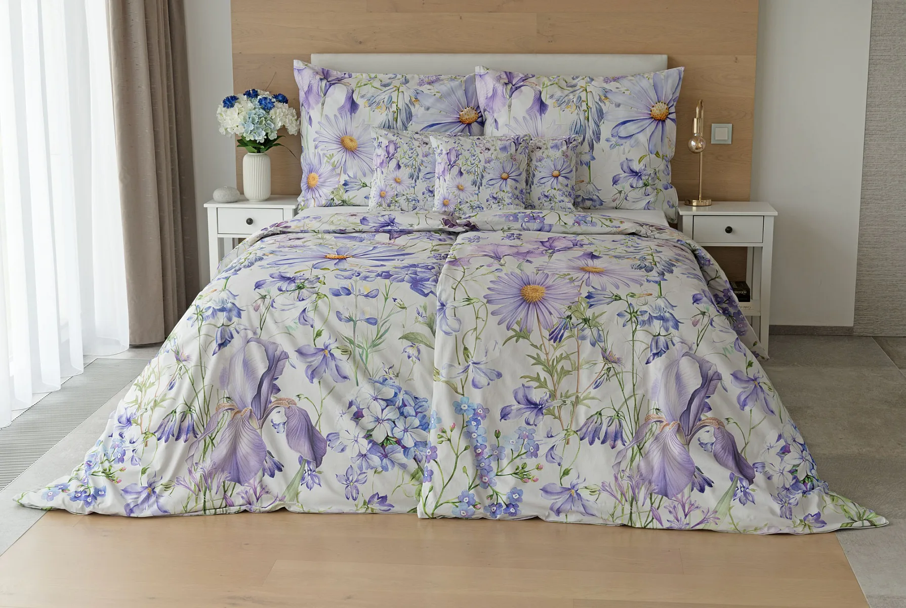 Okouzlující květinové povlečení Mirabel vnese do vaší ložnice nádech svěžesti. Květy kosatců, lučních zvonků, pomněnek i kopretin jsou v návrhu sladěny do atraktivní palety fialových a světle modrých tónů, které působí uklidňujícím a hřejivým dojmem. Díky nejmodernějšímu digitálnímu tisku vyniká florální motiv v precizním detailu.