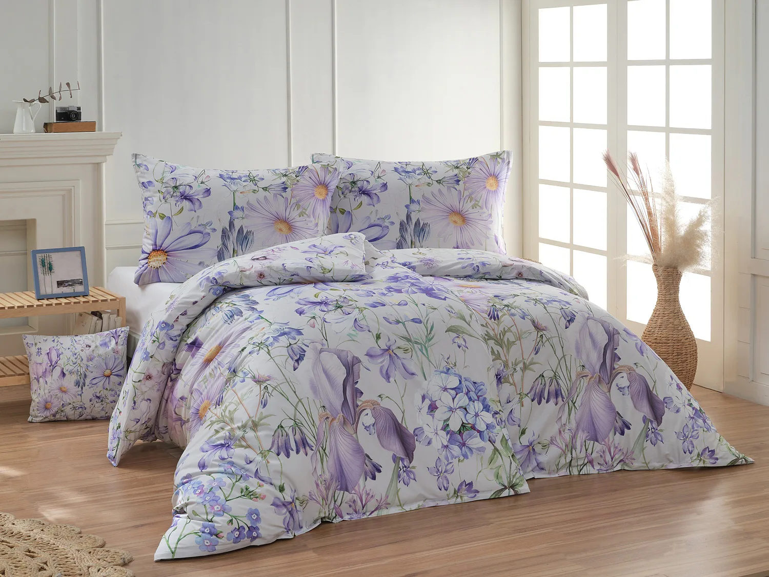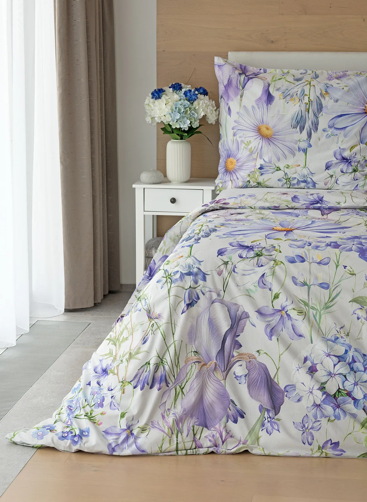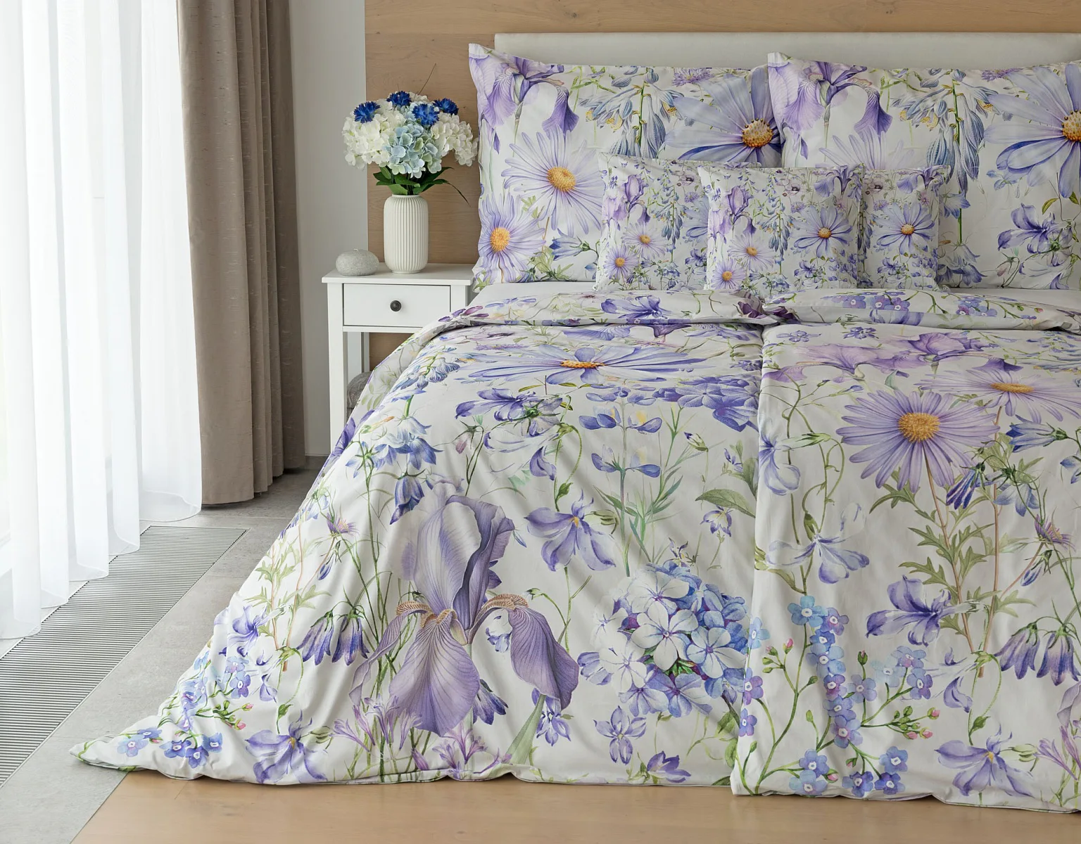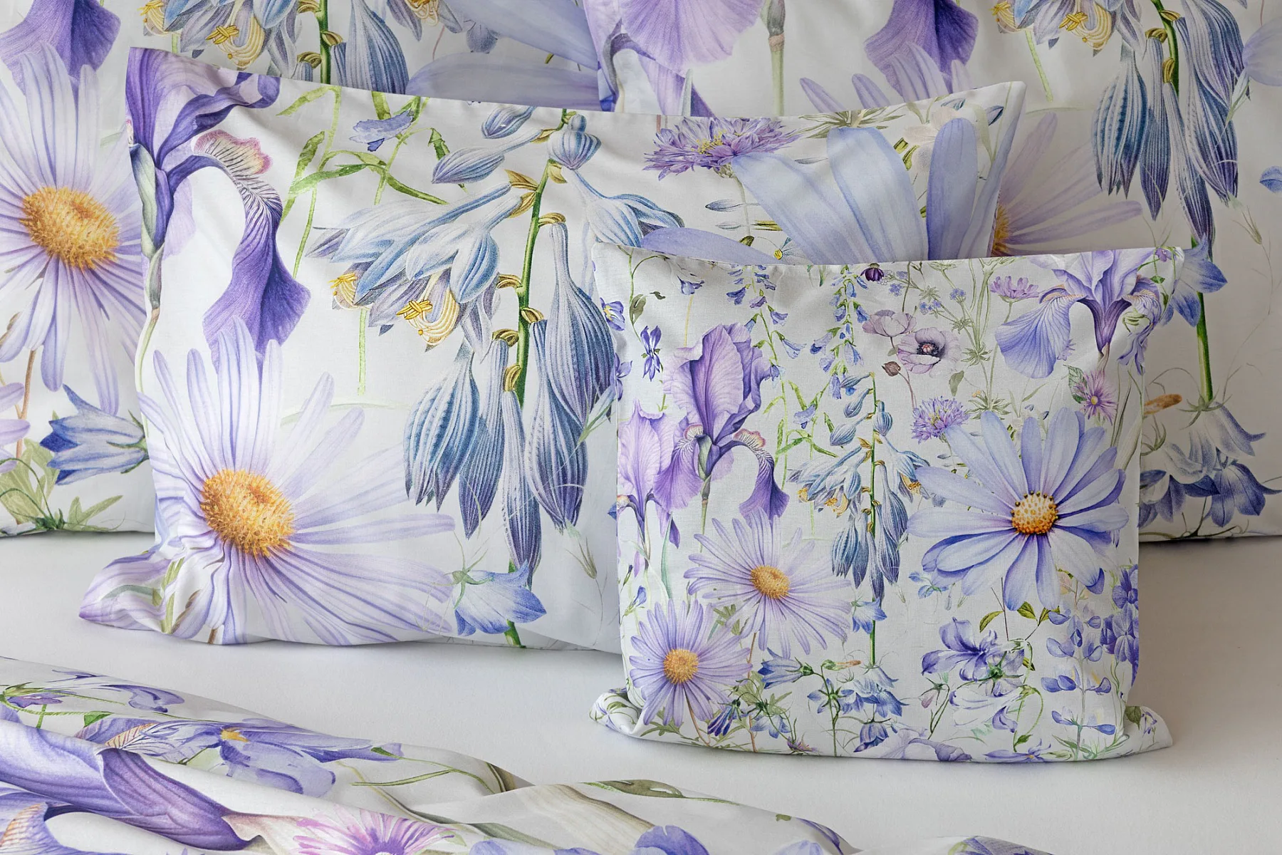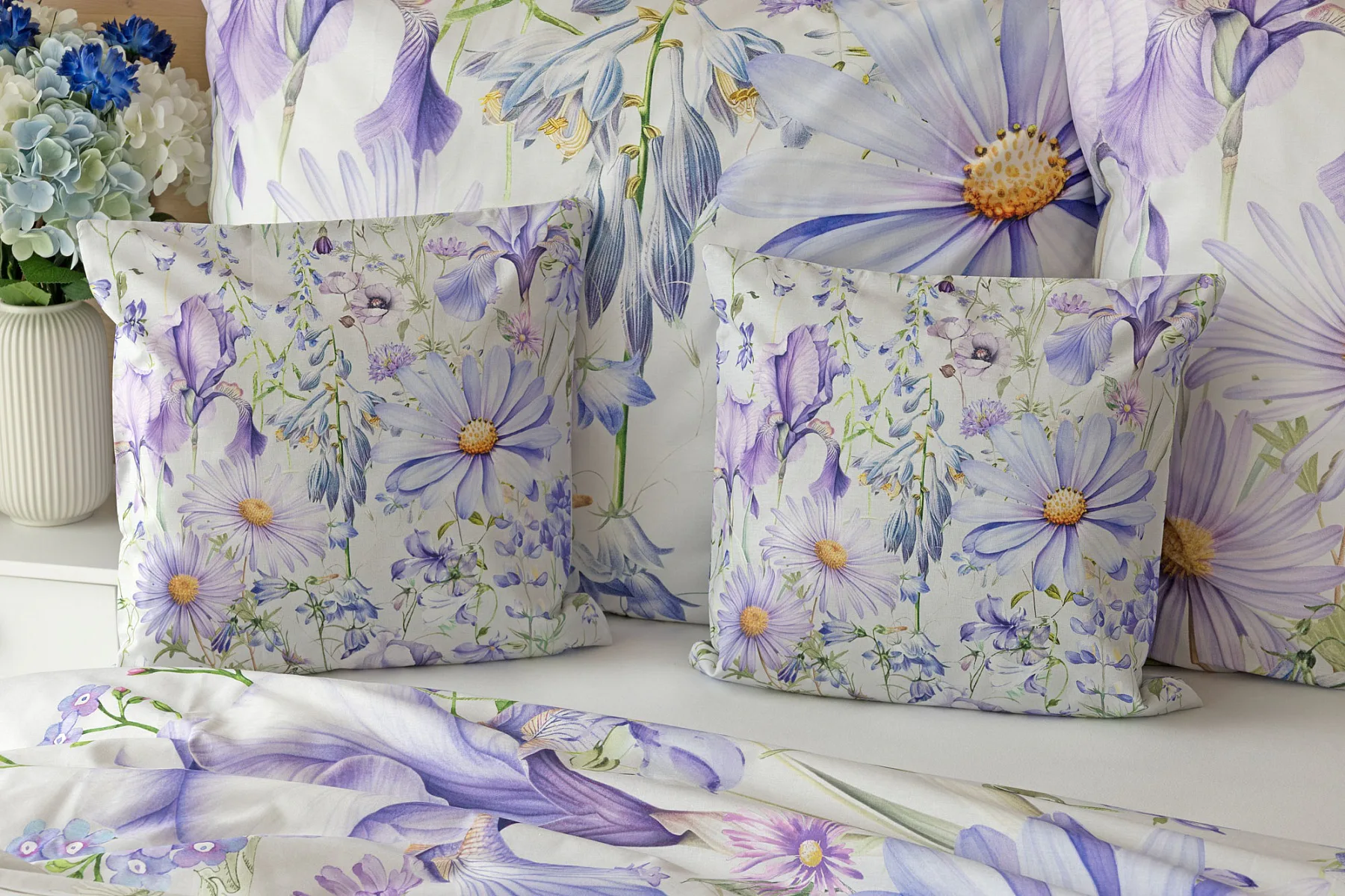 Okouzlující květinové povlečení Mirabel vnese do vaší ložnice nádech svěžesti. Květy kosatců, lučních zvonků, pomněnek i kopretin jsou v návrhu sladěny do atraktivní palety fialových a světle modrých tónů, které působí uklidňujícím a hřejivým dojmem. Díky nejmodernějšímu digitálnímu tisku vyniká florální motiv v precizním detailu.